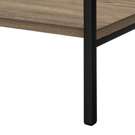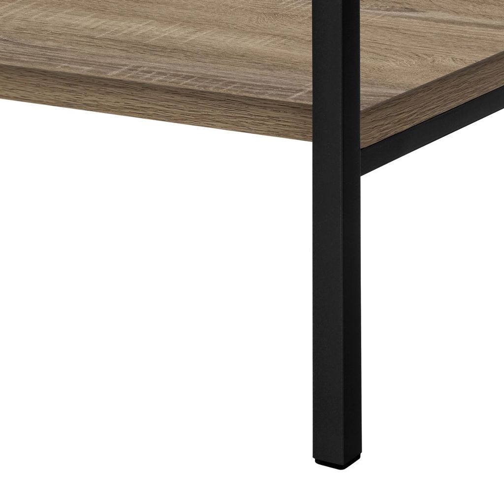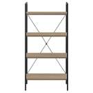 It has a metal frame that is reinforced by a metal crossbar across the open back. The shelves are crafted from engineered wood.