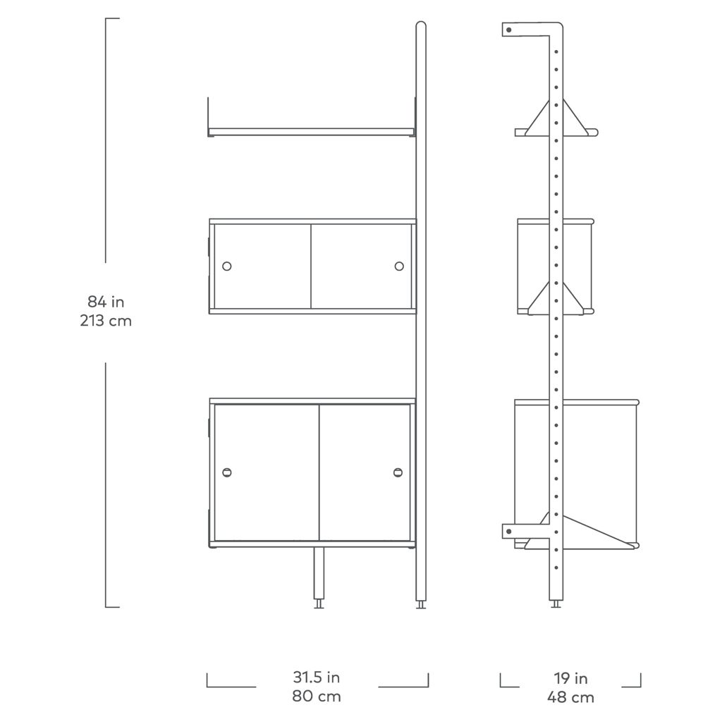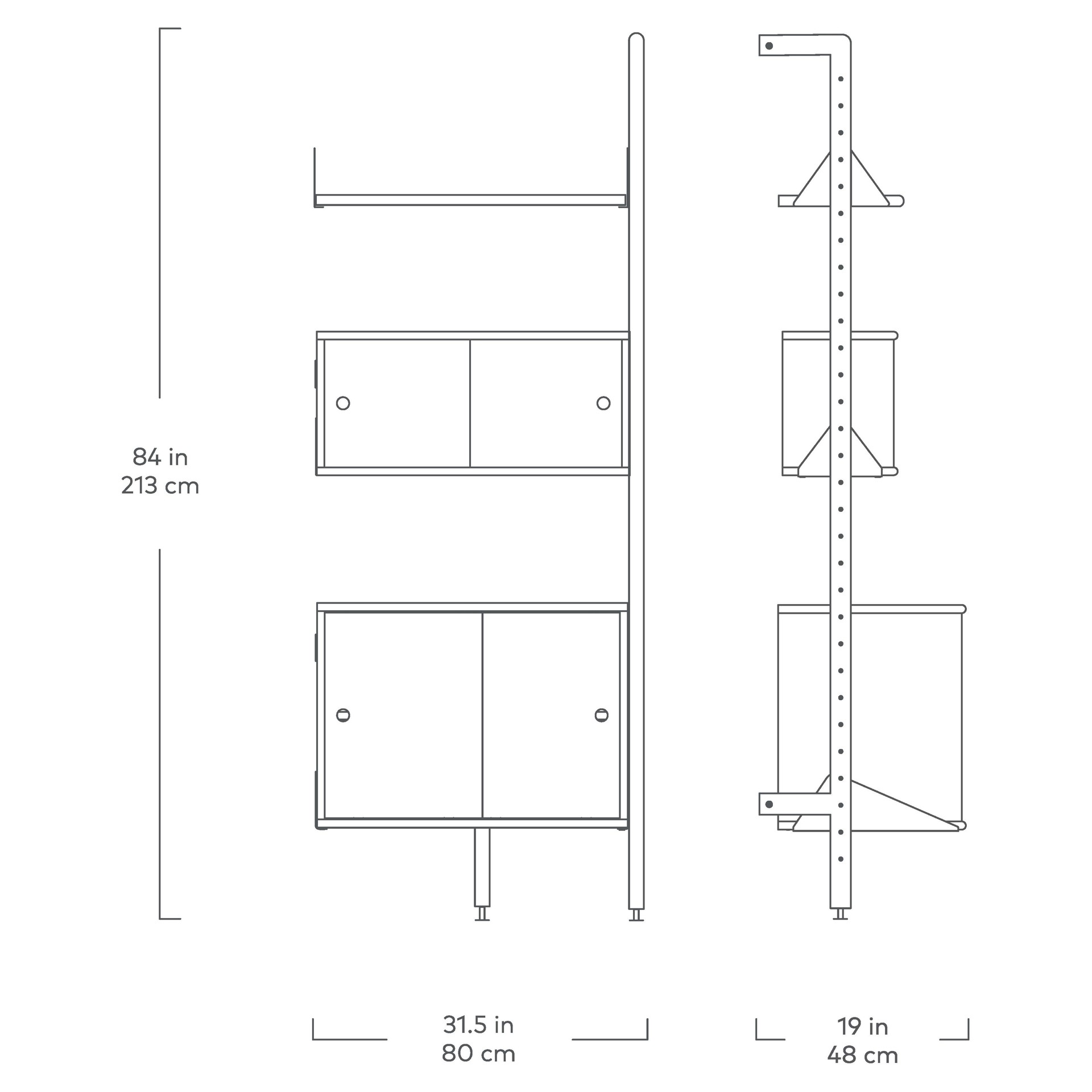 • Weight capacity: 50 lb per shelf or small cabinet, 75 lb per large cabinet, 250 lb per bay