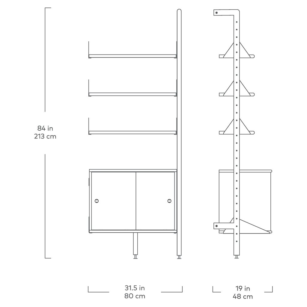 • Weight capacity: 50 lb per shelf or small cabinet, 75 lb per large cabinet, 250 lb per bay