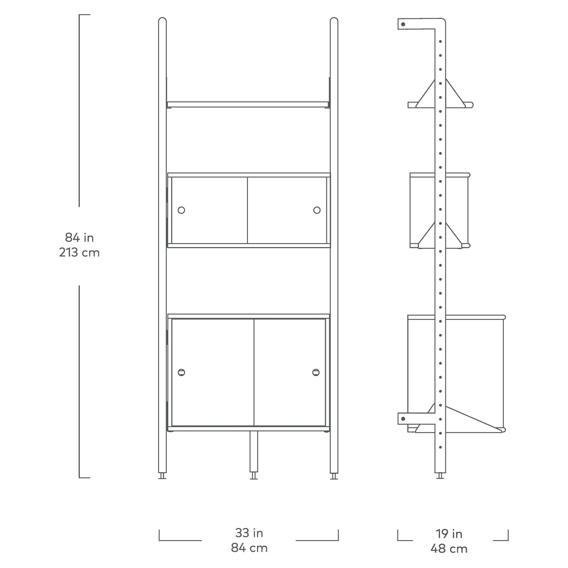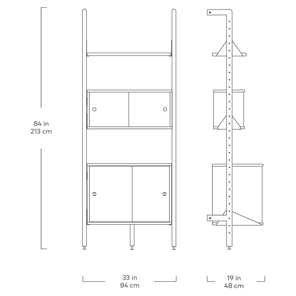 • Shelves and small cabinets are height-adjustable in 2.5" increments (not applicable to the large Branch cabinet). Large cabinets must be installed at the lowest level, where the central stability foot rests on the floor.