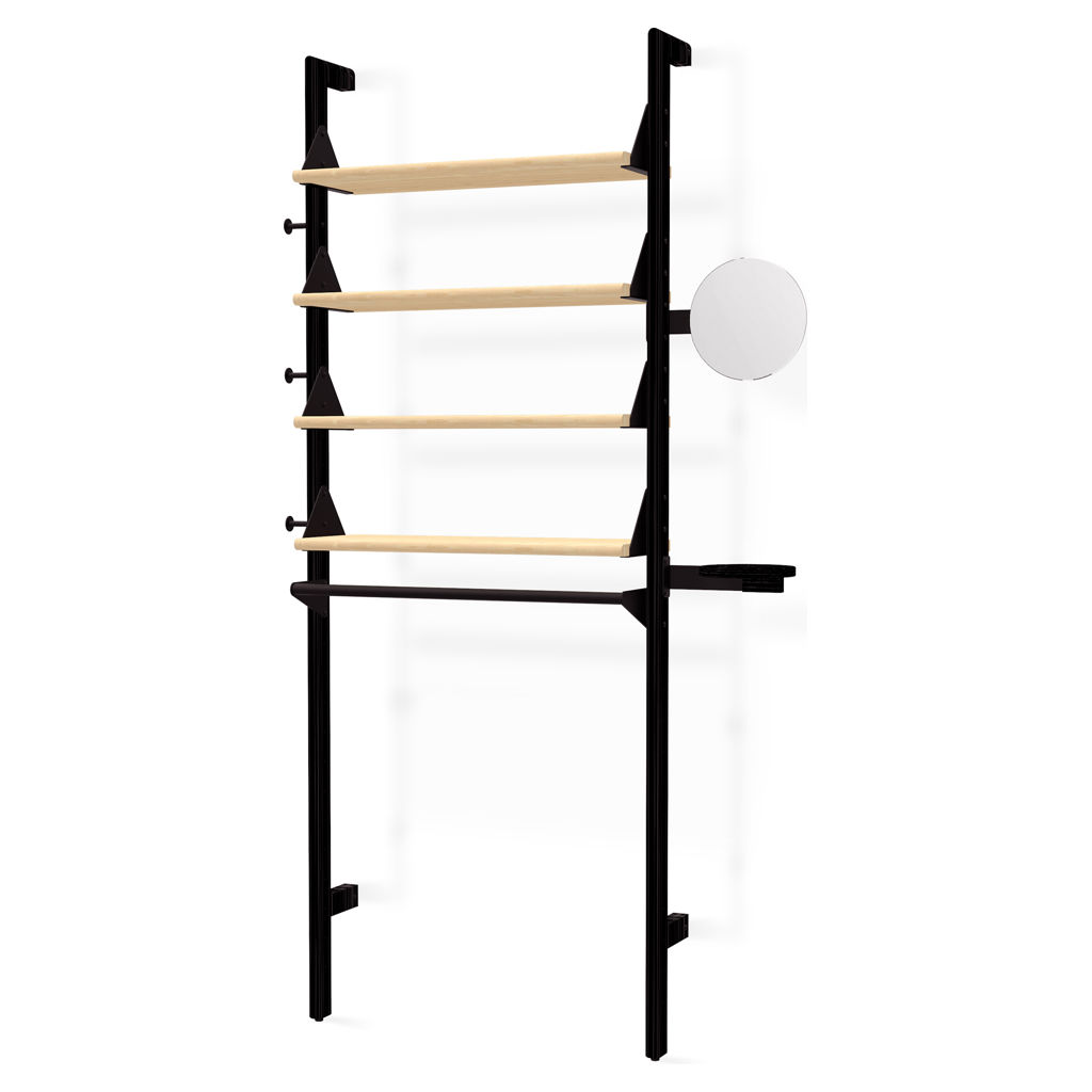• Consisting of : 2 branch uprights, 2 slatted shelves, 1 shelf, 1 hook rail, 1 side mirror, 1 side tray and a set of 3 single hooks.