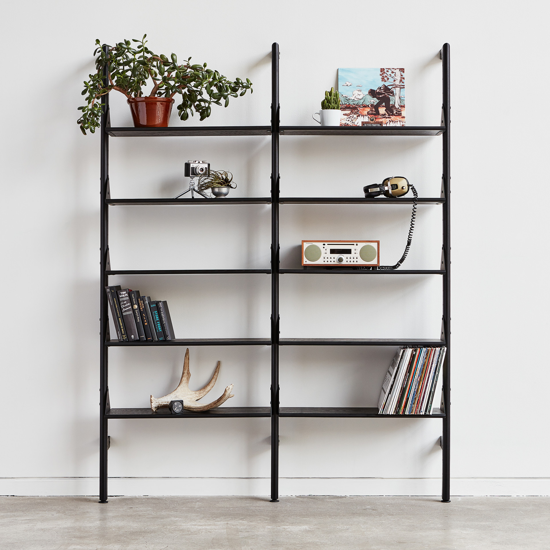Additional units allow you to customize the size and layout of your shelving system to perfectly suit your space, and the shelves are height-adjustable to suit any arrangement of decorative objects or resources. Refined details, such as the rounded edges of the shelves and uprights, soften Branch's aesthetic and enhance its architectural style.