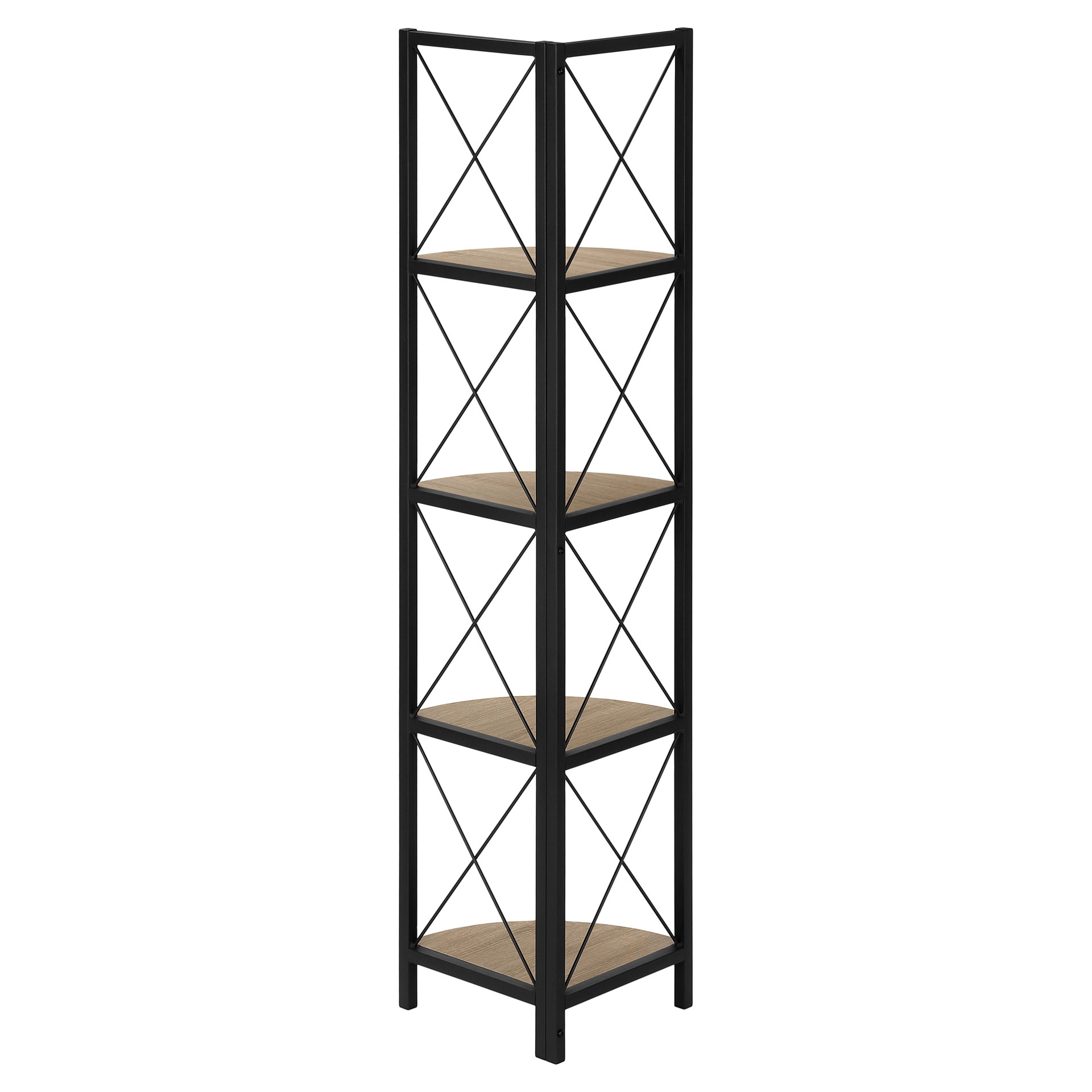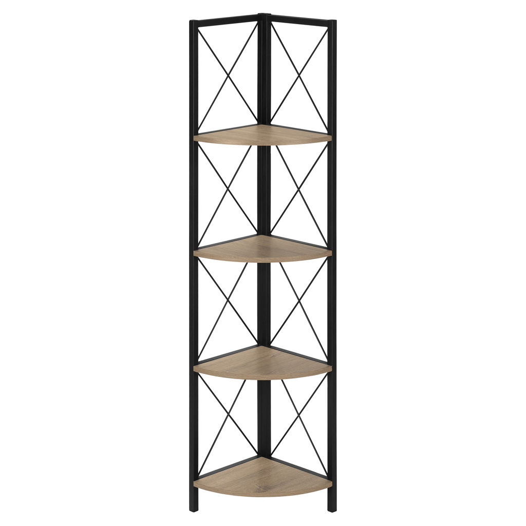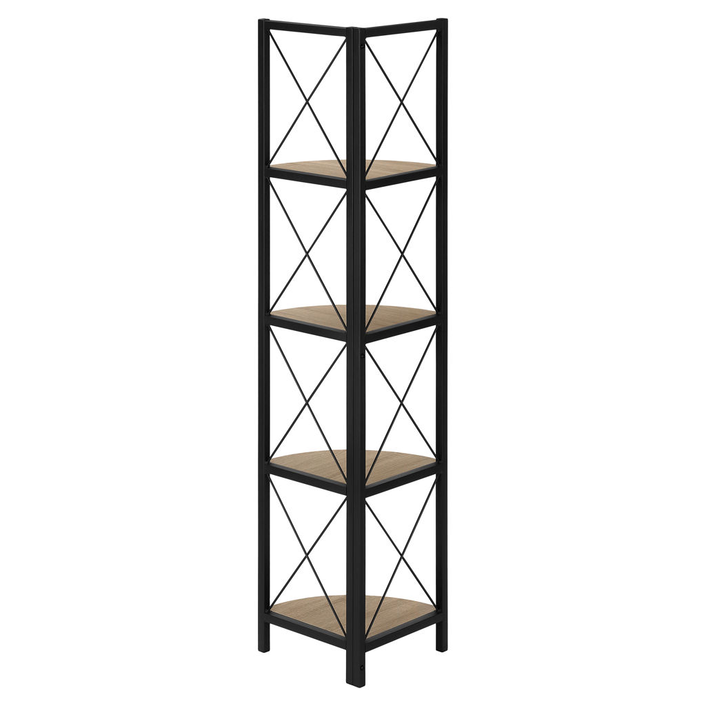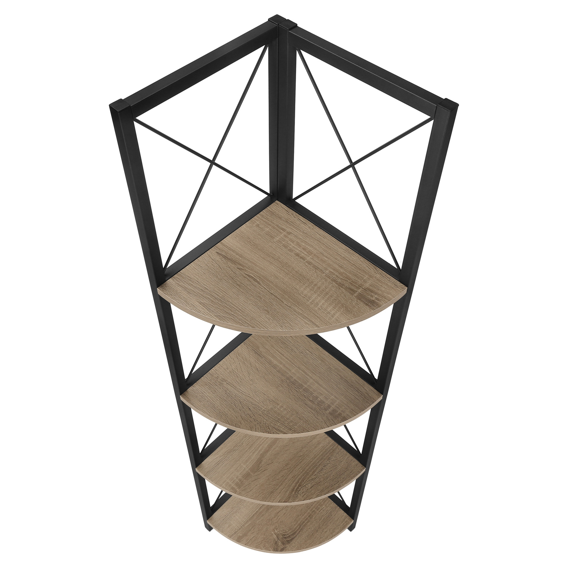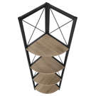 Perfect for photo frames, plants, decorative items and even kitchen accessories, this corner bookcase will enhance your decor. It features 4 shelves finished in dark taupe faux wood and a black metal frame with three legs. The frame is trimmed with an X design to add a modern touch to your room. This shelf will impress your guests. Assembly is required.