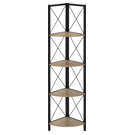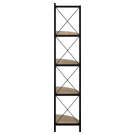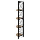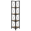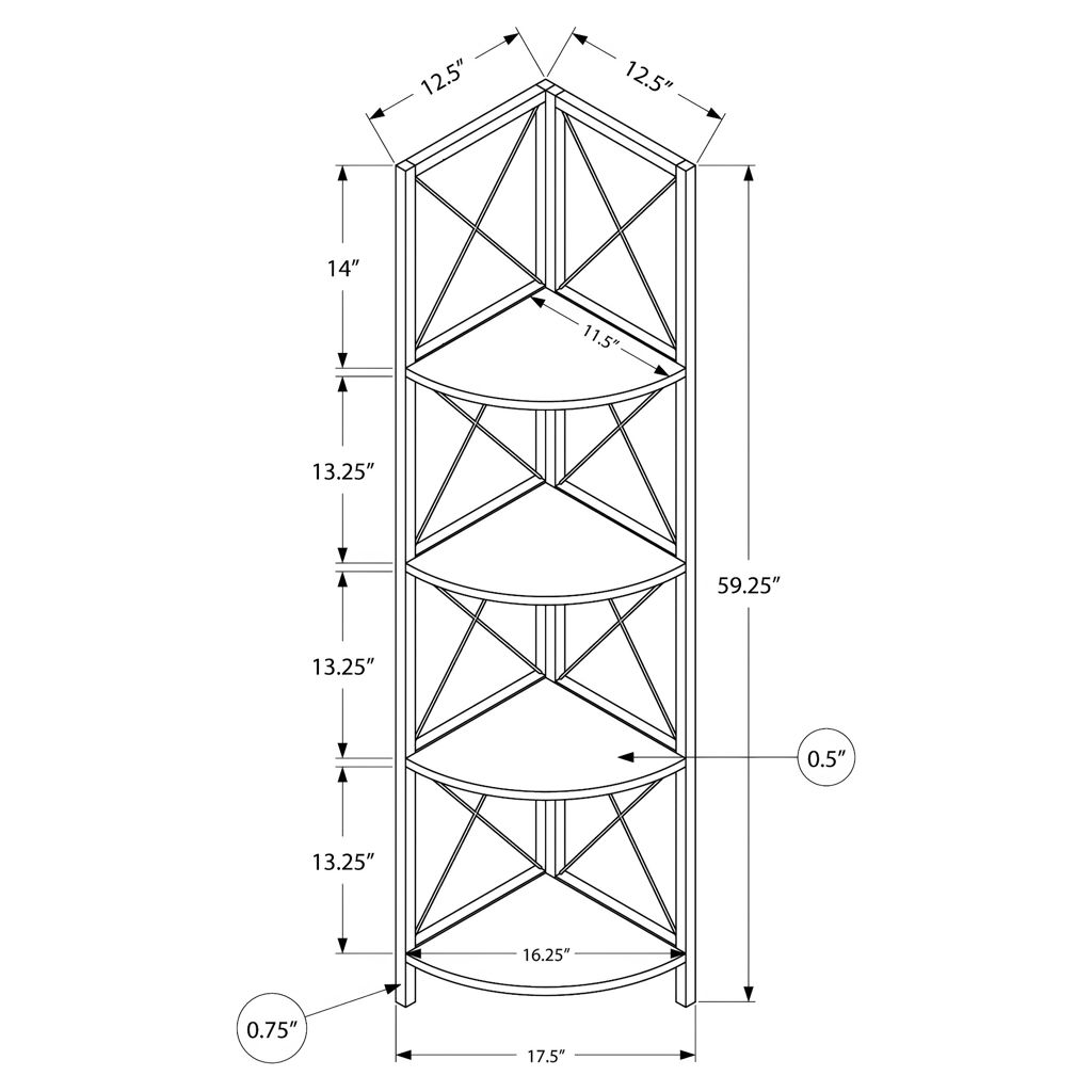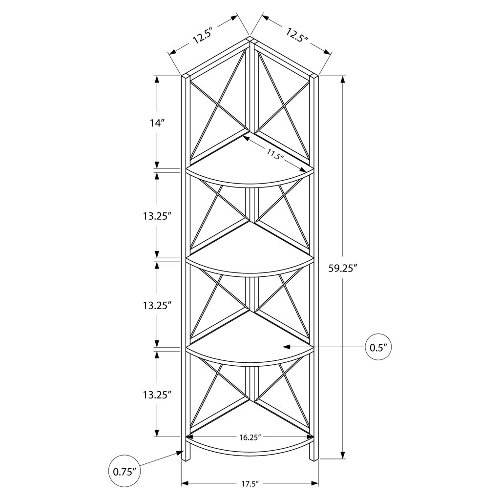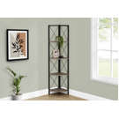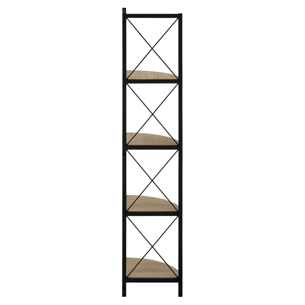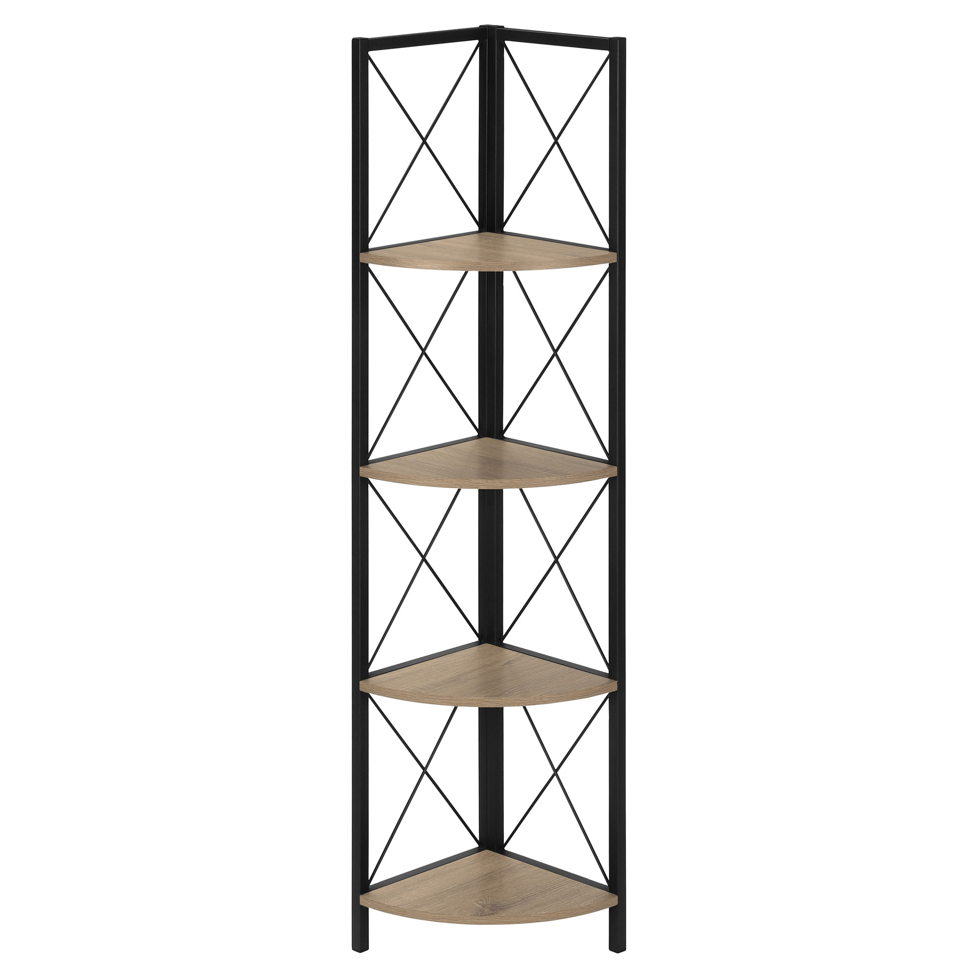 Perfect for photo frames, plants, decorative items and even kitchen accessories, this corner bookcase will enhance your decor. It features 4 shelves finished in dark taupe faux wood and a black metal frame with three legs. The frame is trimmed with an X design to add a modern touch to your room. This shelf will impress your guests. Assembly is required.