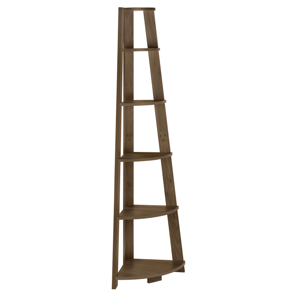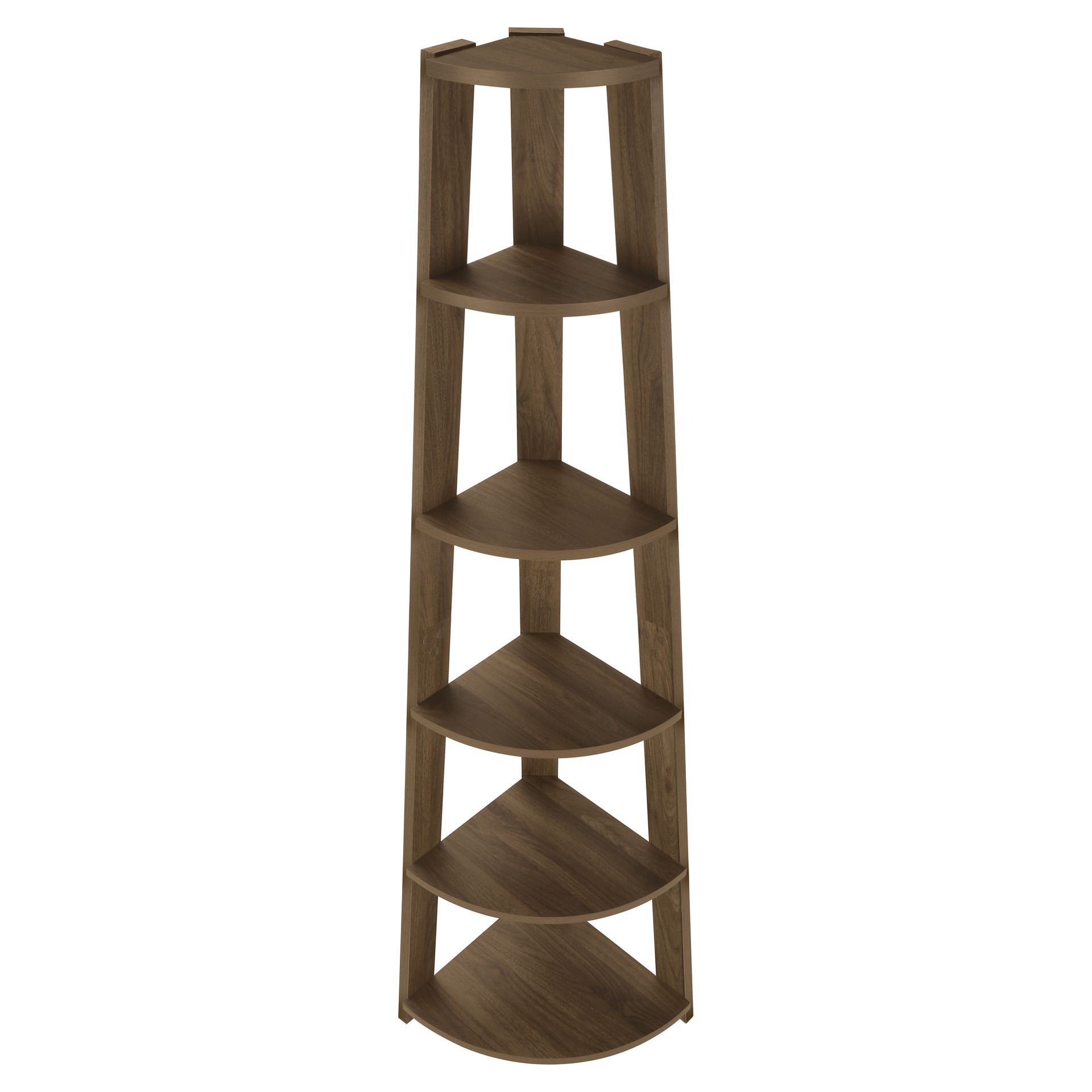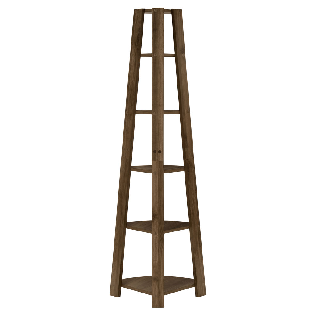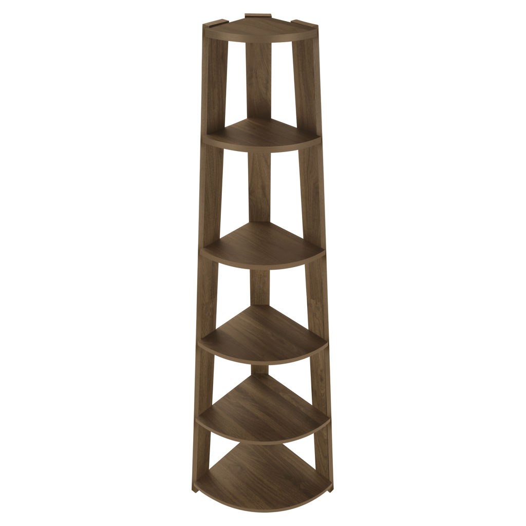 Set up this bookshelf with ease and let it take care of your space. Enjoy a bookcase that fits nicely in your living room, office or bedroom, allowing you to use it for books and any type of decor. For a place that is often hard to maximize - the corner - is no longer a problem with this modern dark walnut wood-look furniture that will certainly help you utilize all the available space with 5 shelves. Three sturdy legs ensure the structural integrity of this corner shelf. Anti-tilt hardware is included for added stability.