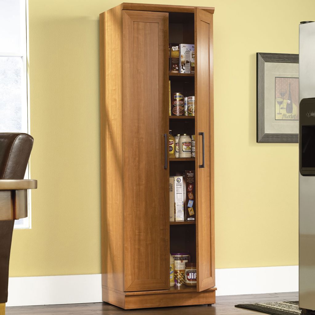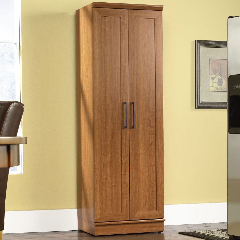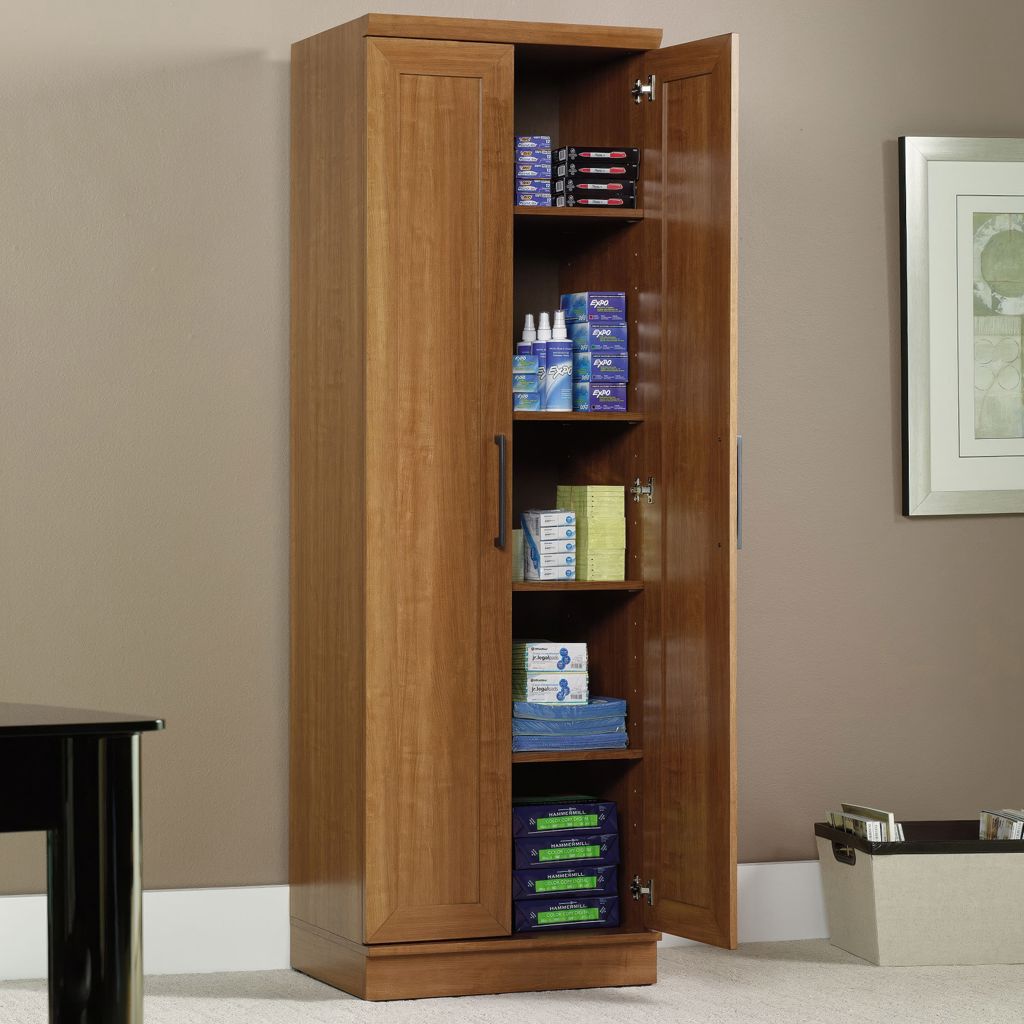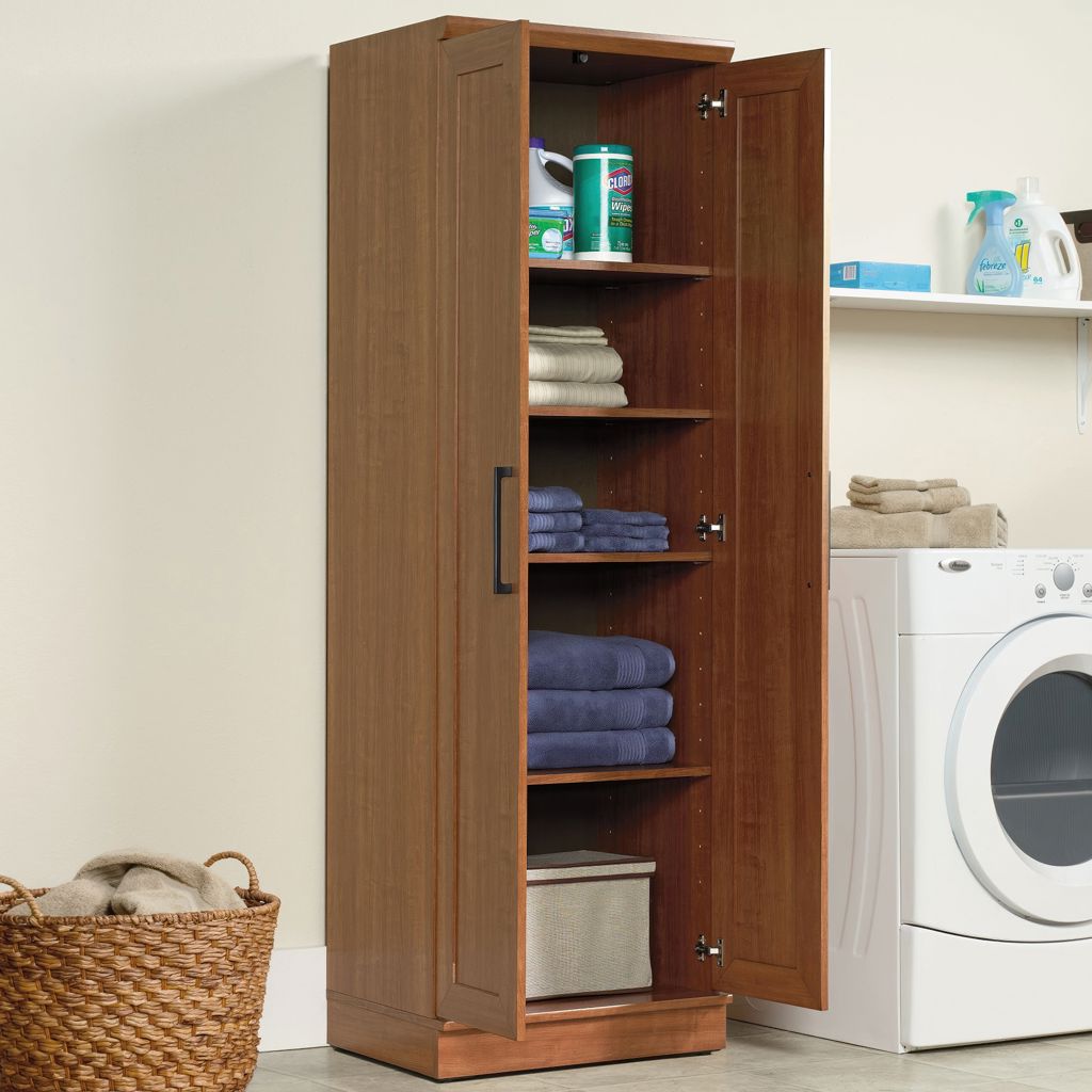 Contain crafting clutter and the chaos of collectibles with this storage cabinet from the HomePlus collection. Behind the framed panel doors of this narrow storage cabinet are four adjustable shelves to store anything from pantry food to fluffy bathroom towels.