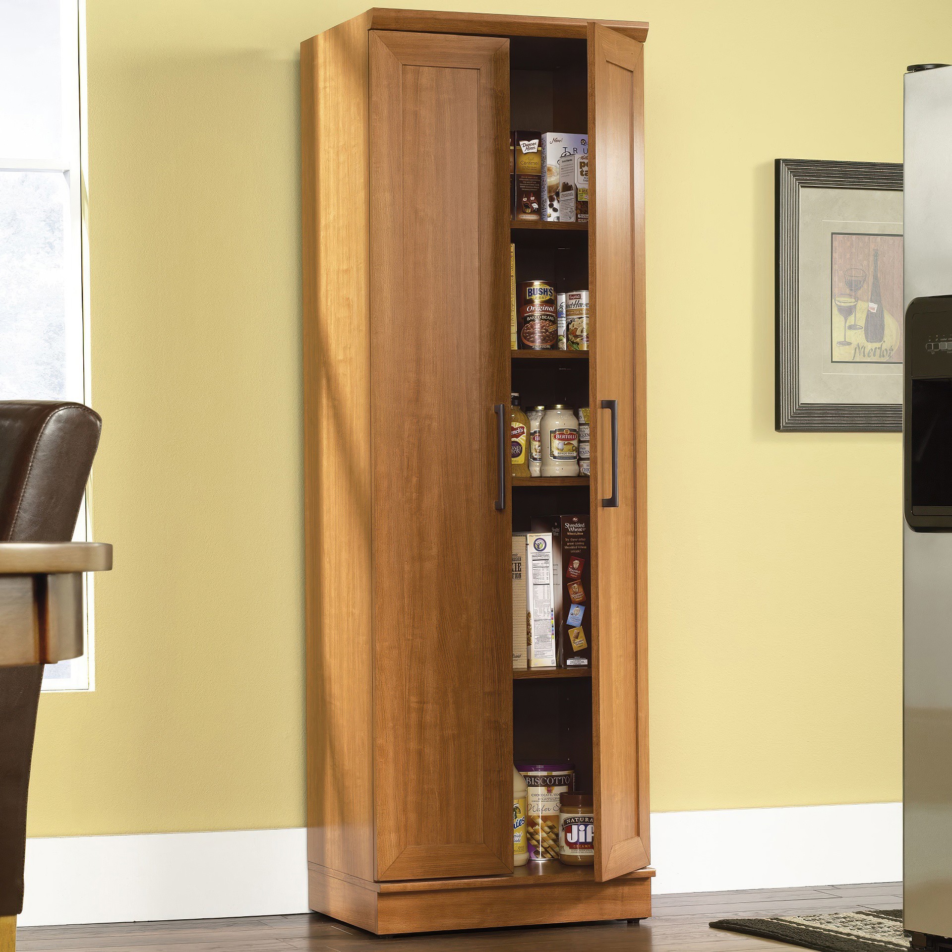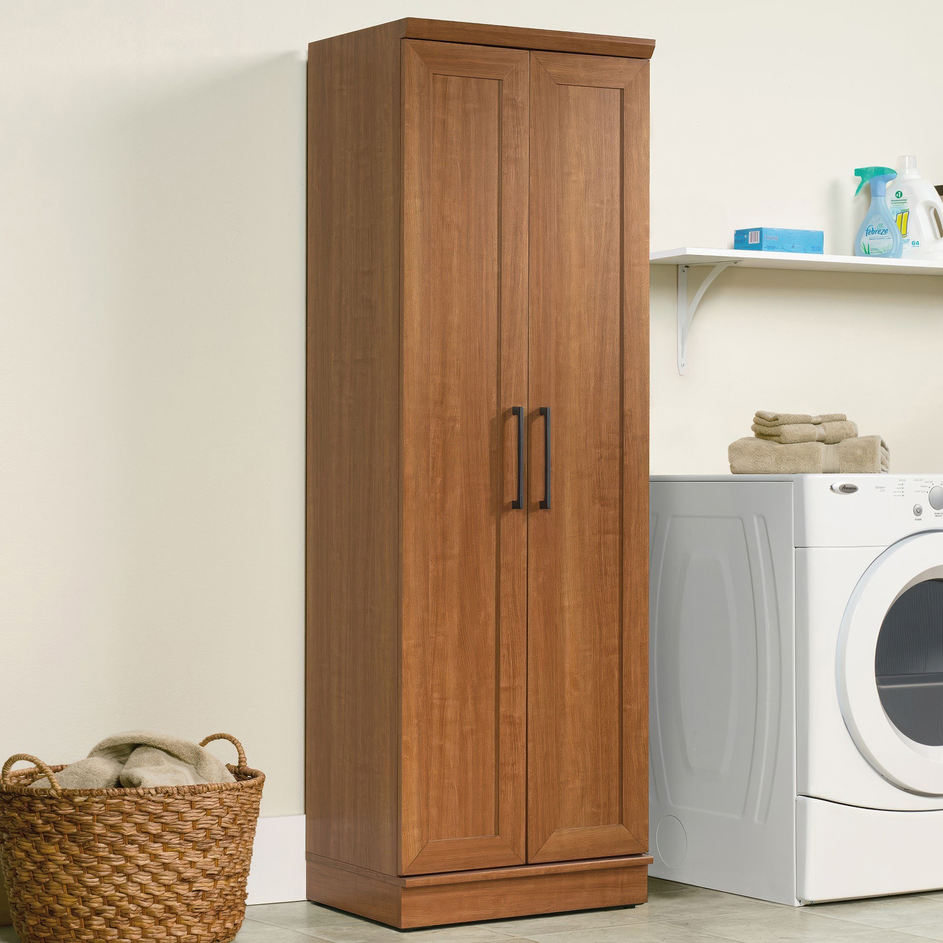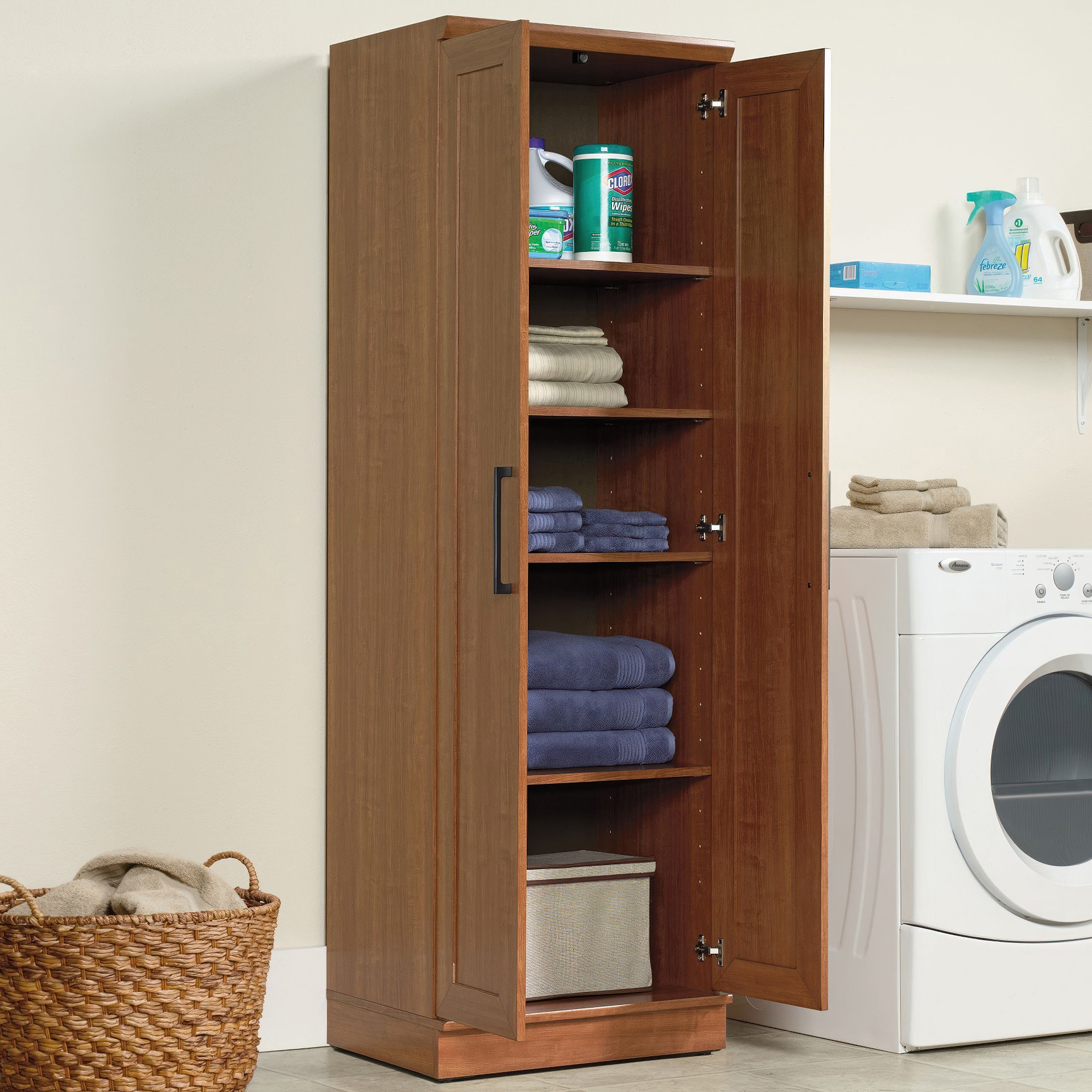 Contain crafting clutter and the chaos of collectibles with this storage cabinet from the HomePlus collection. Behind the framed panel doors of this narrow storage cabinet are four adjustable shelves to store anything from pantry food to fluffy bathroom towels.