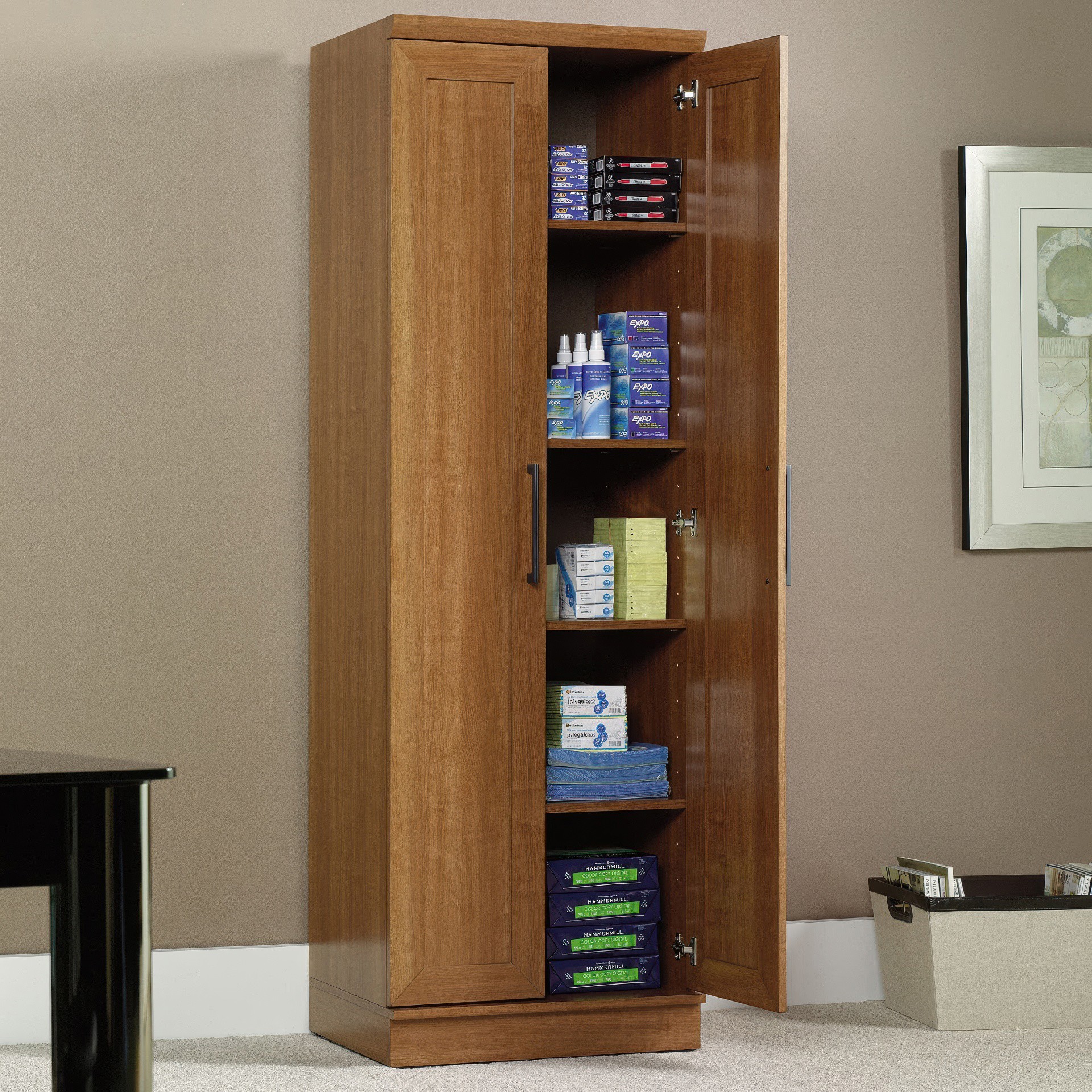 This 2-door storage cabinet features adjustable base levelers to ensure your unit is level, even if the floors are not. Finished in Sienna Oak®, this engineered wood storage cabinet adds style and functionally to the home office or the laundry room.