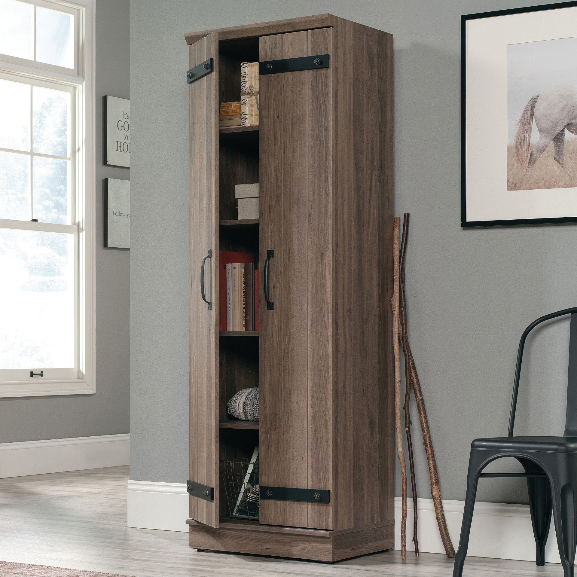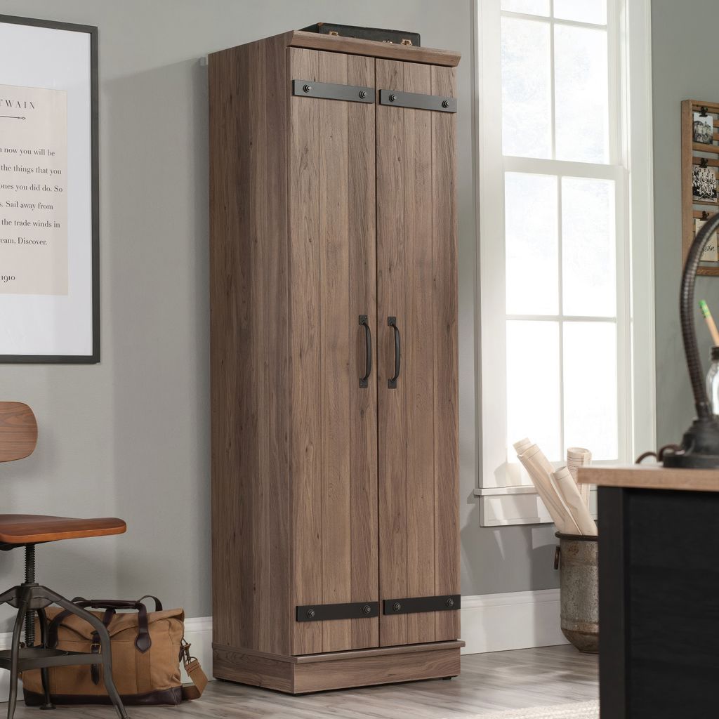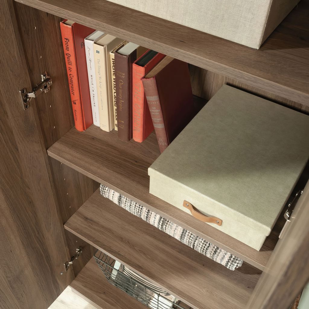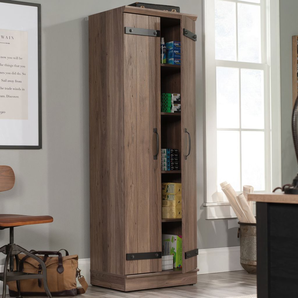 Contain the clutter and chaos of your home with this 2-door storage cabinet from the HomePlus collection. This storage cabinet with doors features four adjustable shelves behind its planked style barn doors to store anything from pantry staples like cans of food, cereal boxes, and pasta, to linens and toys.