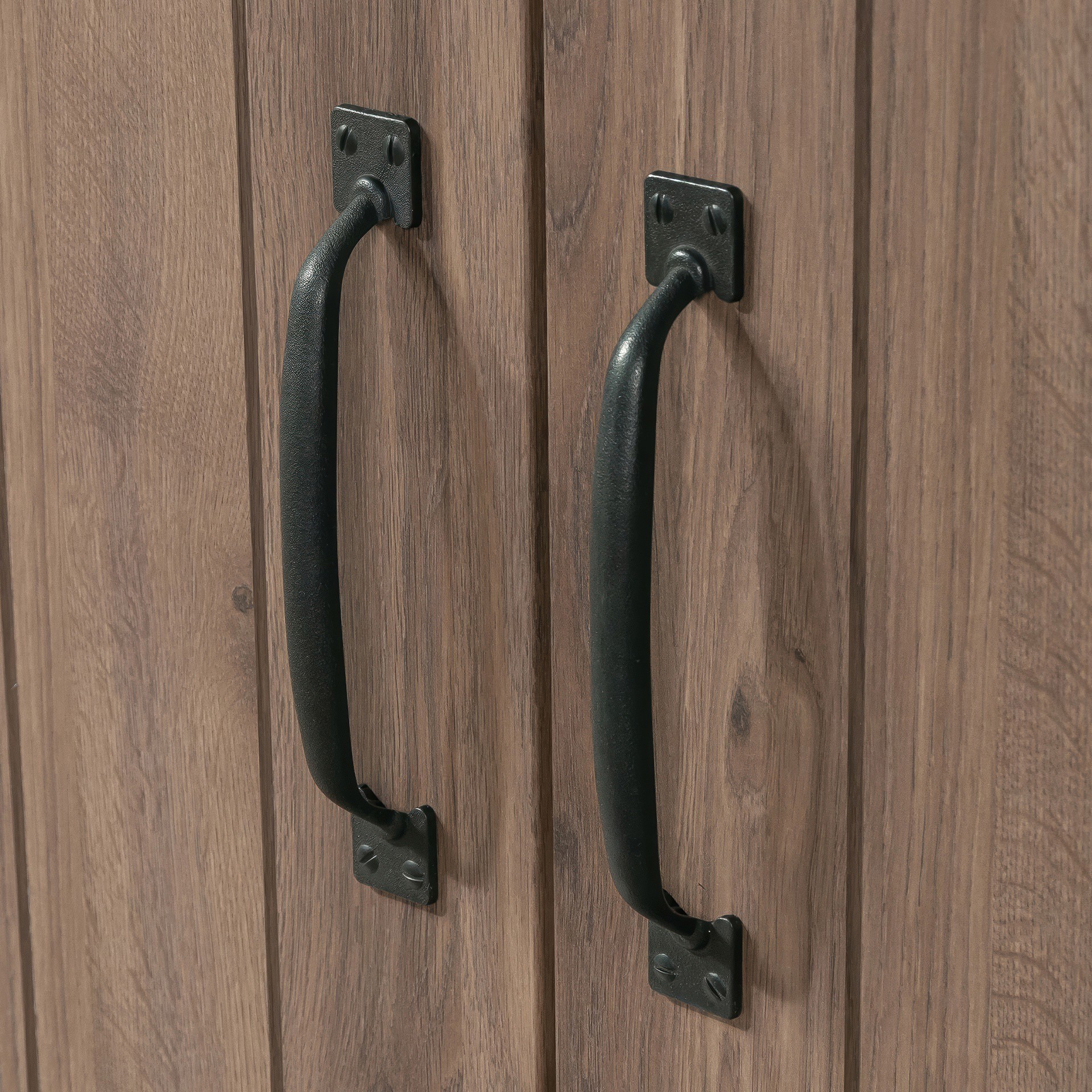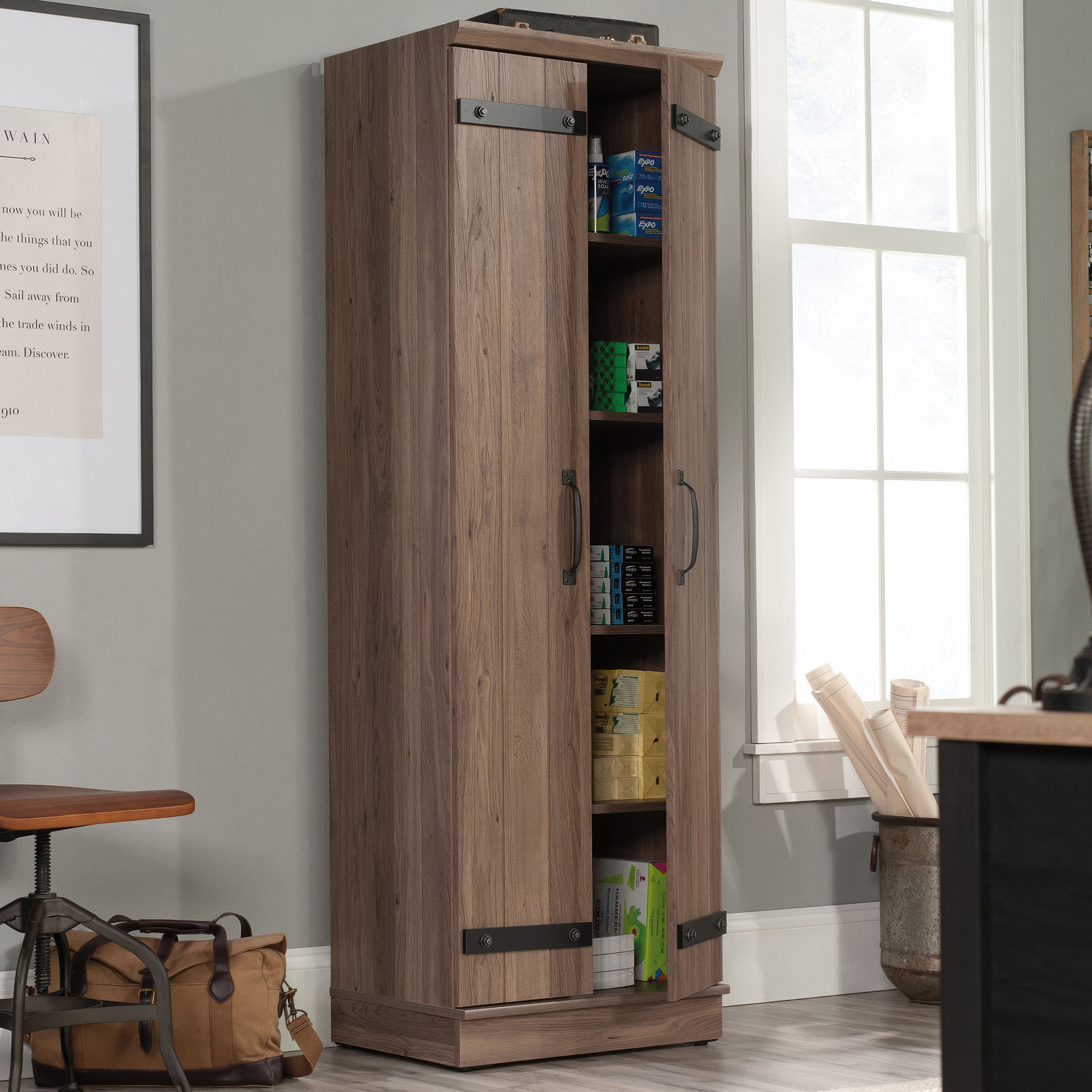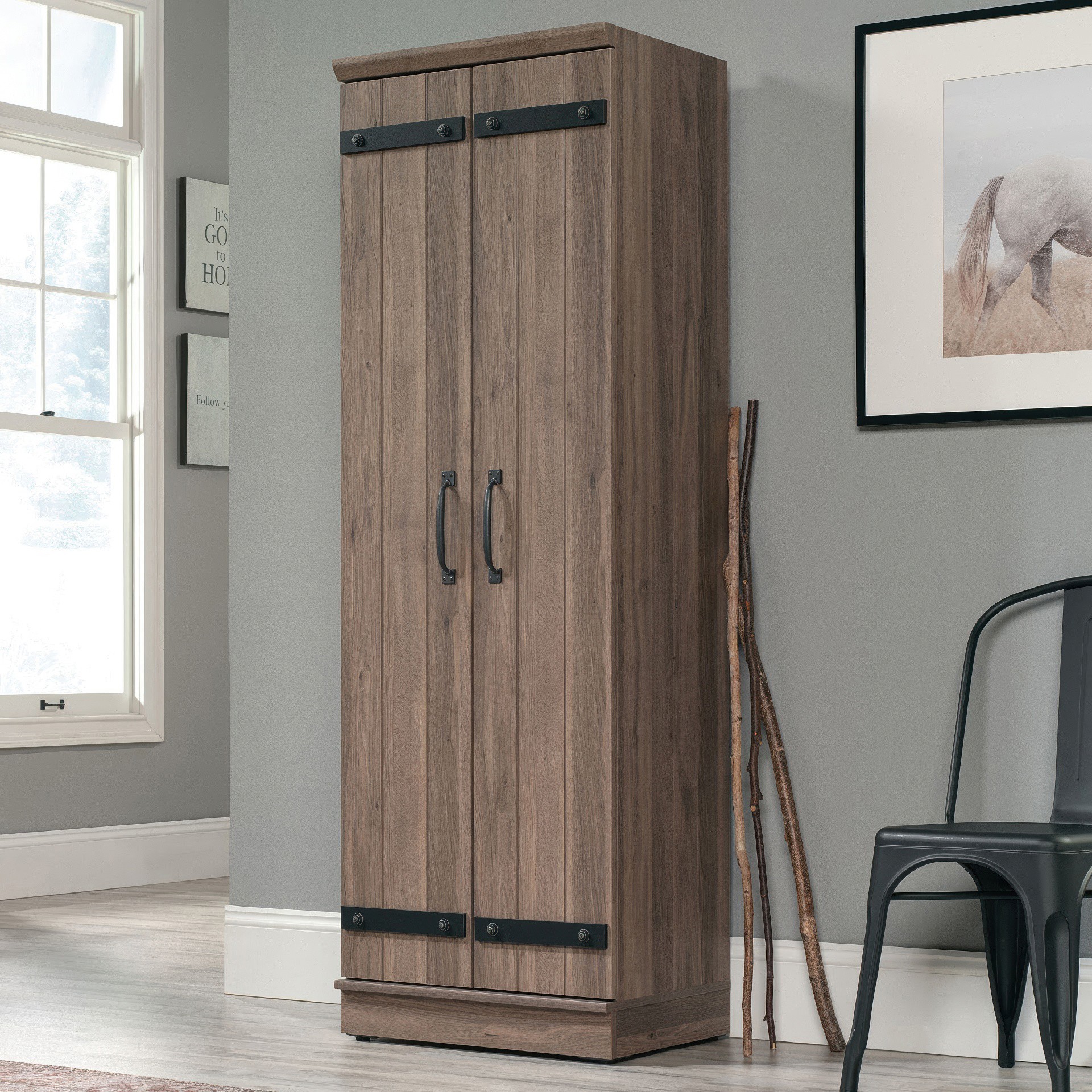 Contain the clutter and chaos of your home with this 2-door storage cabinet from the HomePlus collection. This storage cabinet with doors features four adjustable shelves behind its planked style barn doors to store anything from pantry staples like cans of food, cereal boxes, and pasta, to linens and toys.