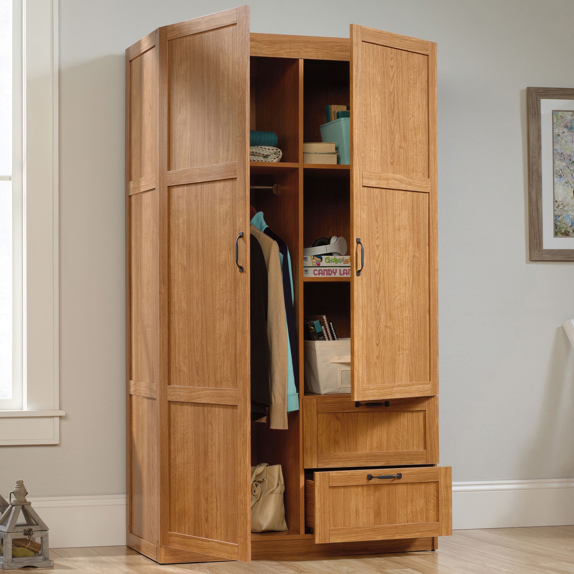 This clothing armoire features a bedroom storage solution behind a full-length door that includes a garment rod and fixed shelf for storing your jackets, sweaters, dress pants, and more.