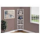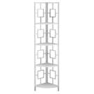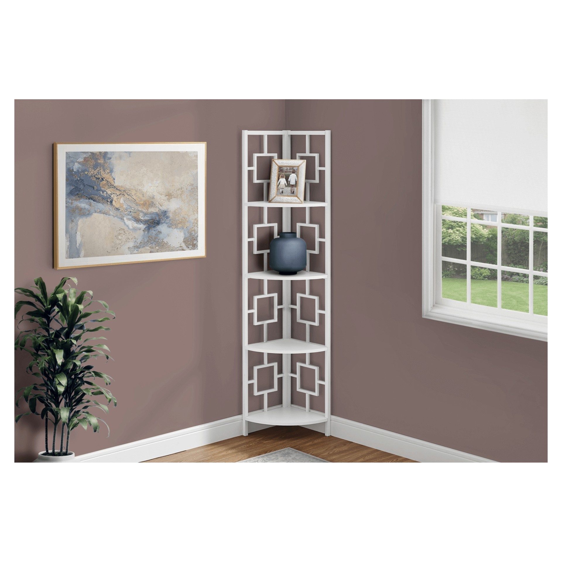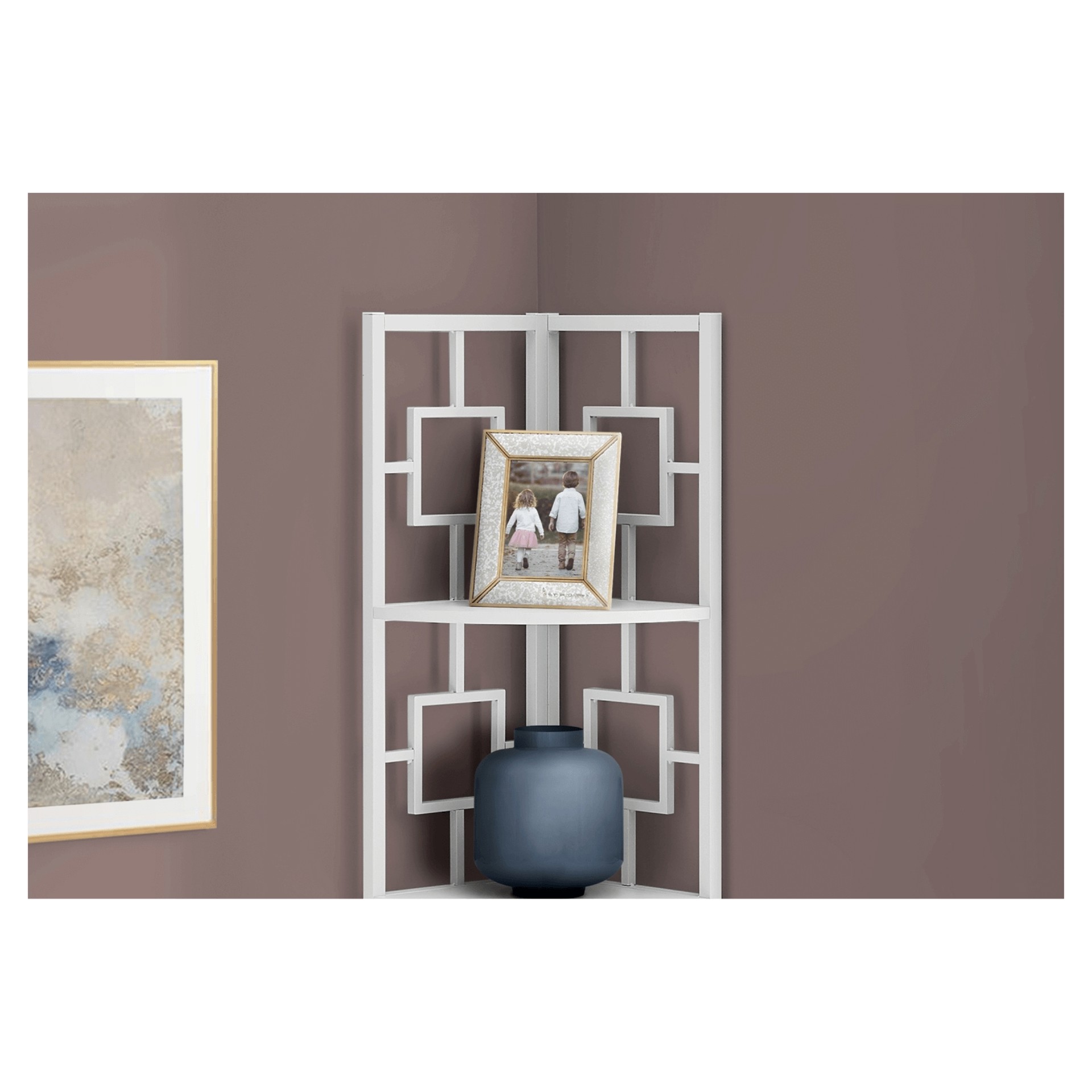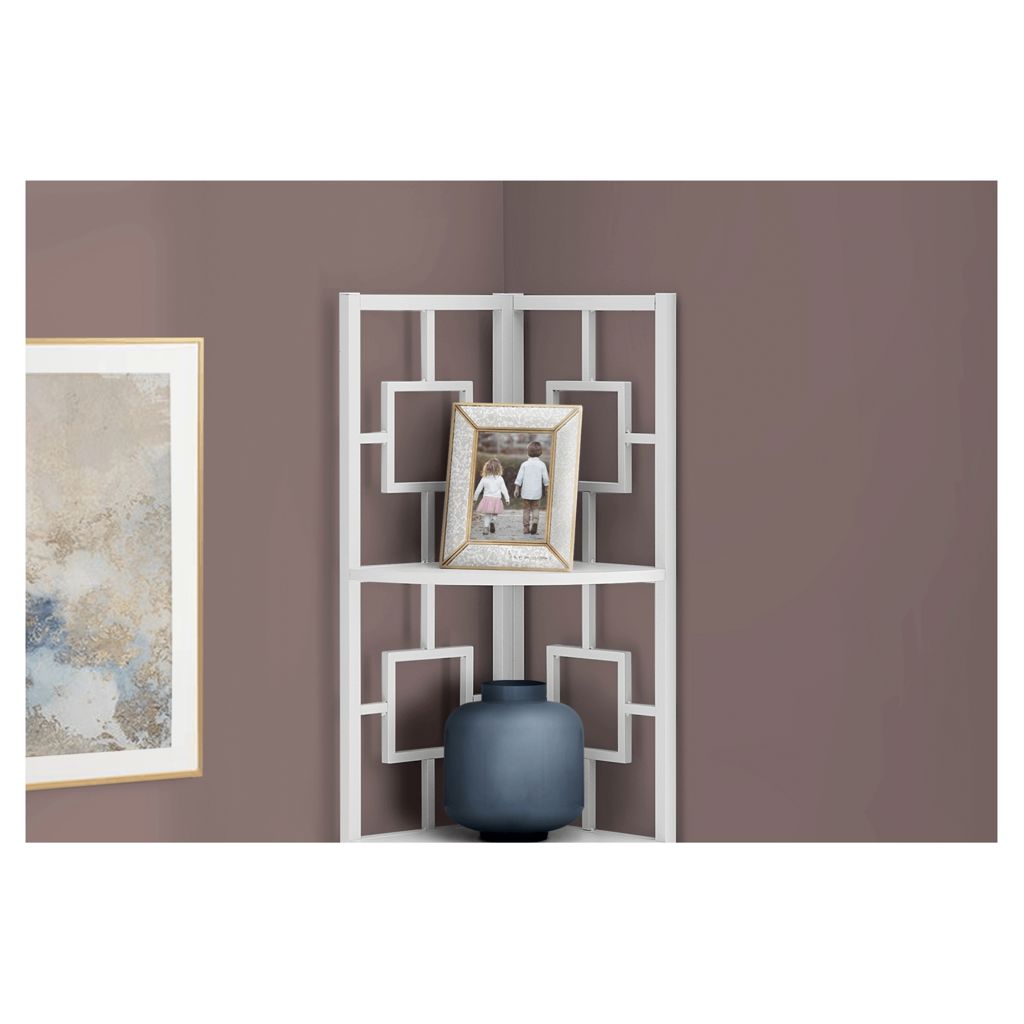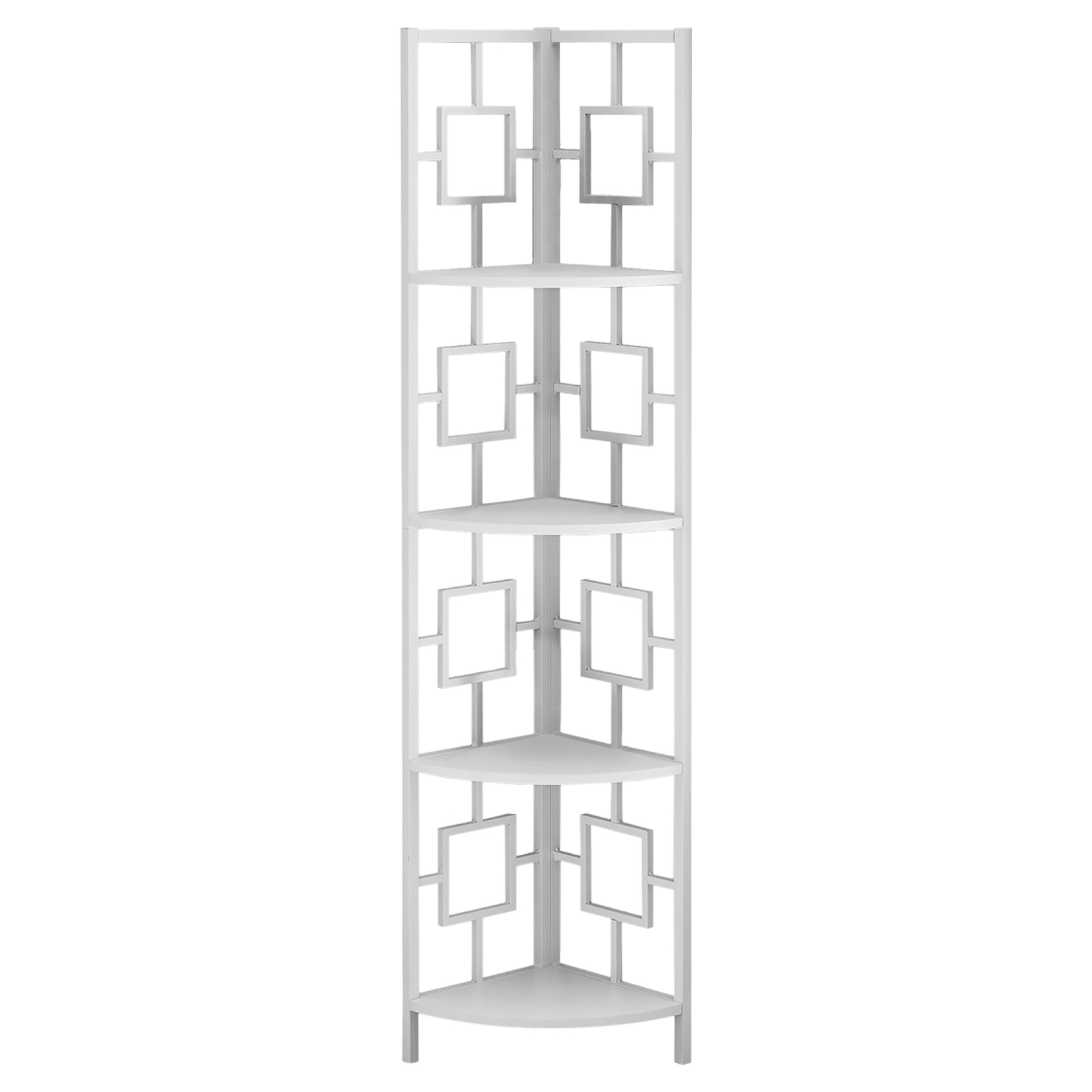 Including 4 solid white display shelves, this corner display unit features a three-leg white metal frame and a square transitional design that will add modern flair wherever you choose to place it. This corner bookcase is sure to impress.