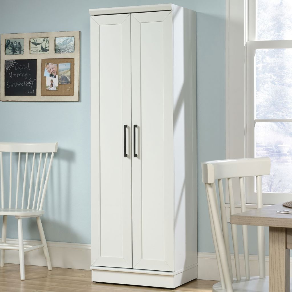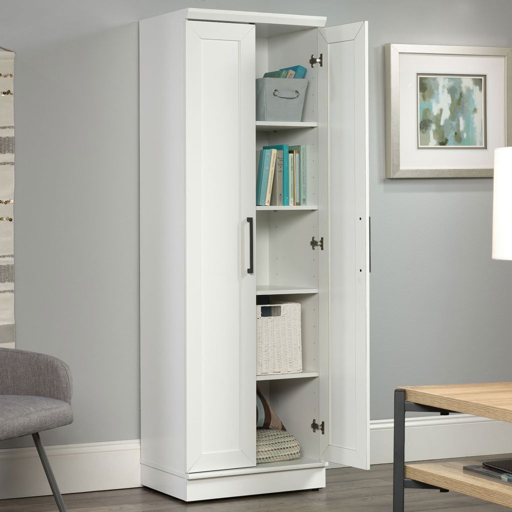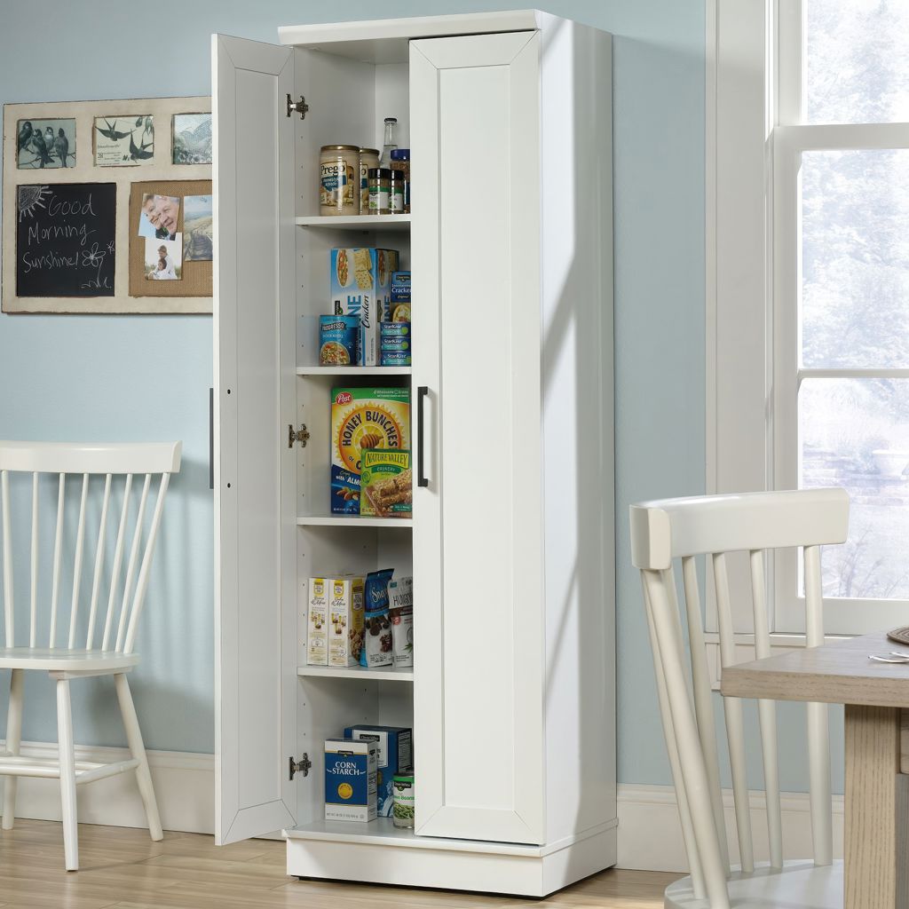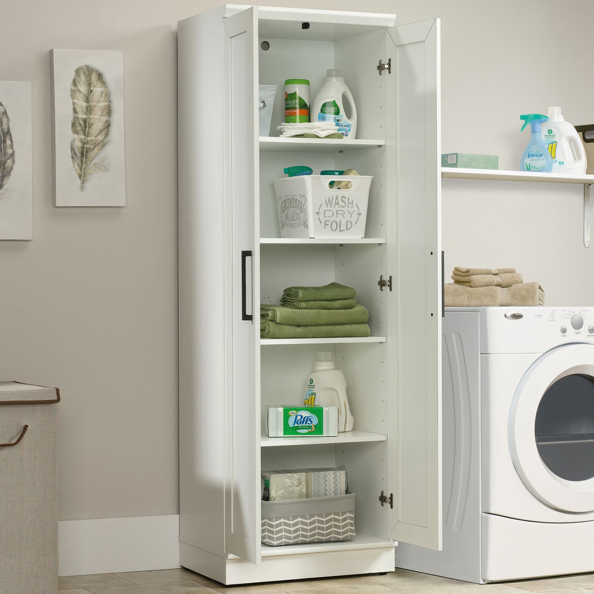 Behind the framed panel doors of this narrow storage cabinet are four adjustable shelves to store anything from pantry food to fluffy bathroom towels.