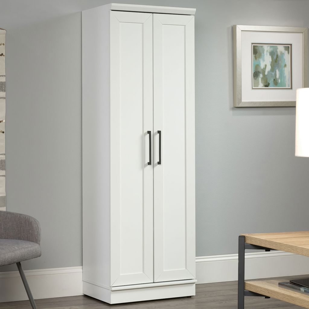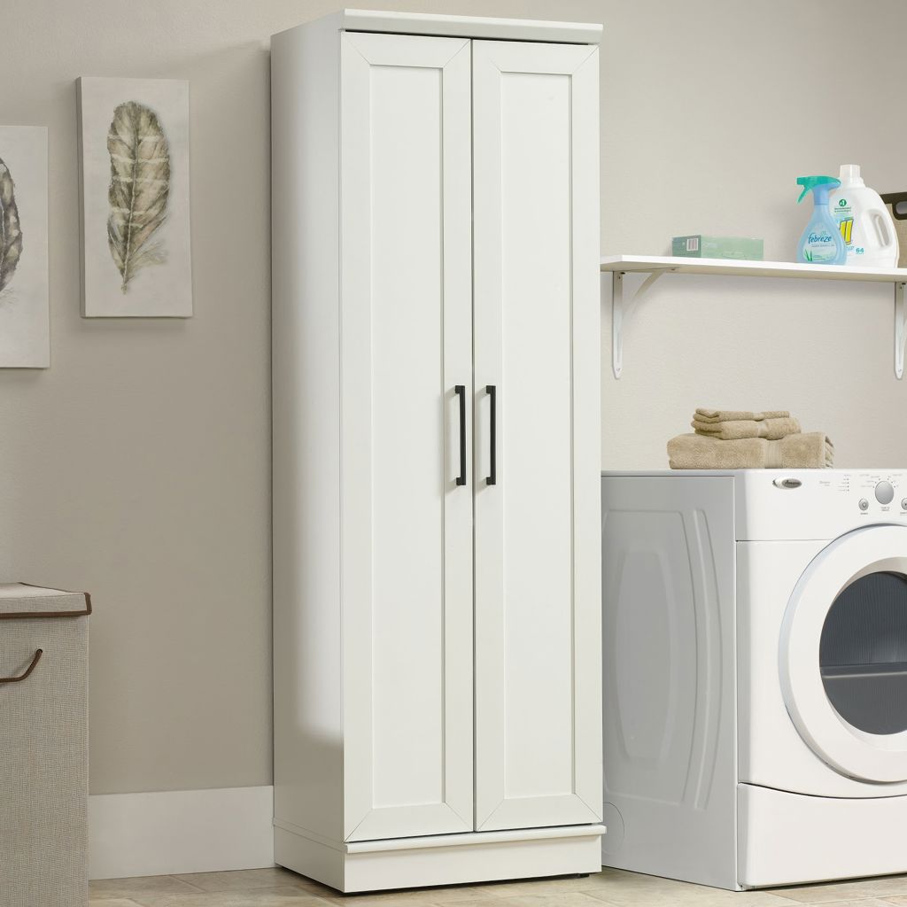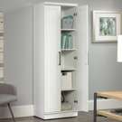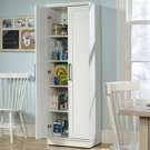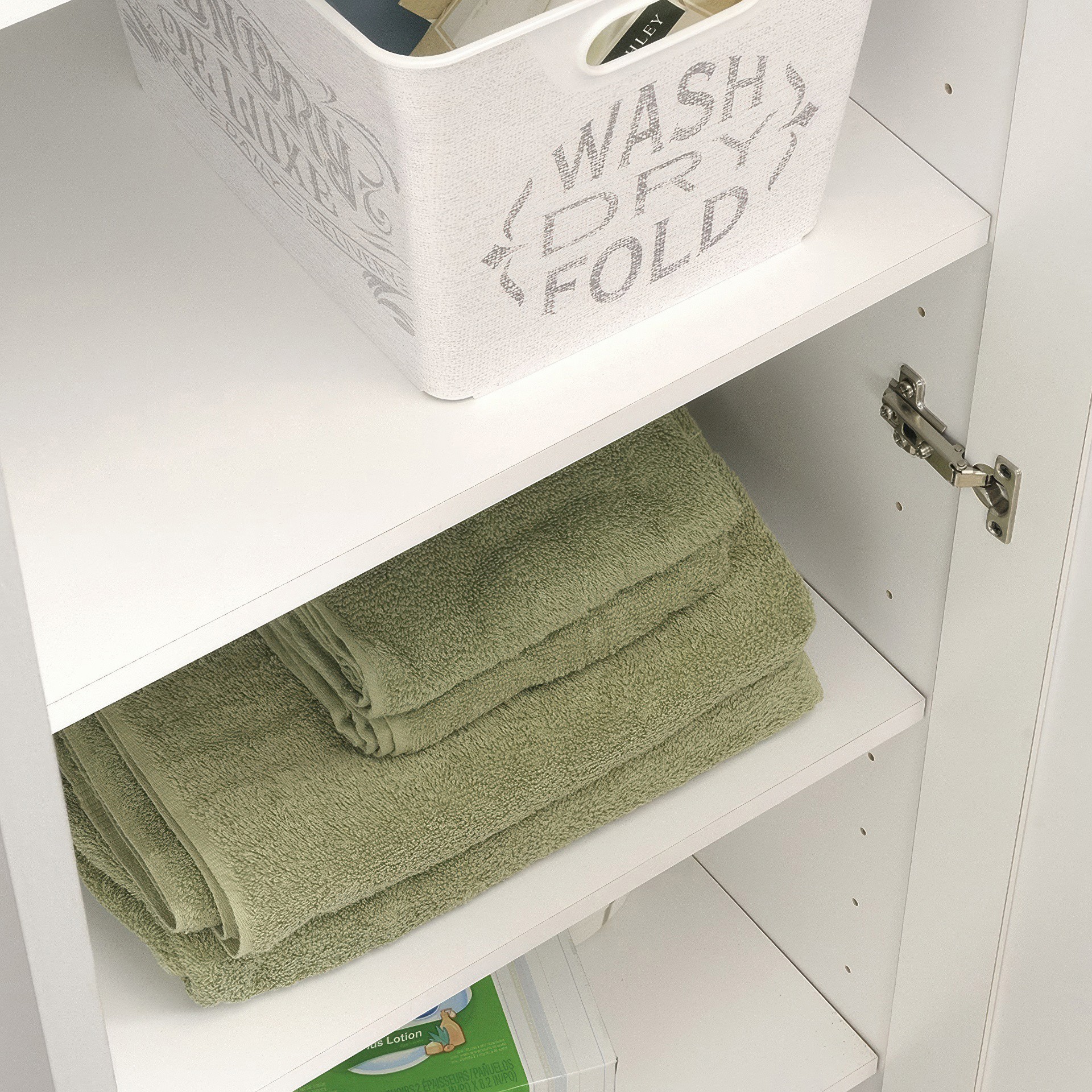 Behind the framed panel doors of this narrow storage cabinet are four adjustable shelves to store anything from pantry food to fluffy bathroom towels.