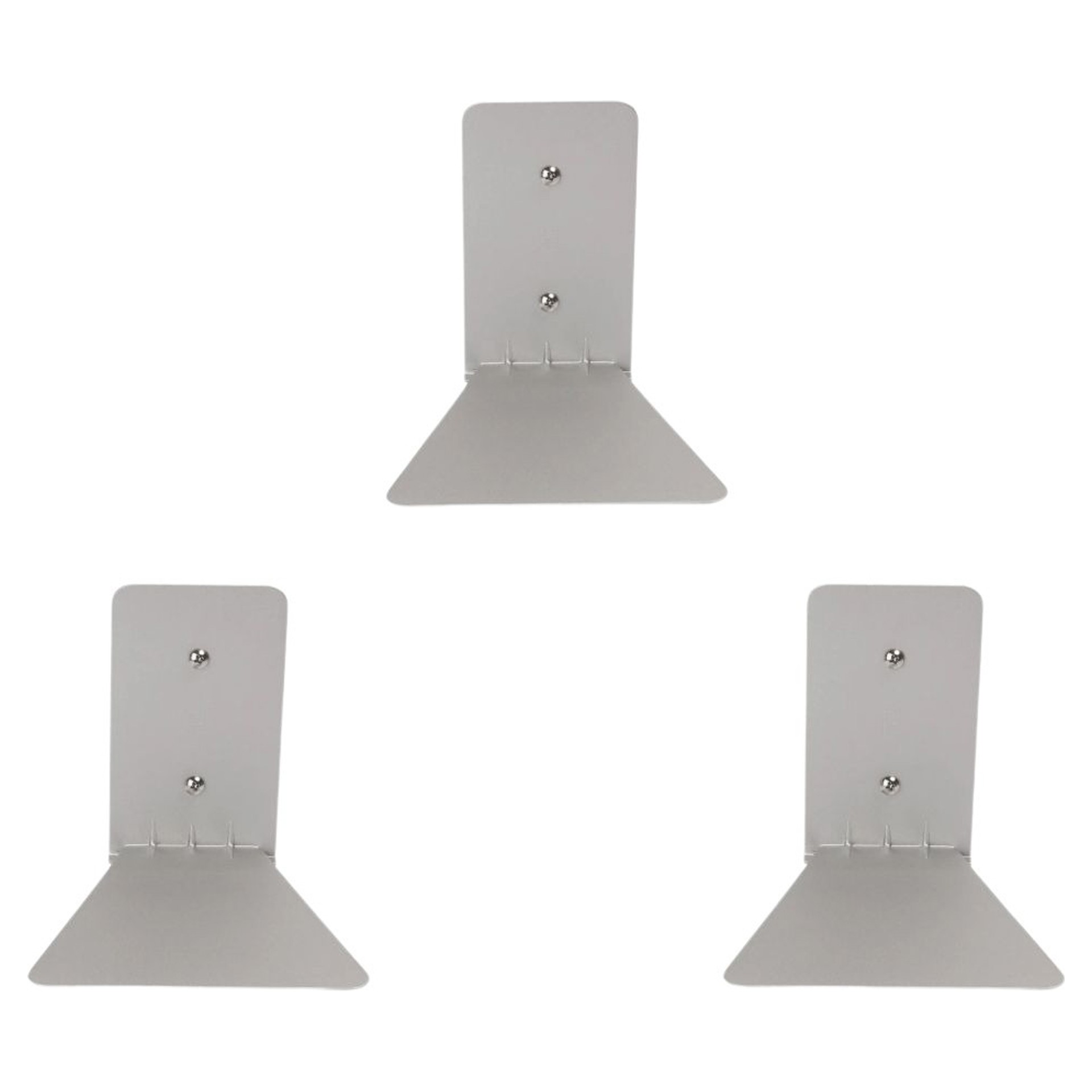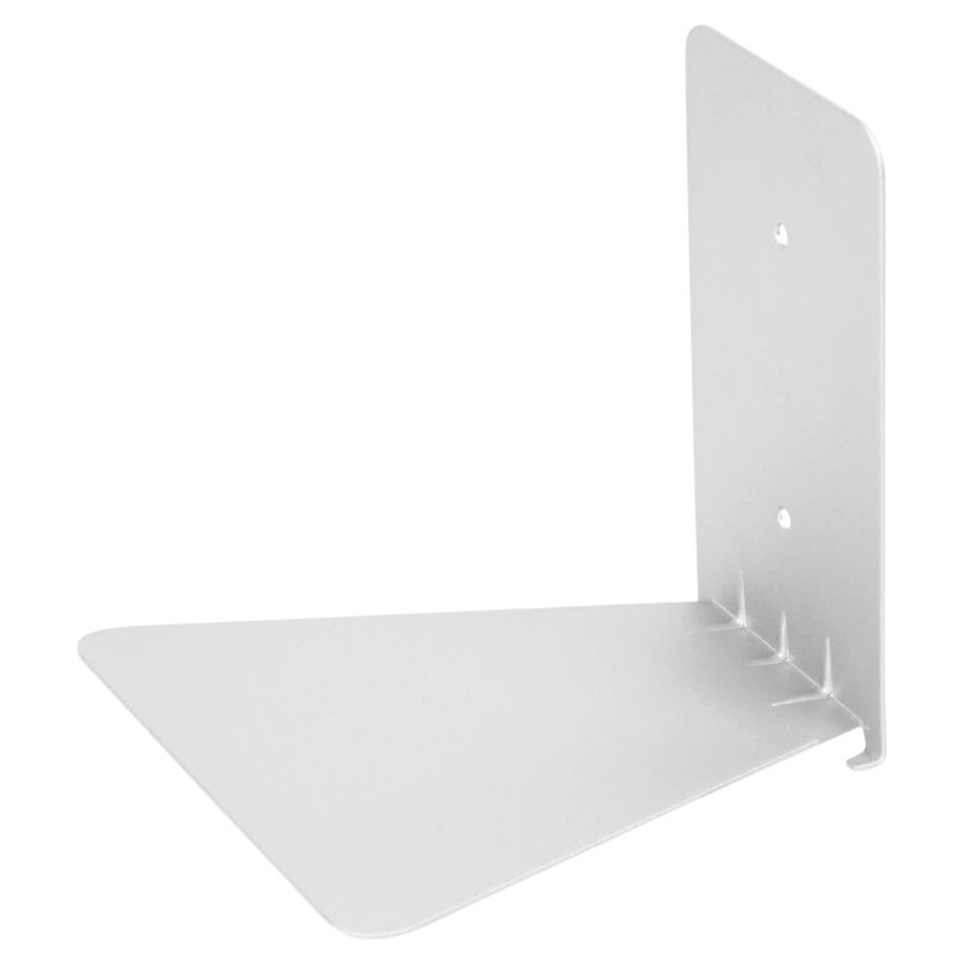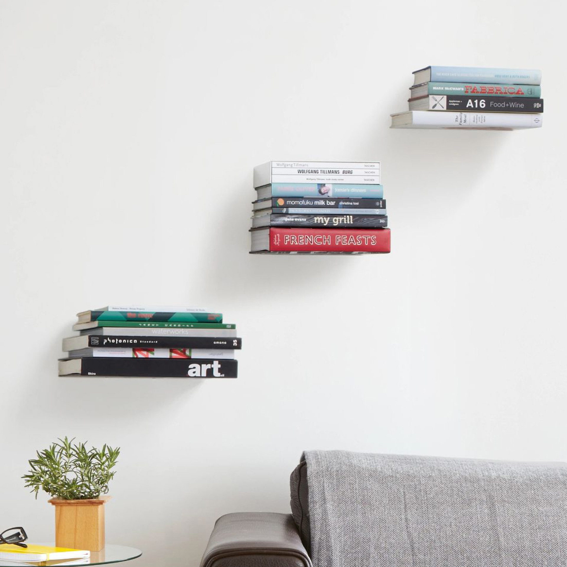 Concealed shelves come in a set of 3 silver powder-coated floating shelves that become invisible behind a stack of books, turning books into a work of art.