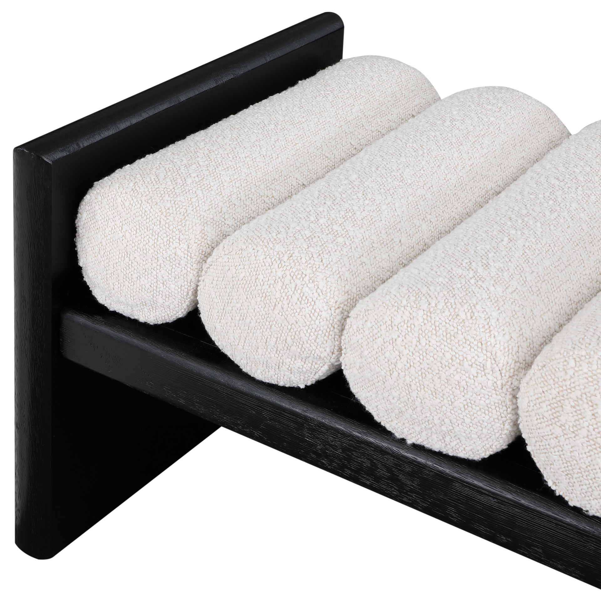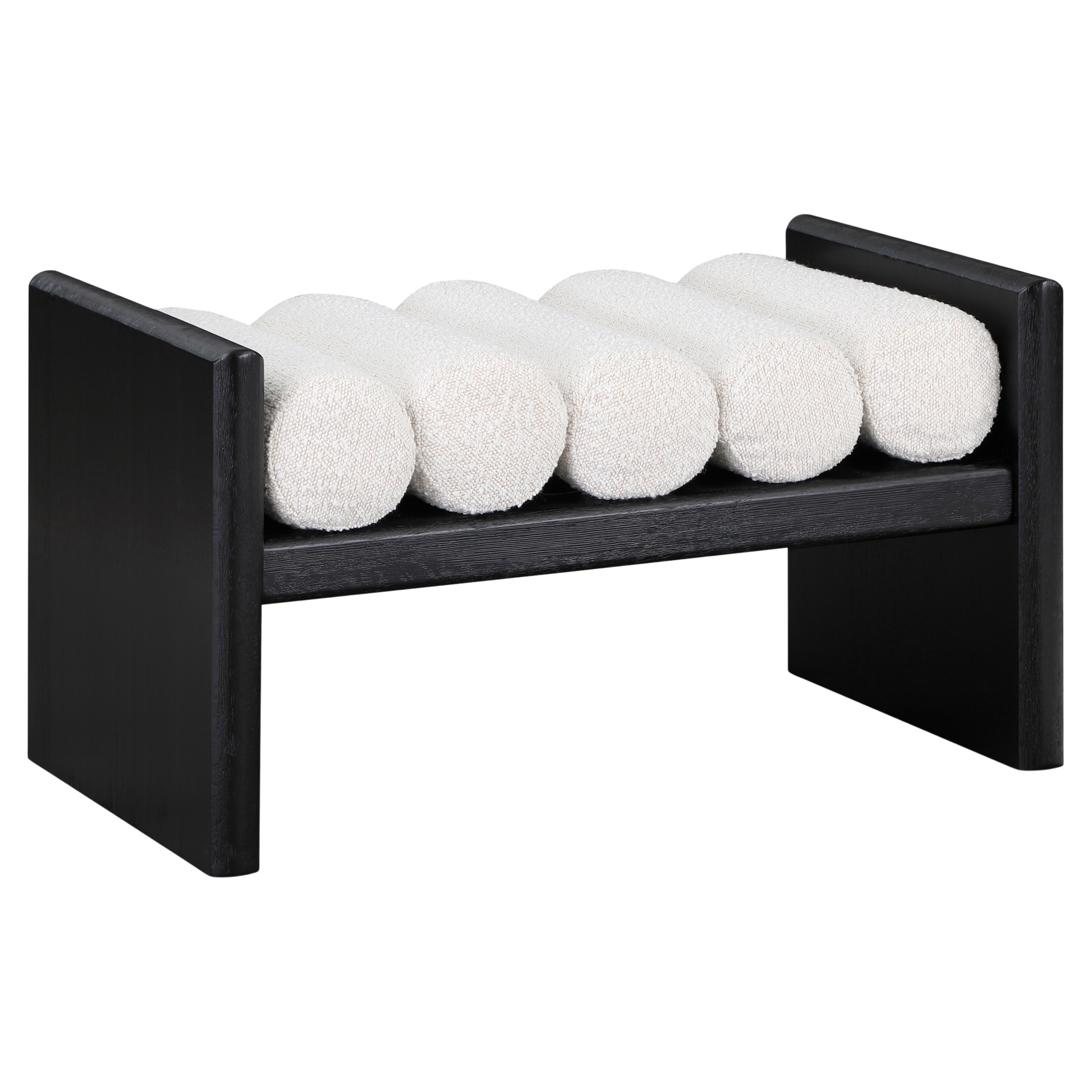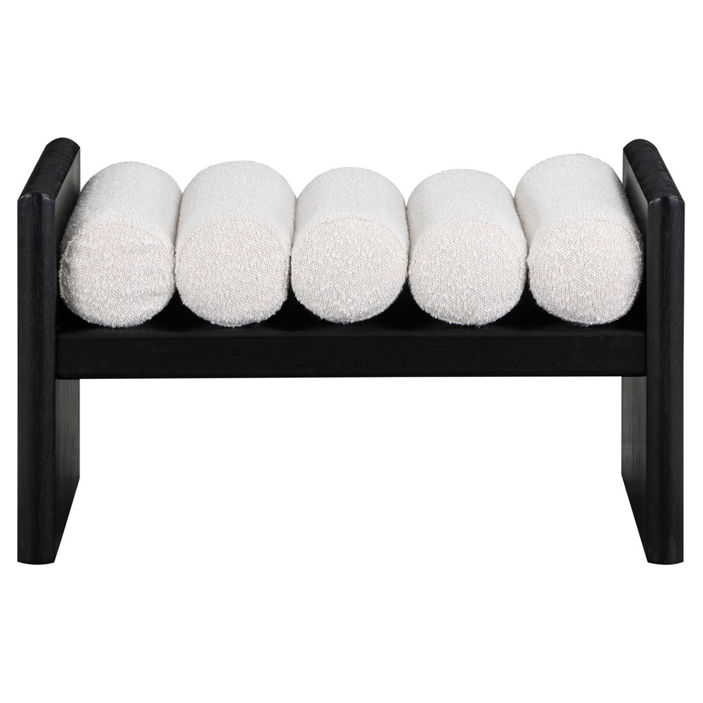 Its H-shaped design holds five rich black boucle fabric cushion rolls on top, providing a comfortable place to sit for you or your guests.
