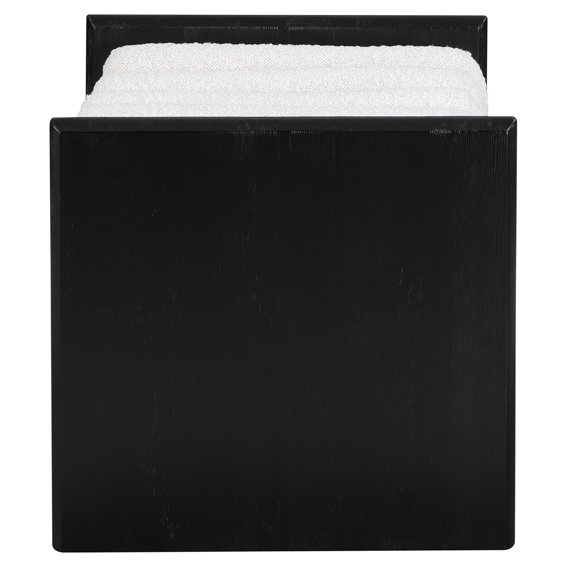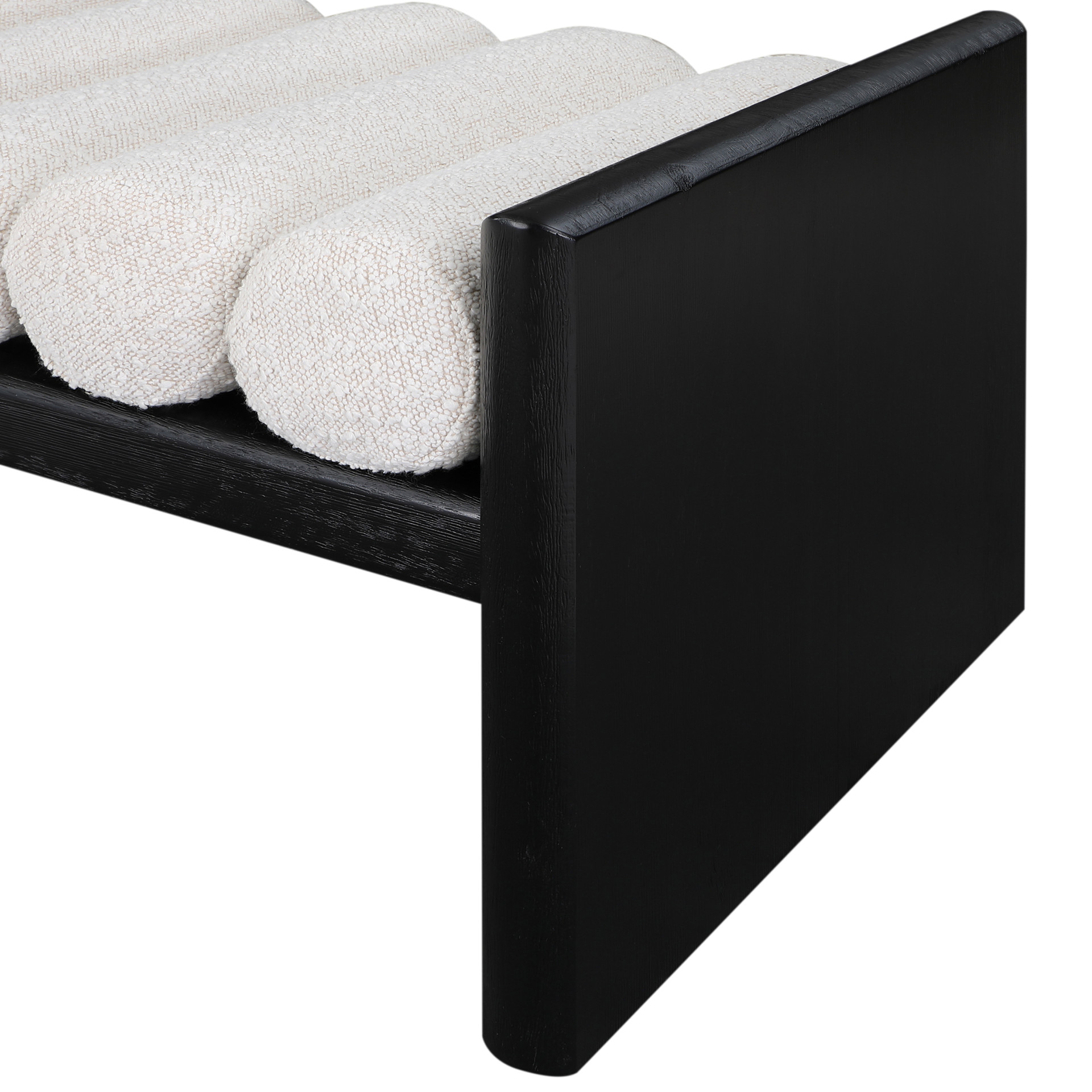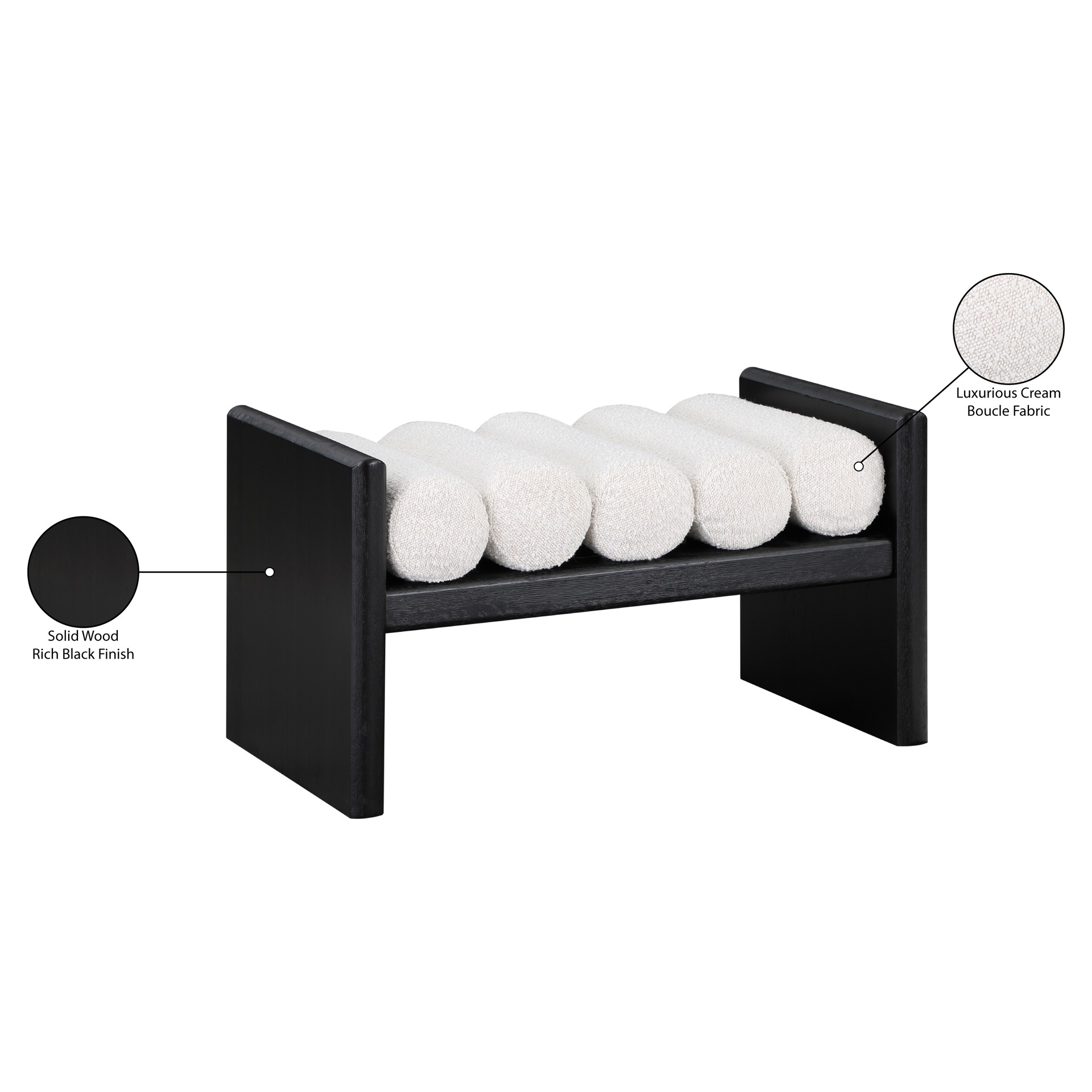Its H-shaped design holds five rich black boucle fabric cushion rolls on top, providing a comfortable place to sit for you or your guests.