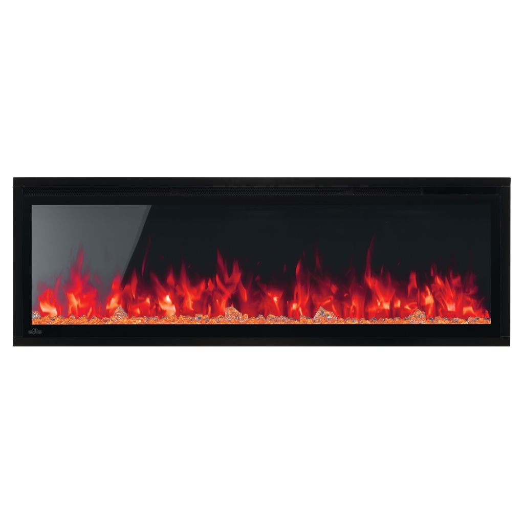- The Entice 50 electric wall fireplace from Napoleon measures 16.94 inches high, by 49.69 inches wide, by 5.4 inches deep (43.03 cm high, 126.21 cm wide, 13.82 cm deep).