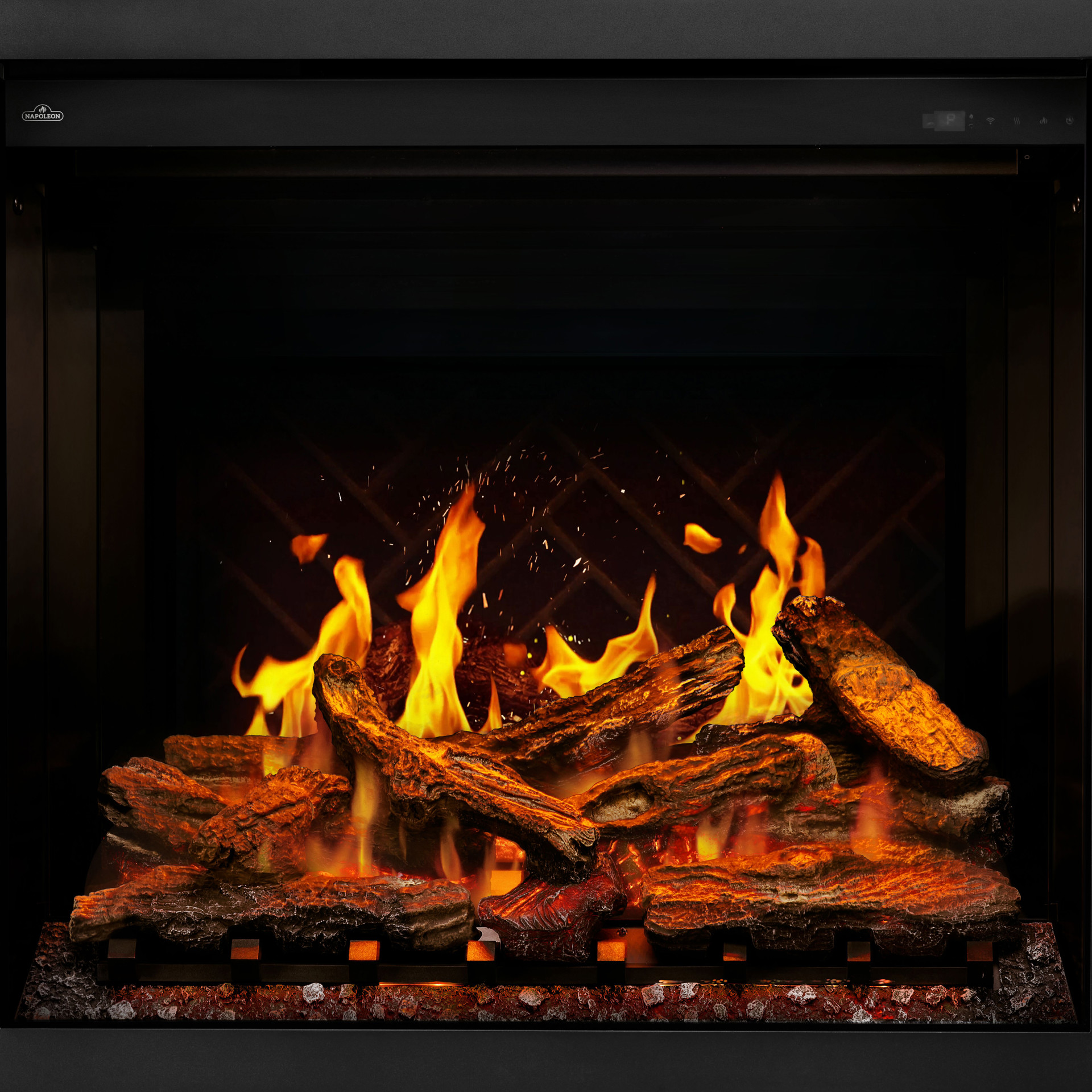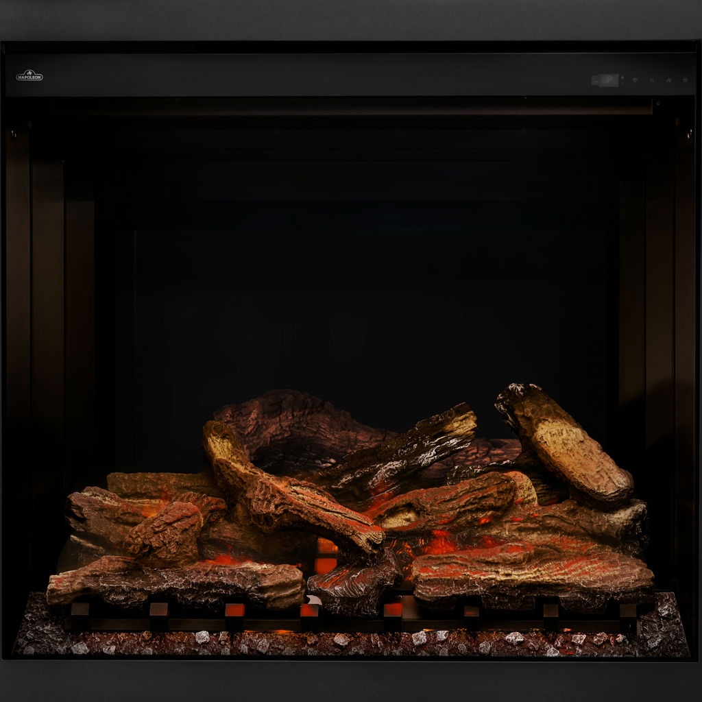 Next-level realism: The most realistic Napoleon electric fireplace yet, featuring three flame levels for exceptional depth and vivid brightness, paired with luxury oak logs