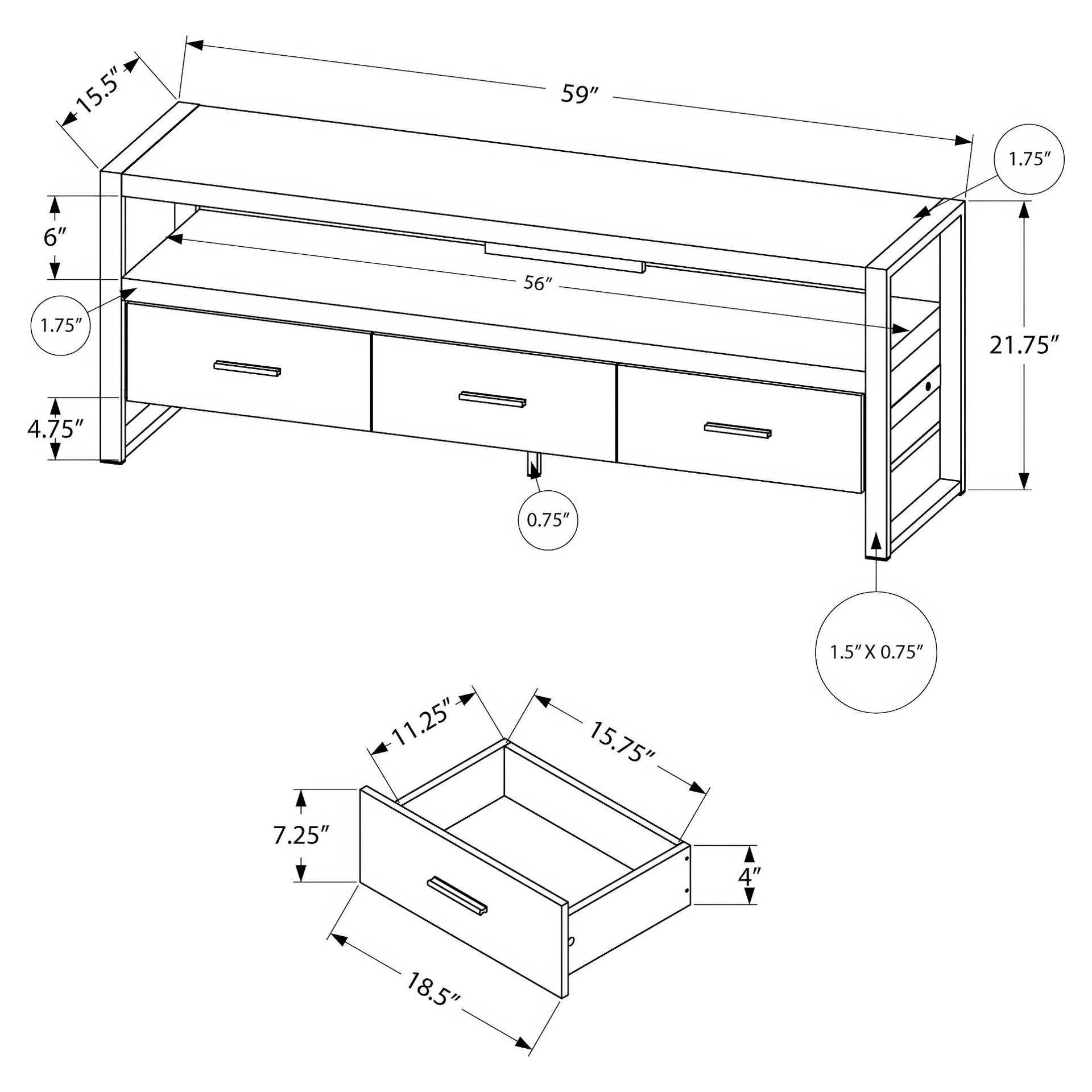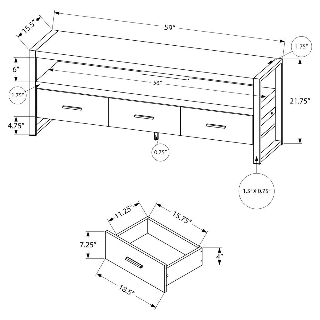 Bring industrial inspiration to your entertainment space with this TV stand. Its bold styling is offered by strong black satin metal side legs that contrast with its rustic finish.