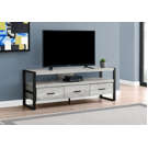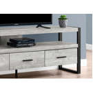 Industrial-inspired styling with a rustic gray woodgrain finish. An open shelf ideal for audiovisual units.