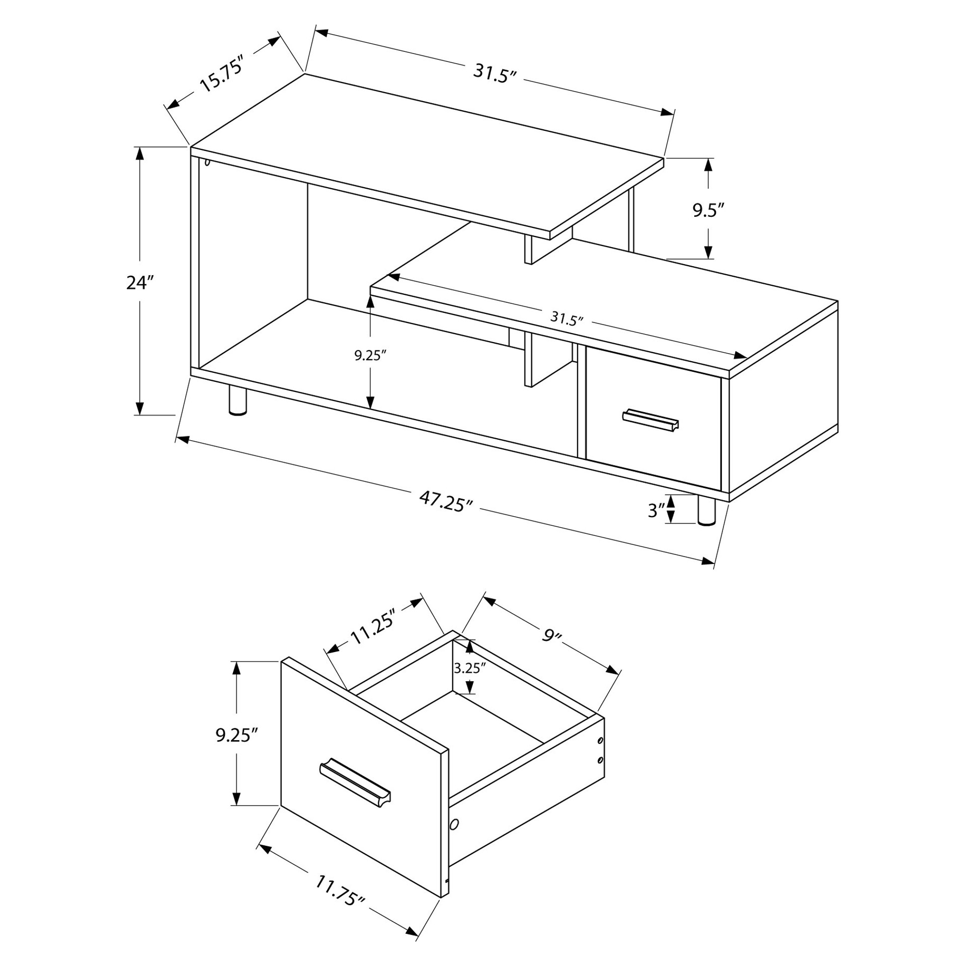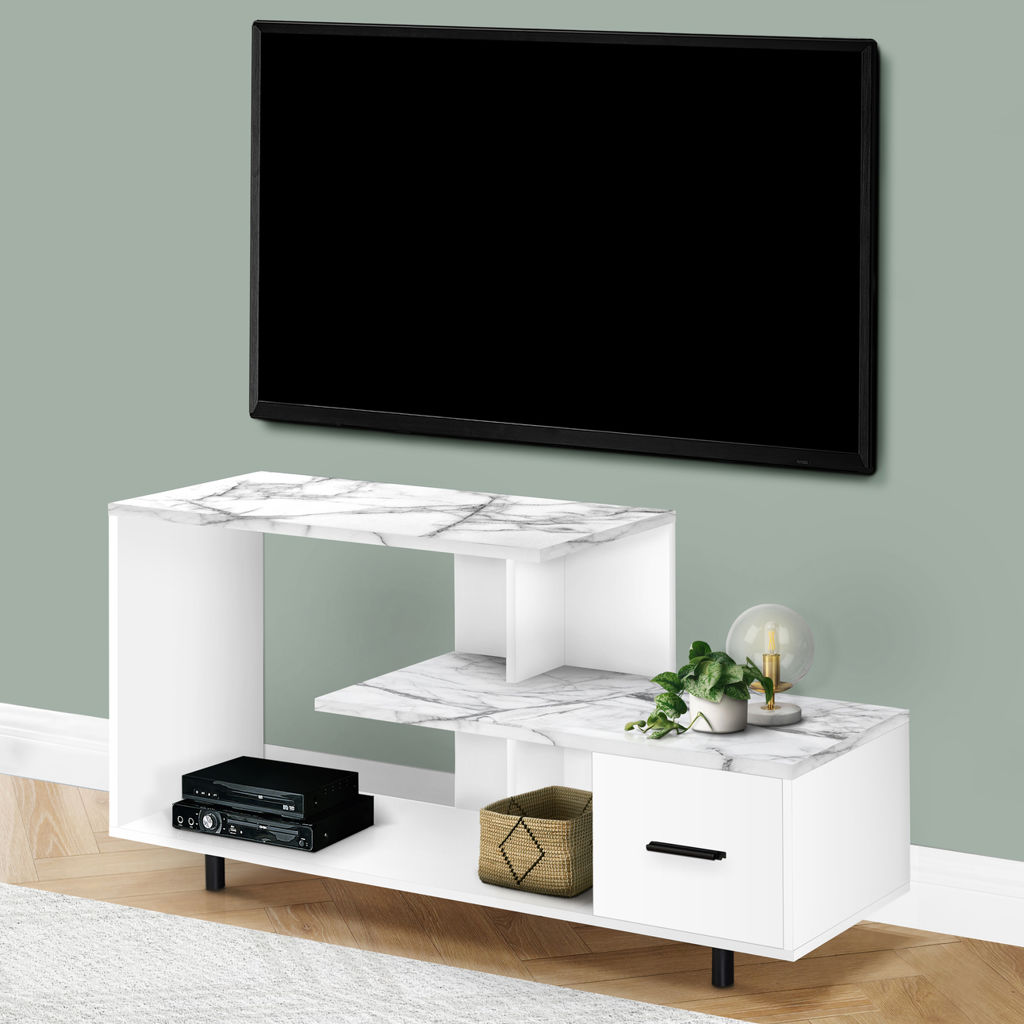 It features open shelves and a storage drawer, ideal for hiding multimedia accessories. This TV stand can support all sizes of TVs and includes a central stand.