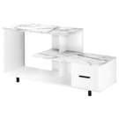 This asymmetrical white cabinet combined with white faux marble features sturdy cylindrical metal legs.
