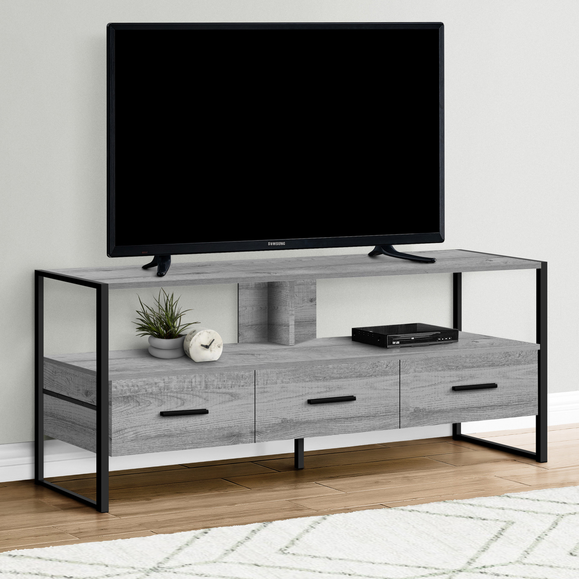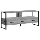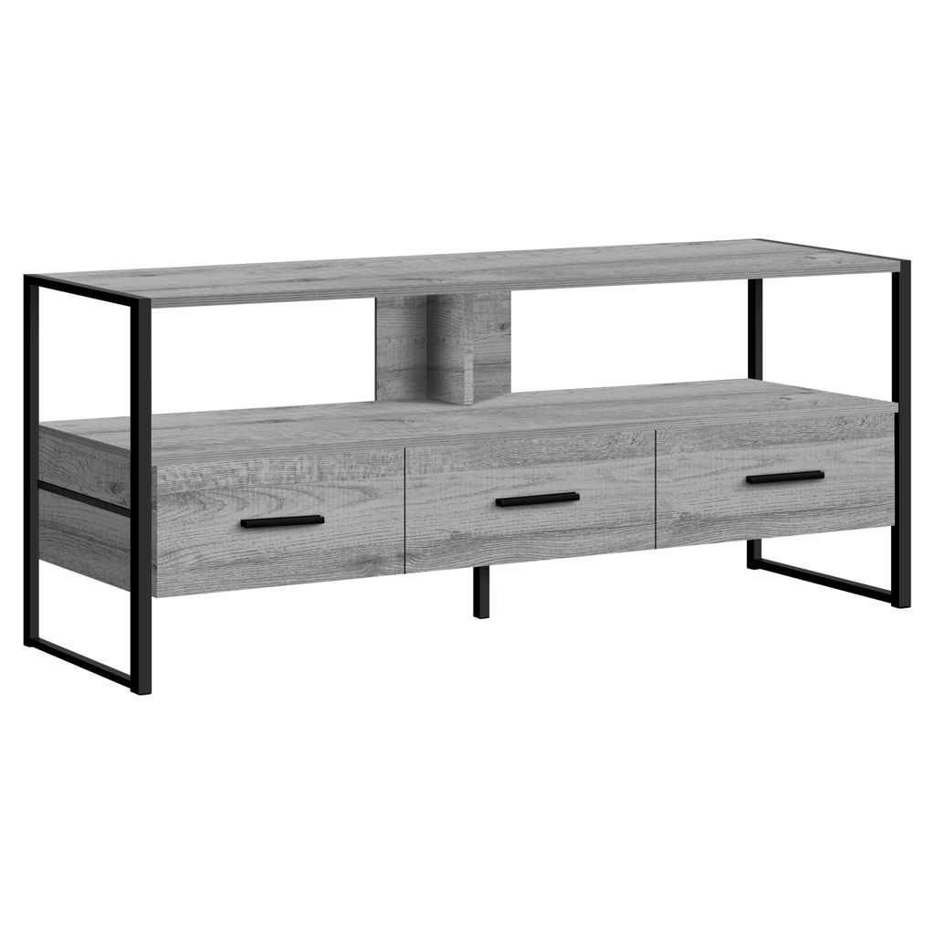 This grey faux wood TV stand features a long open shelf to accommodate a sound bar or a variety of multimedia equipment. The three drawers on metal glides have elegant black handles. They are spacious enough to hide your accessories.