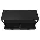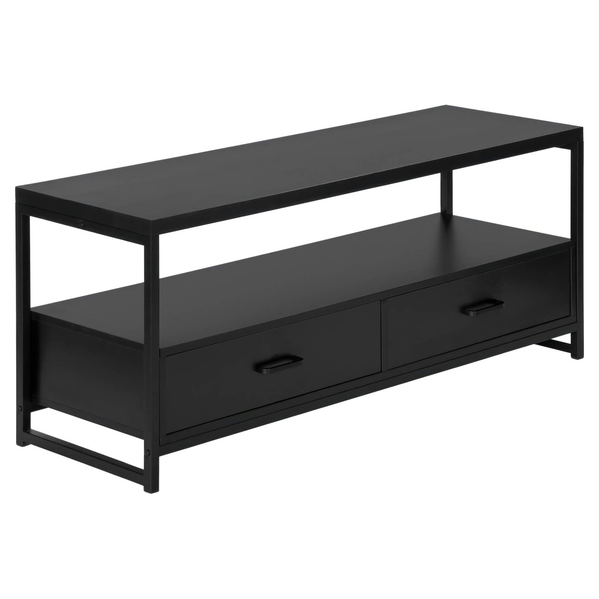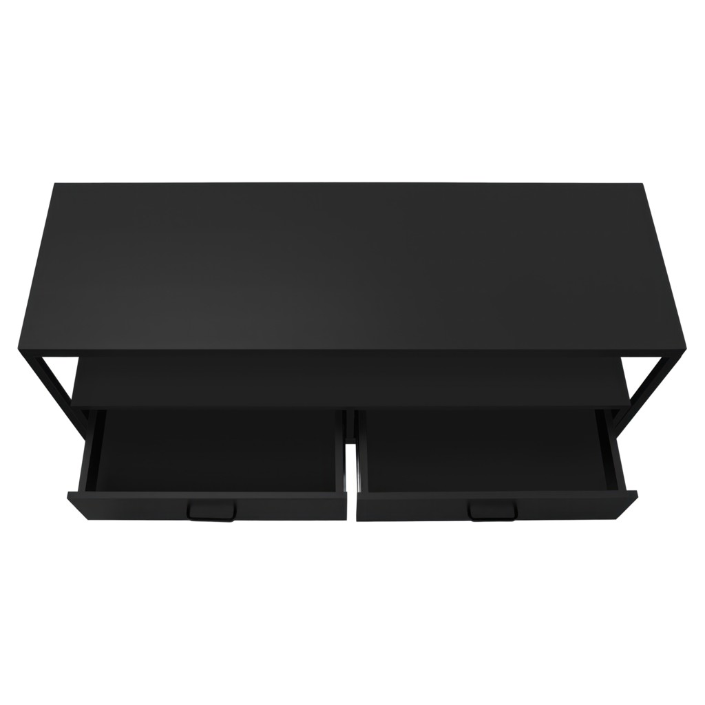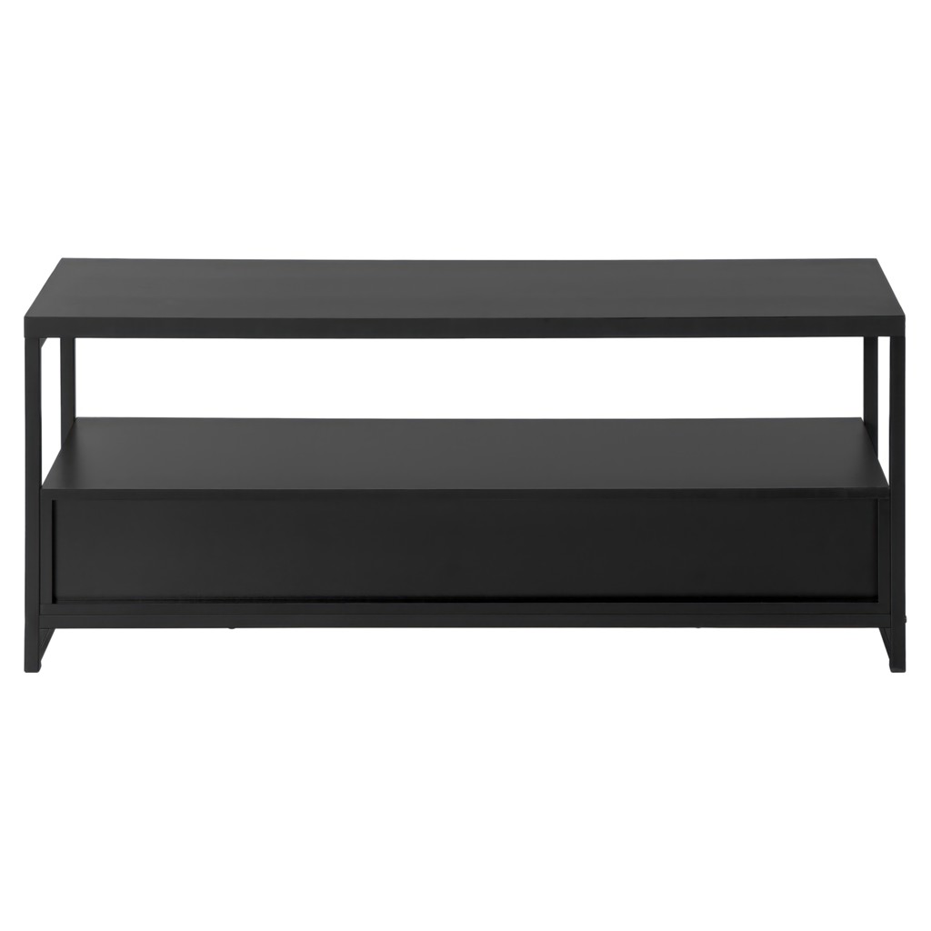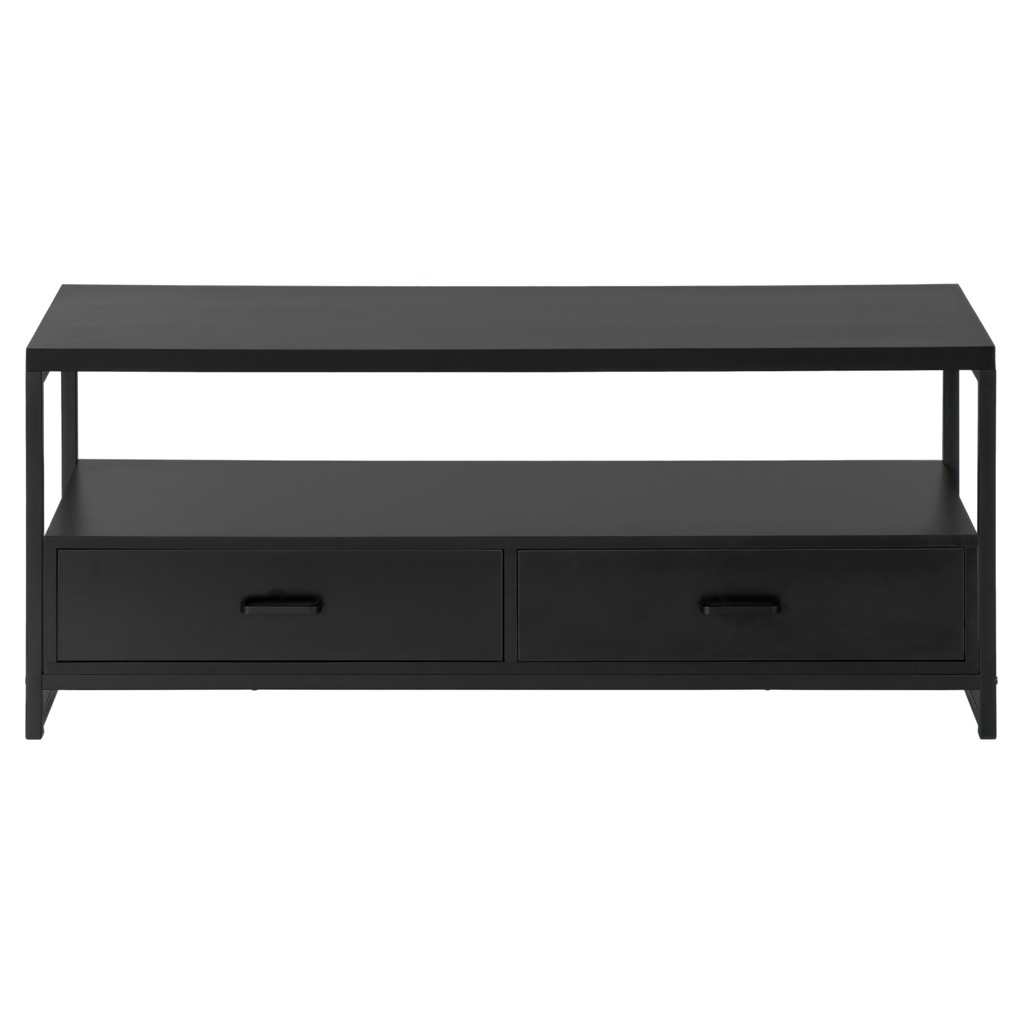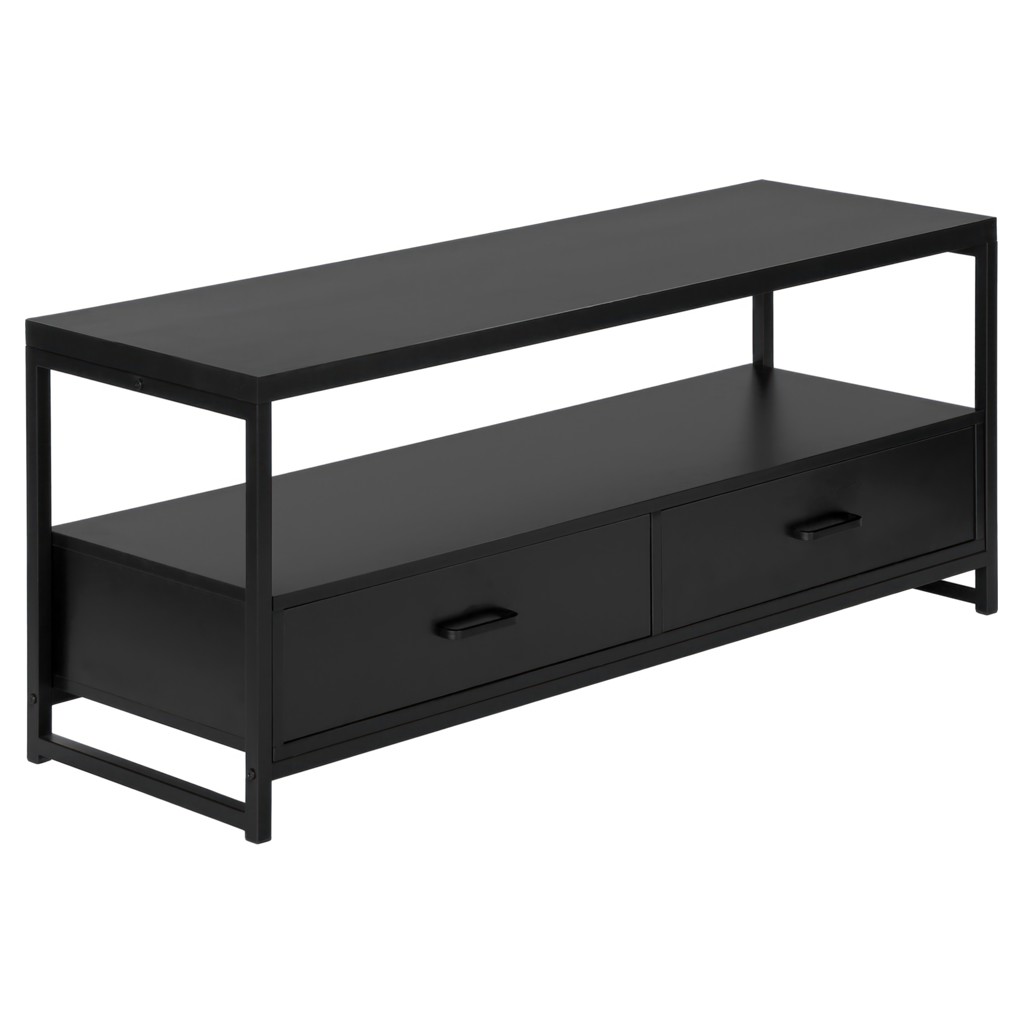 Simple with no frills, this versatile TV stand matches your décor without creating a clash. Equipped with 2 drawers and a vast space between its shelves, it allows you to completely customize it, either with a cute trinket in the middle of the shelf or a vast collection of electronics.