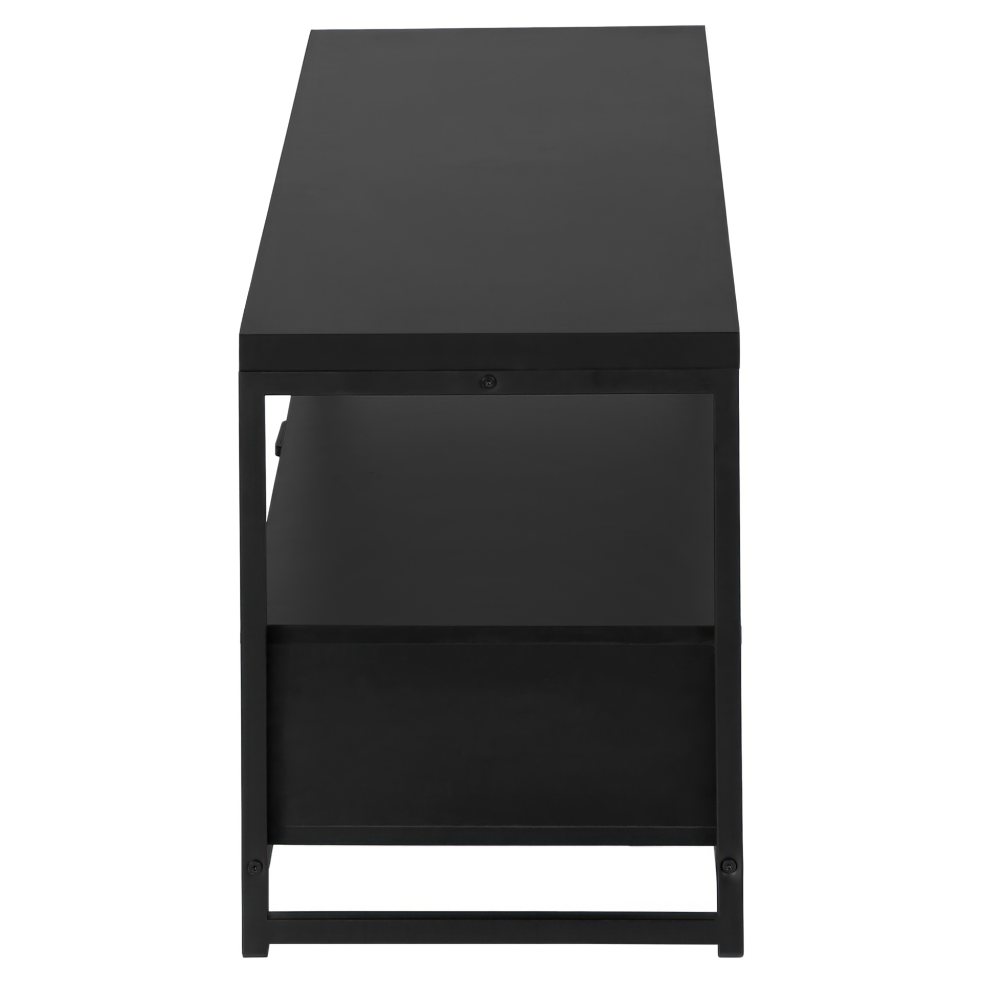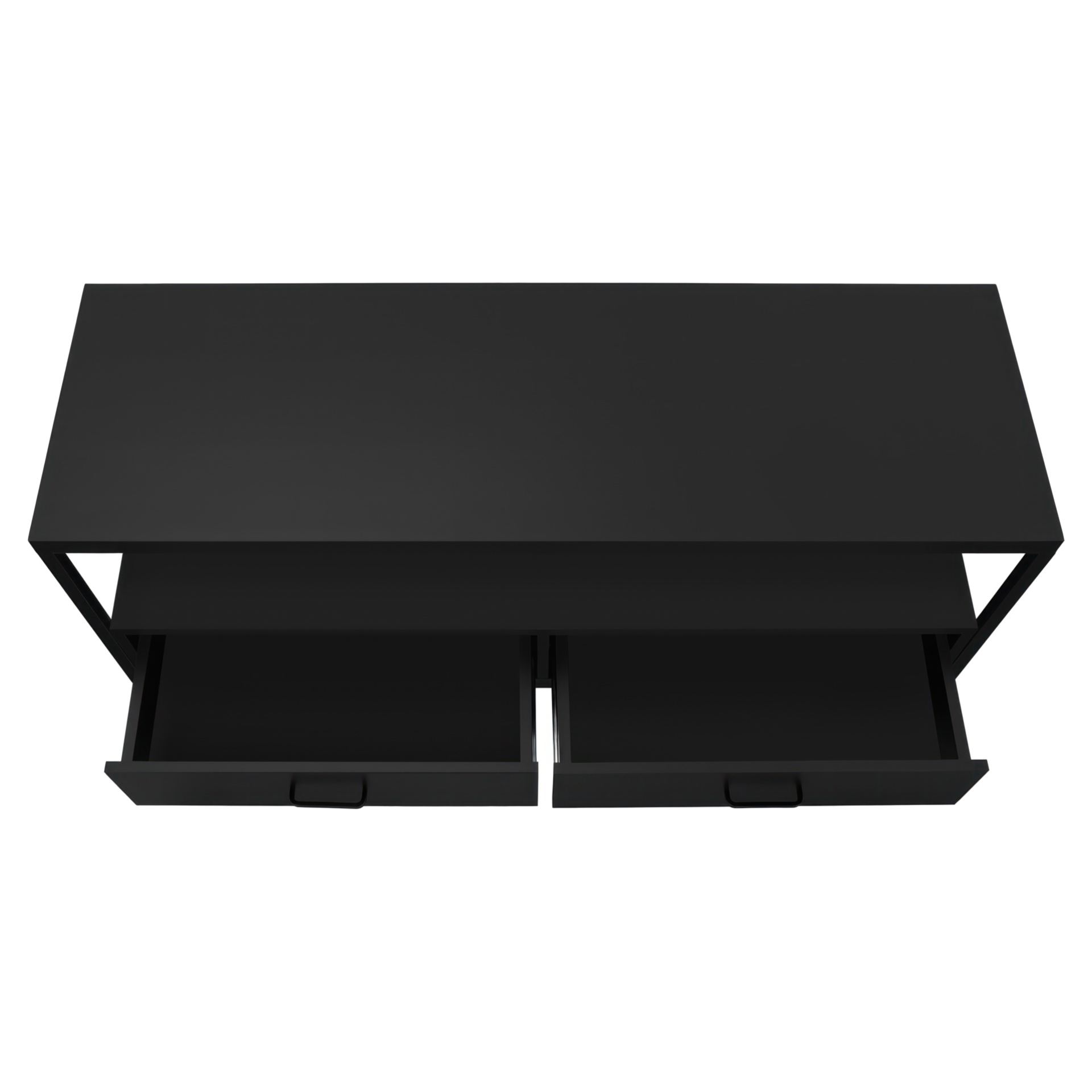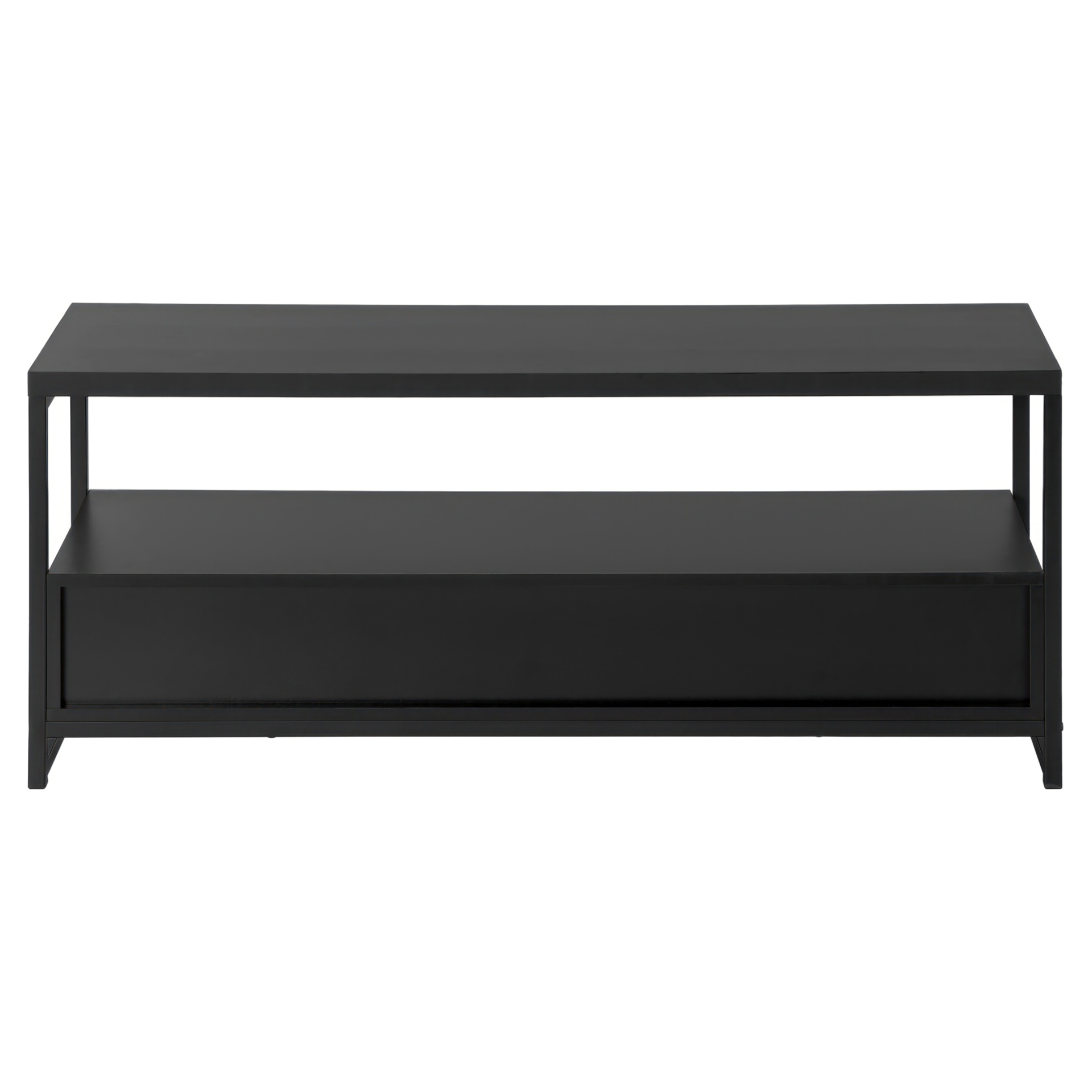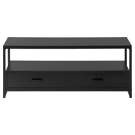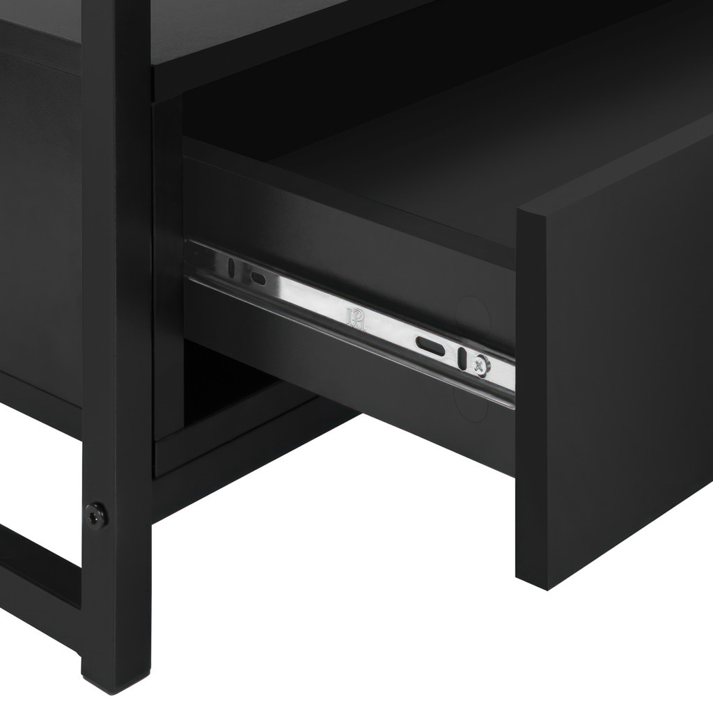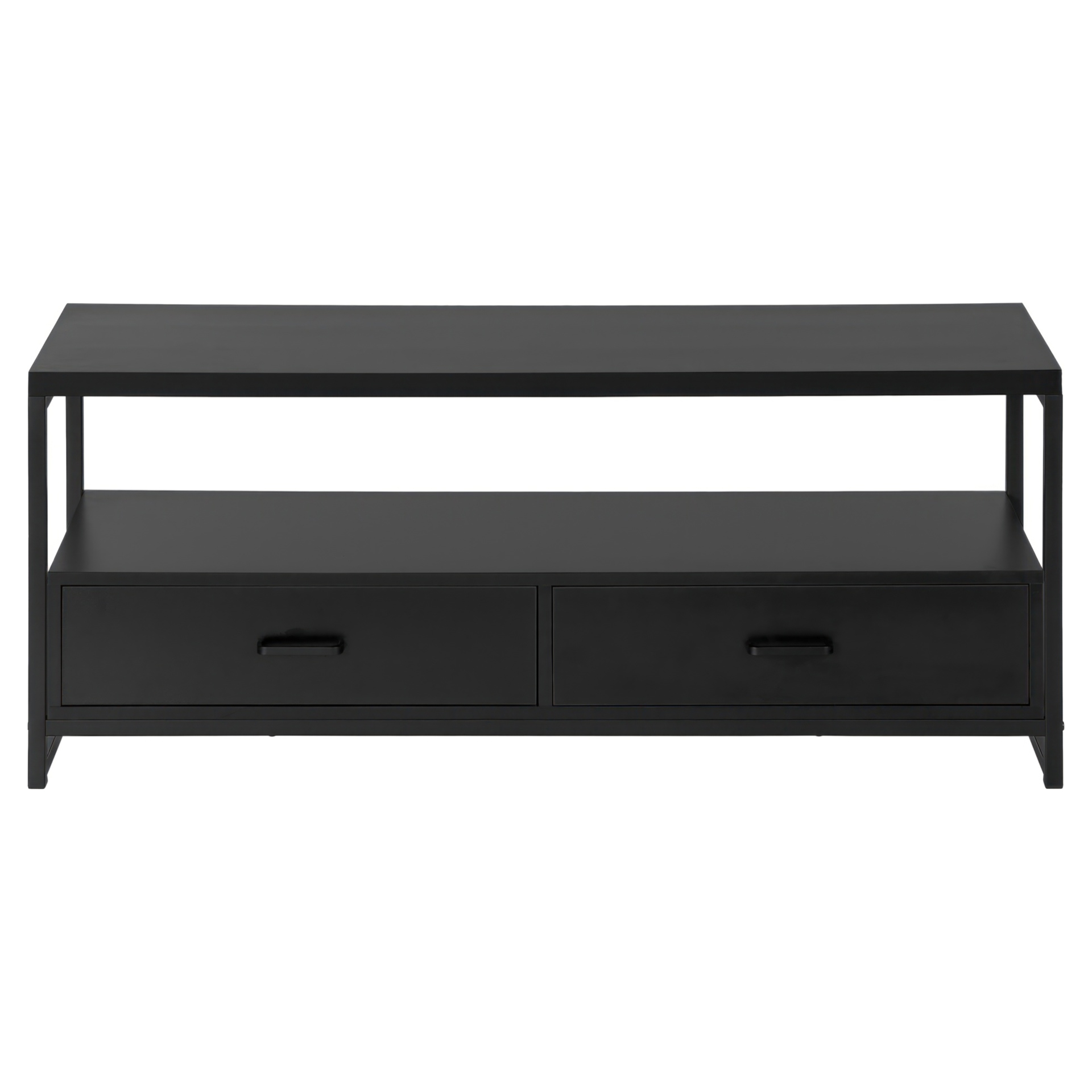 Simple with no frills, this versatile TV stand matches your décor without creating a clash. Equipped with 2 drawers and a vast space between its shelves, it allows you to completely customize it, either with a cute trinket in the middle of the shelf or a vast collection of electronics.
