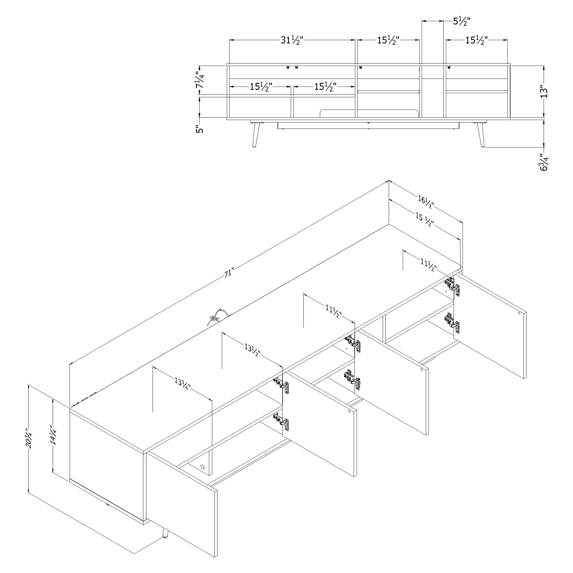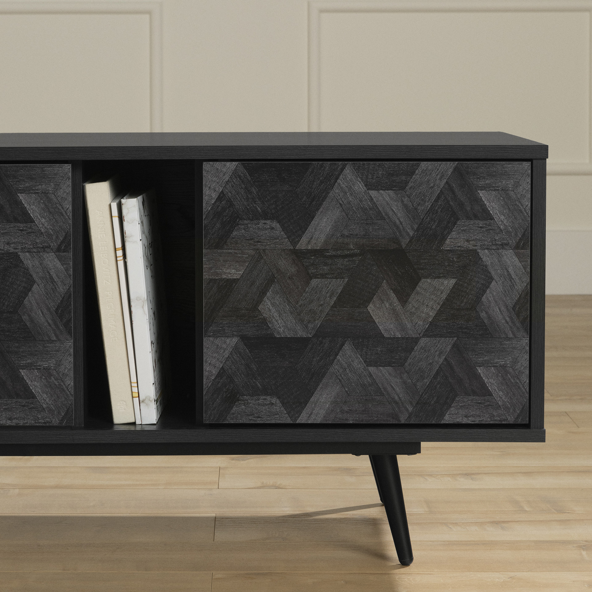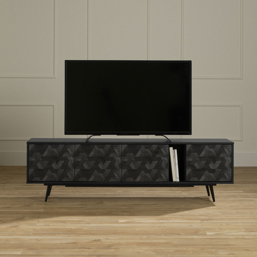 CONTEMPORARY STYLE: Its clean design, sharp lines, metal legs, and geometric patterns make this TV stand a contemporary centerpiece in the living room.