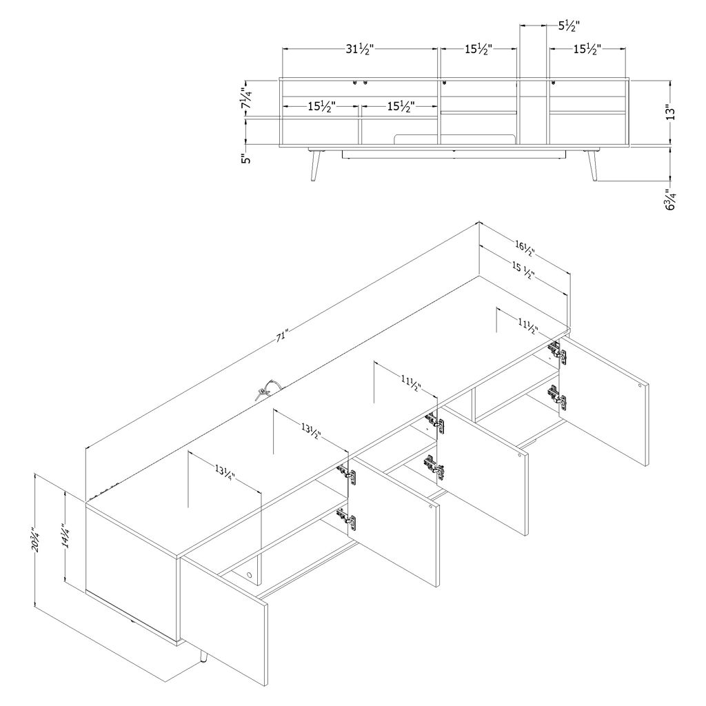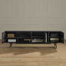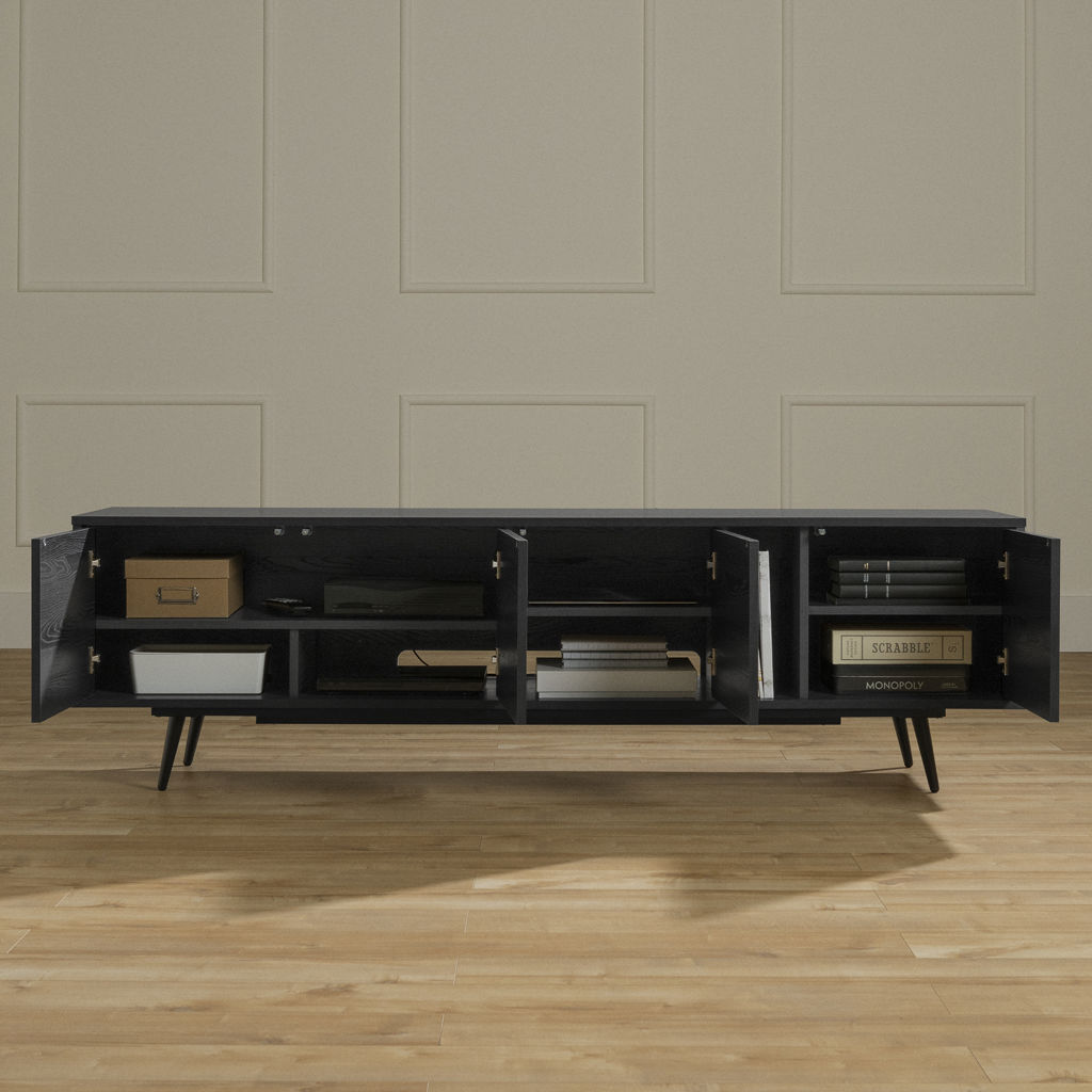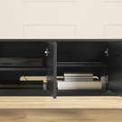 Designed to make your life easier, this piece says goodbye to tangled cables with a cable management hole accessible from two compartments. It also features adjustable shelves, ample closed space, and a vertical open compartment for everything that needs to be within easy reach. Supporting televisions up to 75" and with legs at only 2 ends, it's as sturdy as it is stylish.