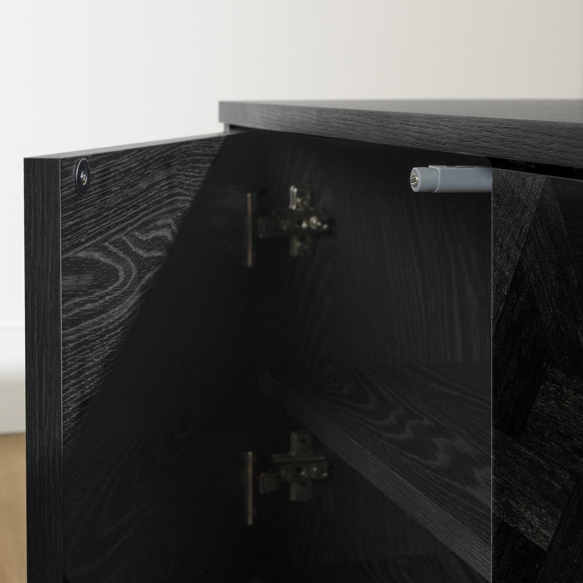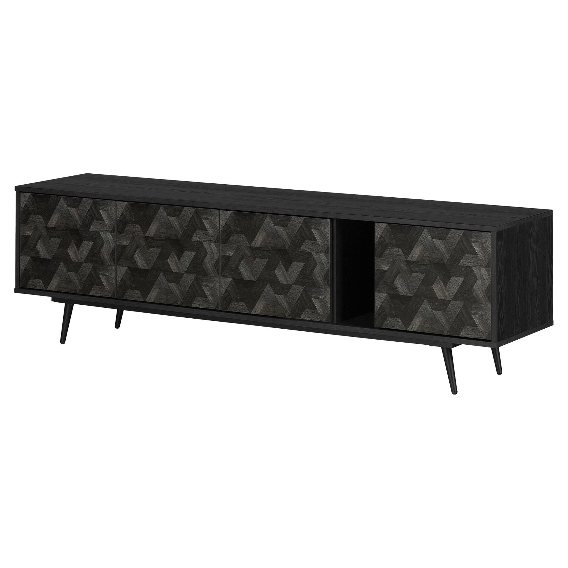 This TV stand is the contemporary touch that transforms the living room. Its slim metal legs and 71-inch length bring a sense of lightness and modernity. The handle-free design, achieved through a touch-to-open mechanism, creates an ever smoother and more refined appearance. The finishing touch, geometric patterns on the façade, gives it that extra something that catches everyone´s eye.