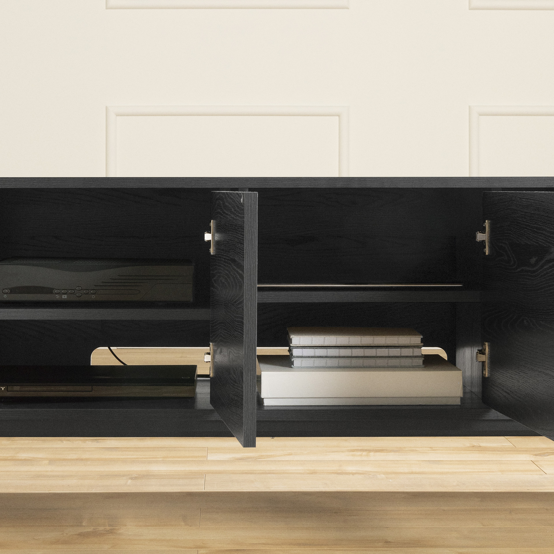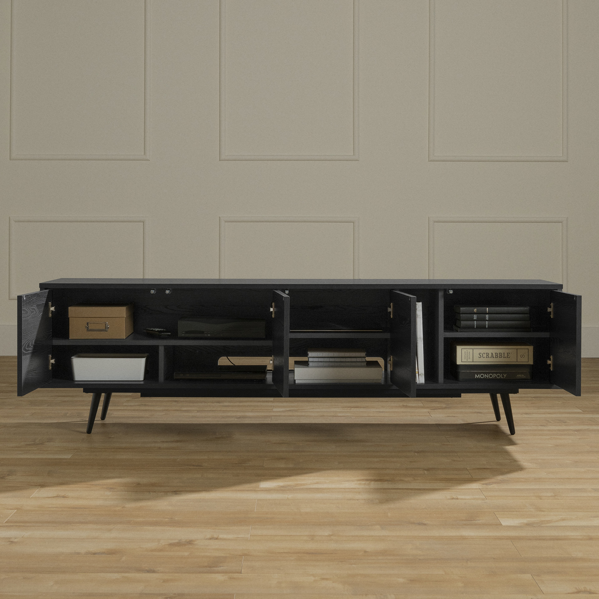 SMART STORAGE: With its four doors, vertical open storage space, and adjustable shelves, you´ll have all the necessary storage for your electronics, books, remote controls, and more.
