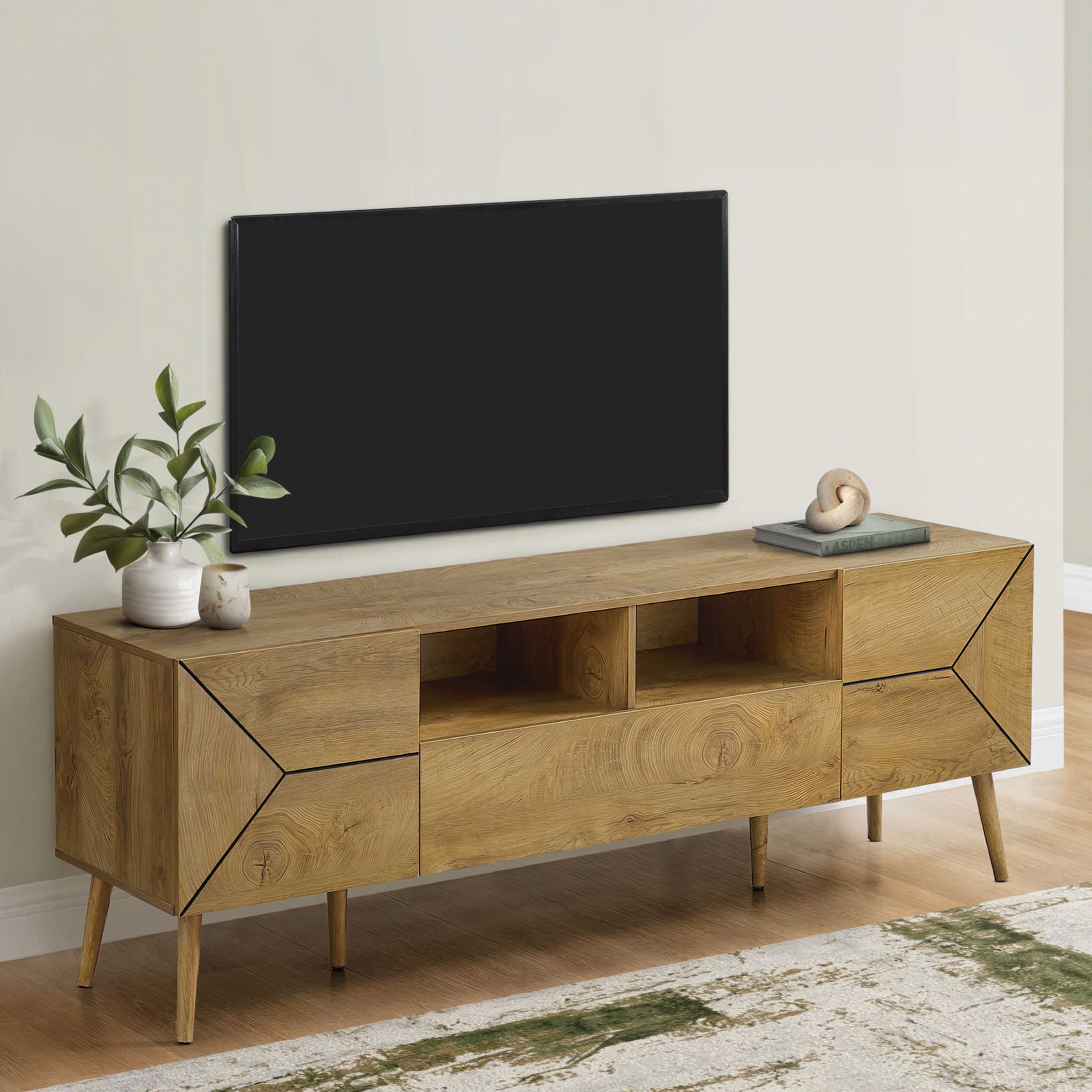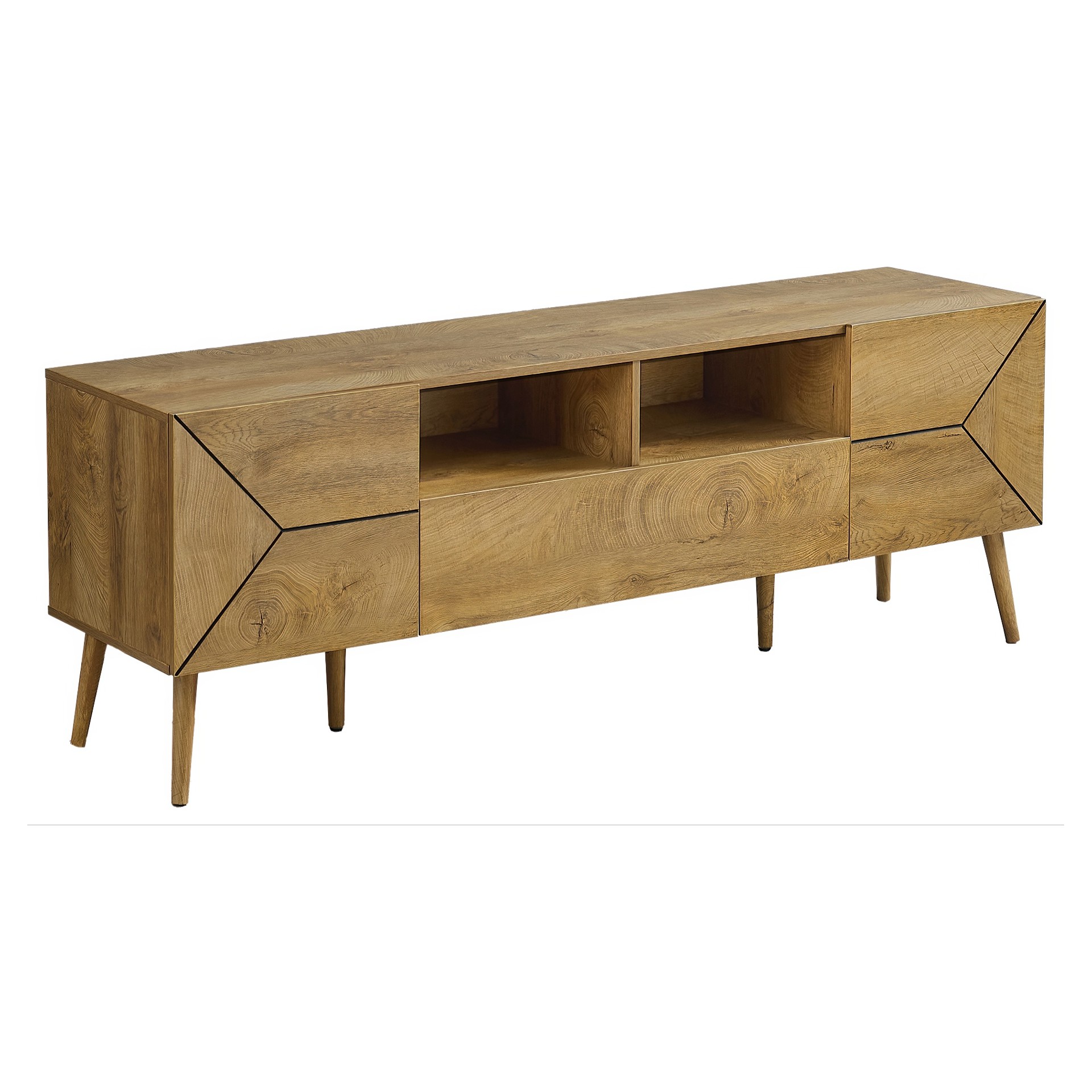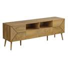 This tv console boasts a mid-century, retro style with solid construction that is both fashionable and functional. Offering plenty of space with 2 open cubbies,1 large easy glide storage drawer and 2 closed cabinets with stylish grooved lines, all to keep your media essentials organized.