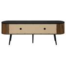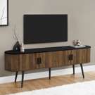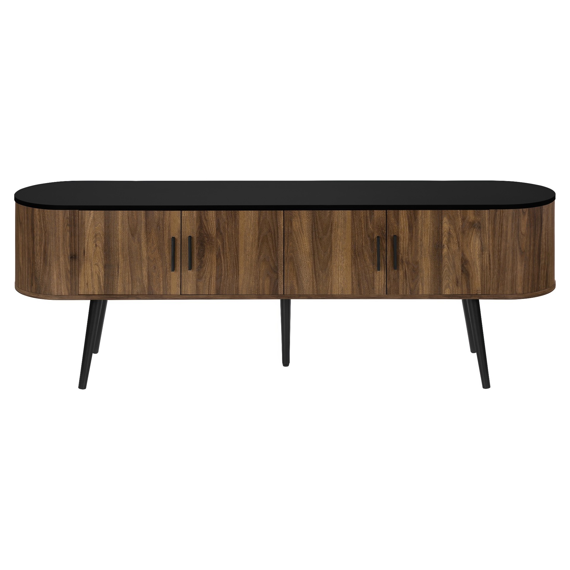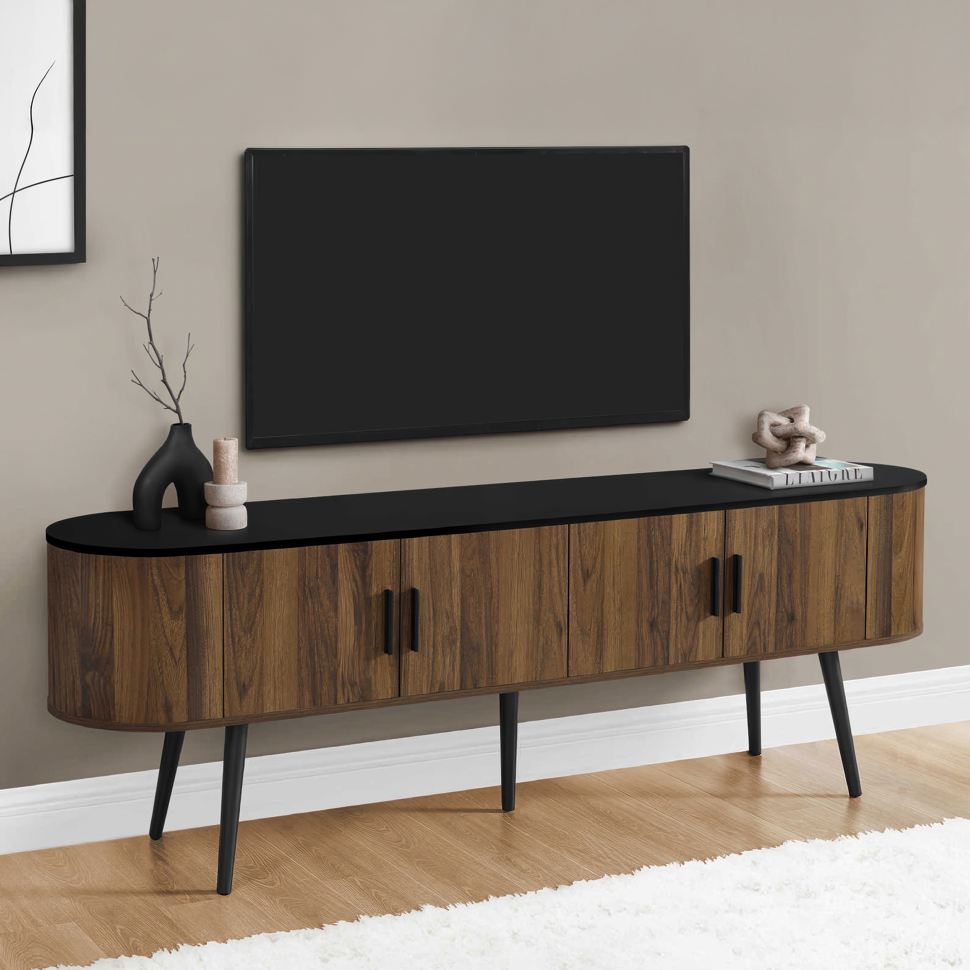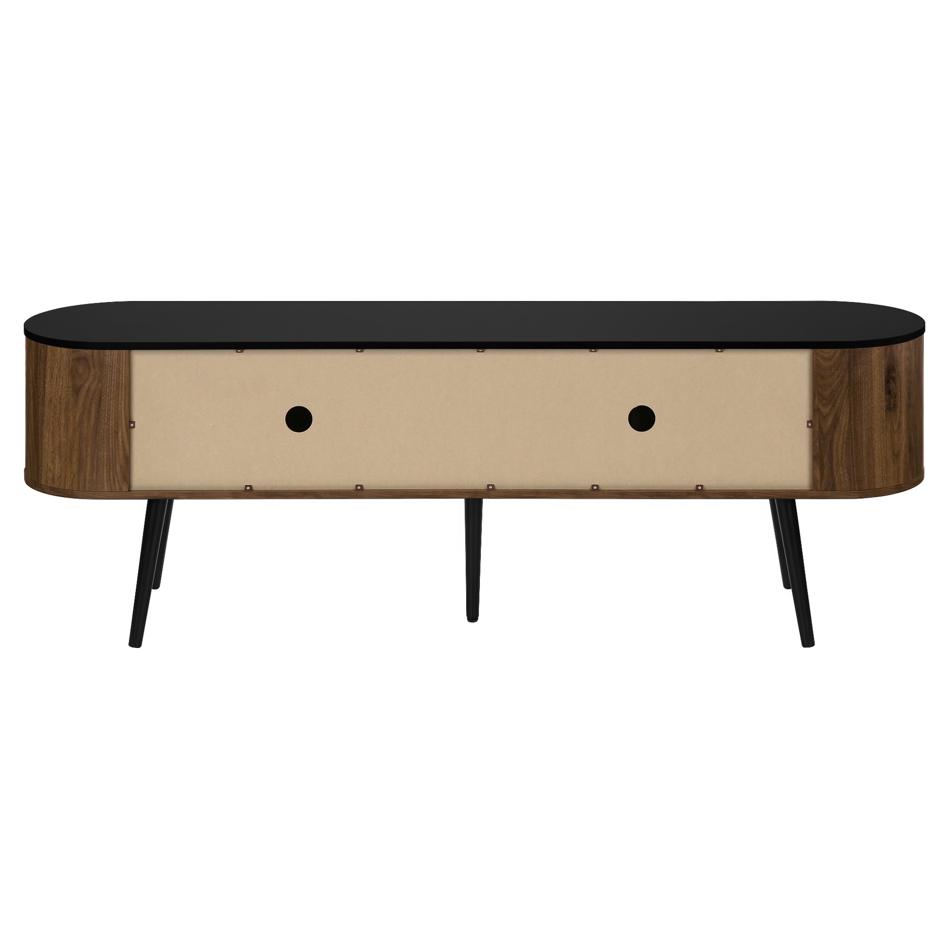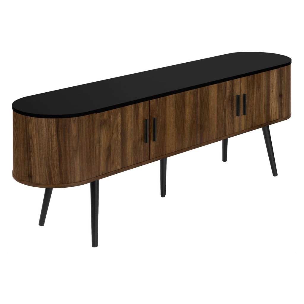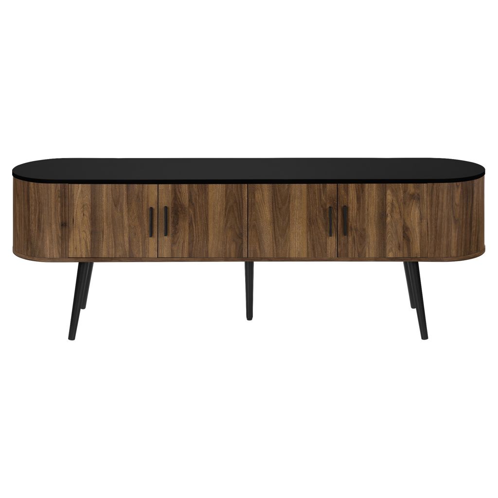 Keep your living room organized with spacious storage cabinets and two hidden cable management holes to keep unsightly wires out of sight. The curved sides bring a contemporary and mid-century flair to this tv stand, making it the perfect addition to your bedroom or living room.