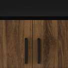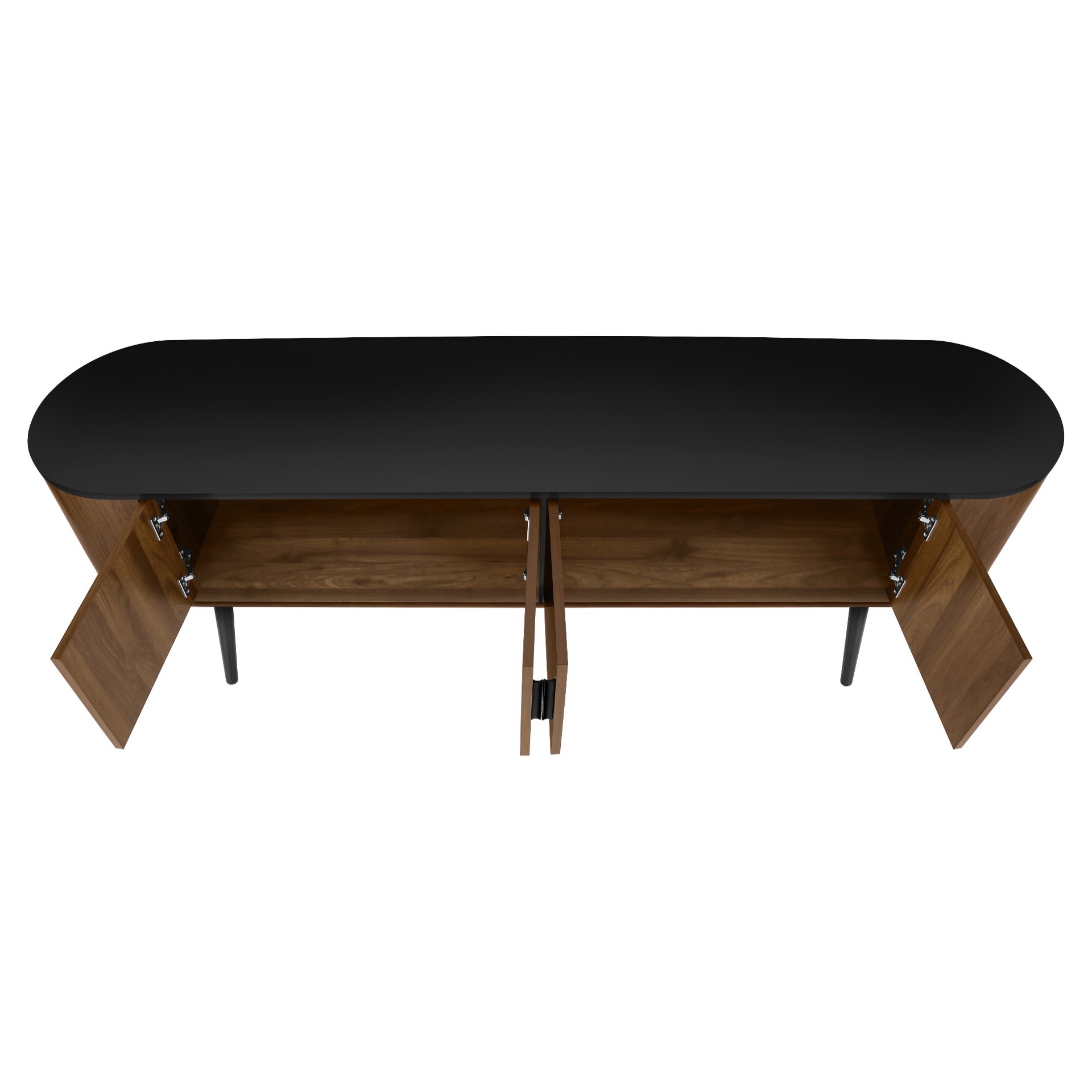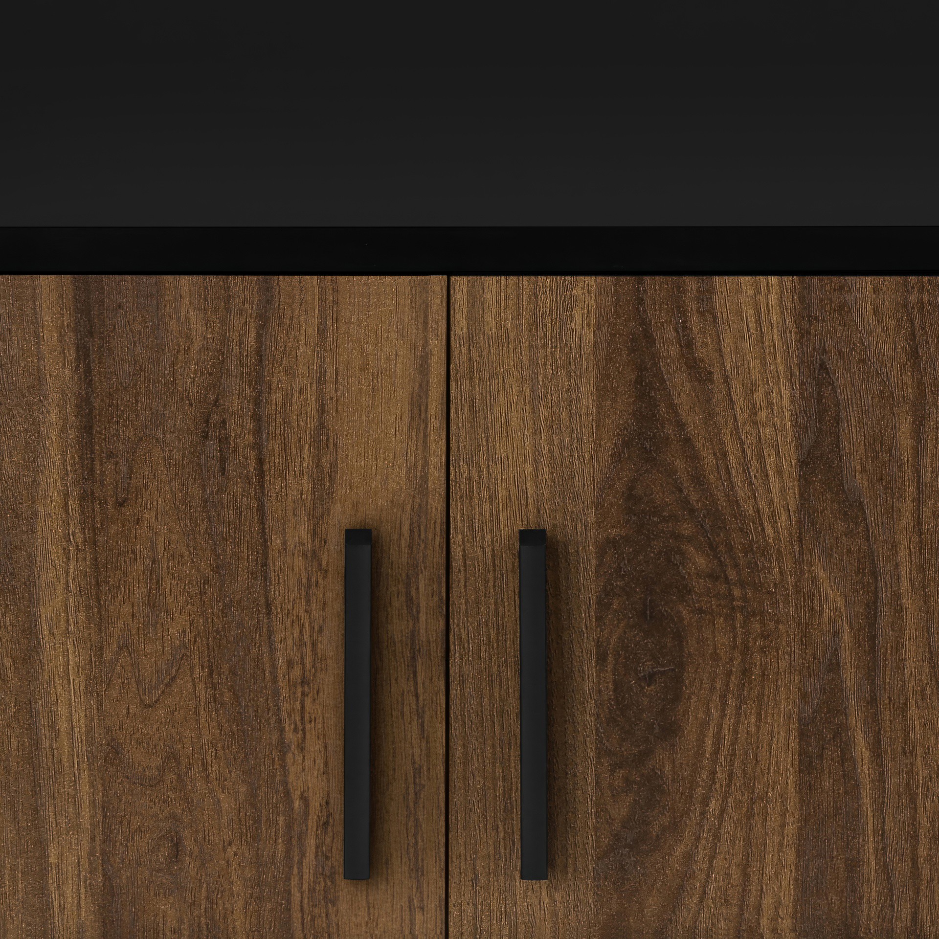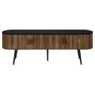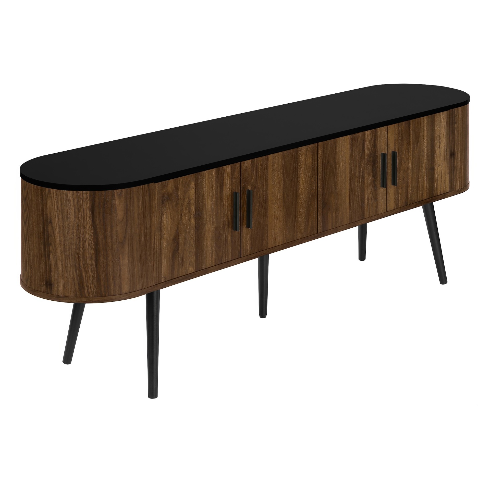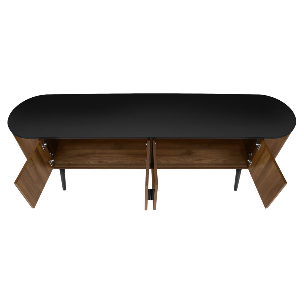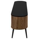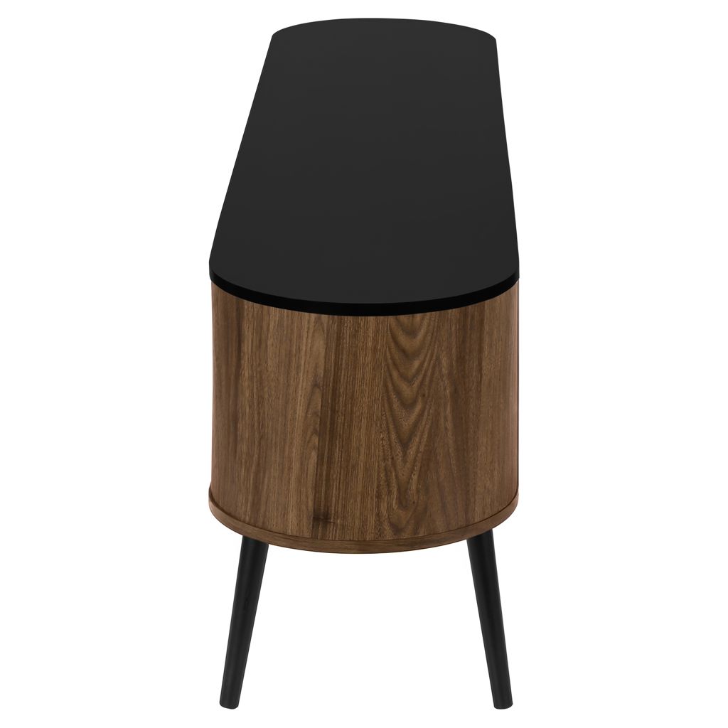 This console features a two tone design with a smooth black laminate finish on the easy to clean top and a wood-look walnut laminate on the 4 doors of the cabinet with sleek handles in black, adding a touch of retro style to your home decor.