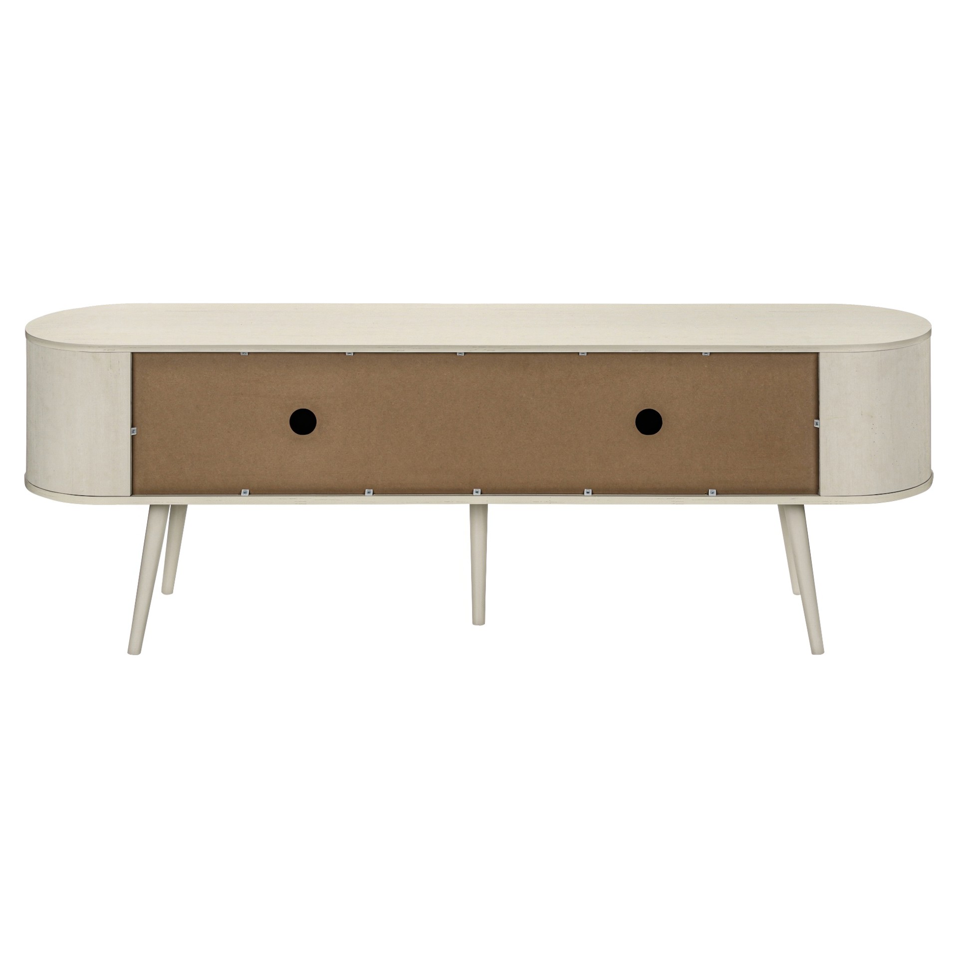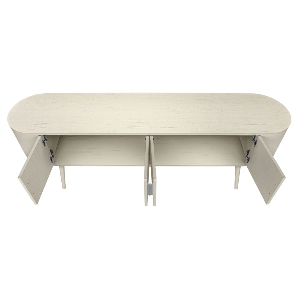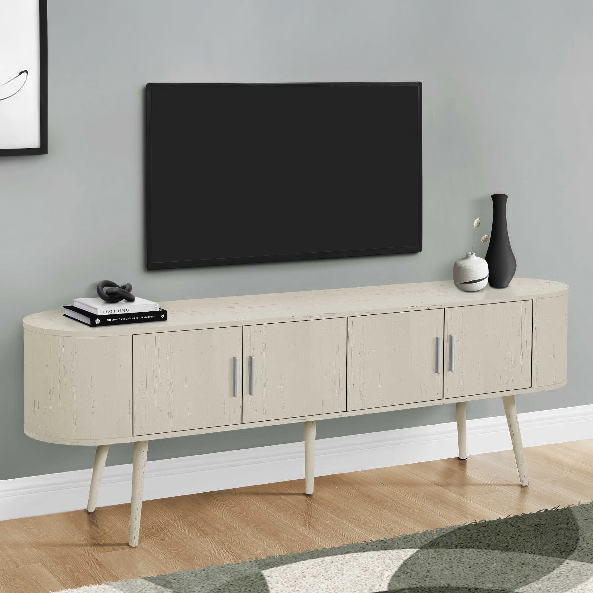 Keep your living room organized with spacious 4 door storage cabinets with sleek handles in silver, and two hidden cable management holes to keep unsightly wires out of sight. The curved sides bring a contemporary and mid-century flair to this tv stand, making it the perfect addition to your bedroom or living room.