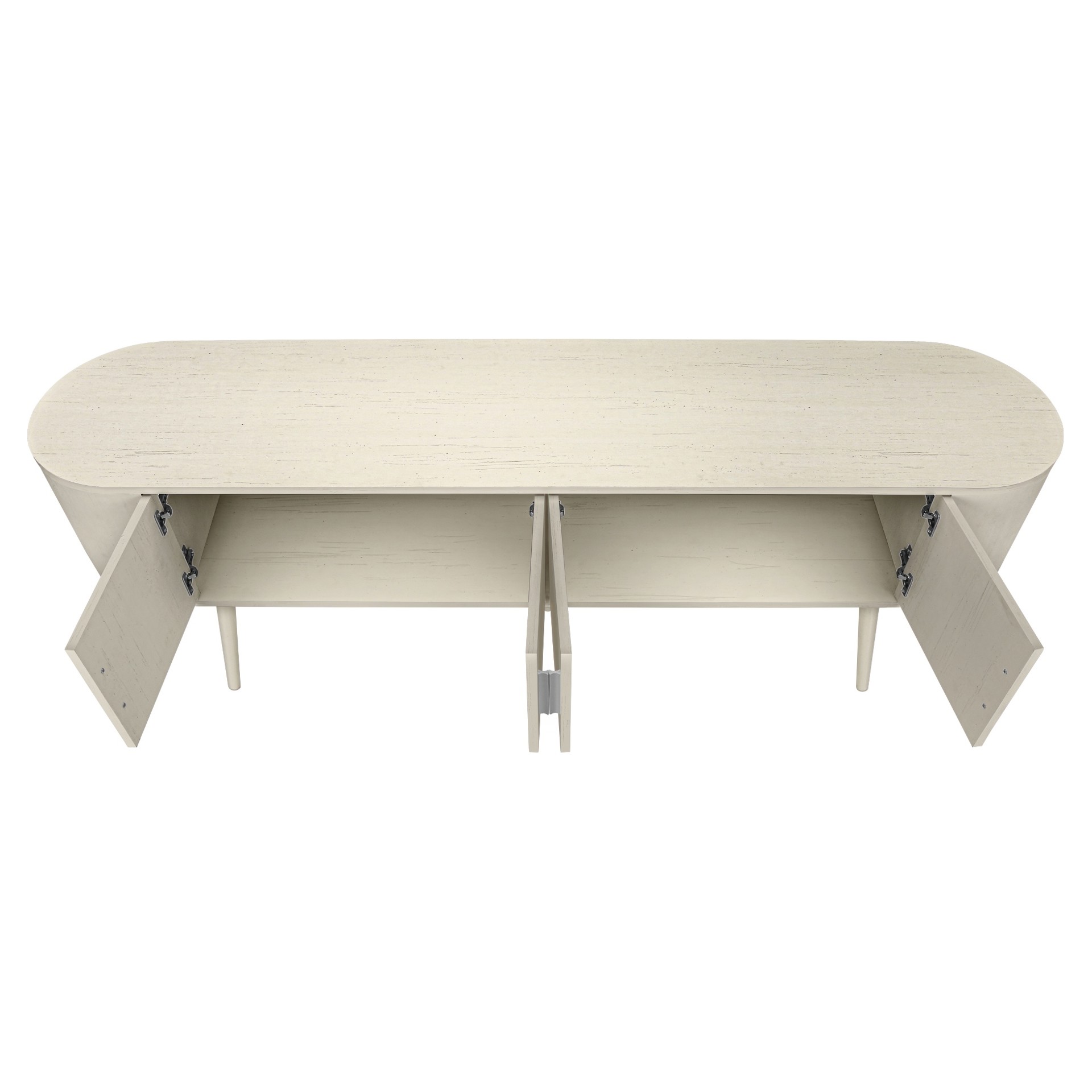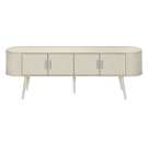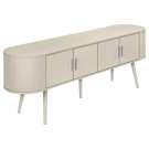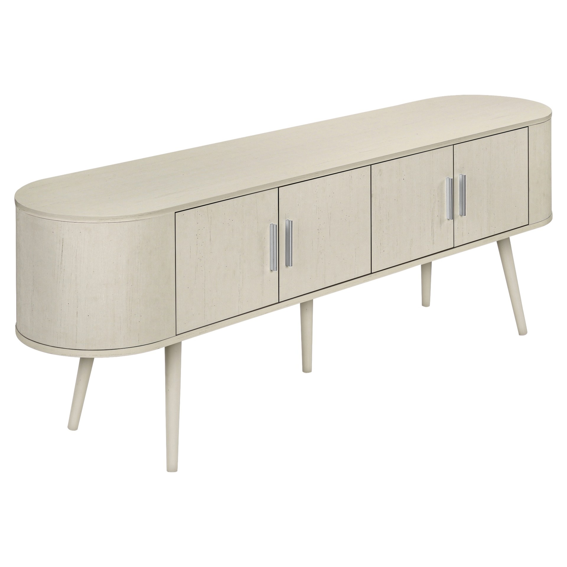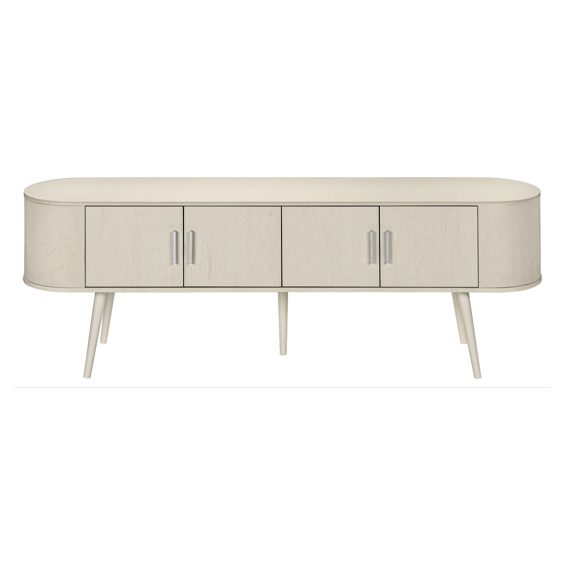 Keep your living room organized with spacious 4 door storage cabinets with sleek handles in silver, and two hidden cable management holes to keep unsightly wires out of sight. The curved sides bring a contemporary and mid-century flair to this tv stand, making it the perfect addition to your bedroom or living room.