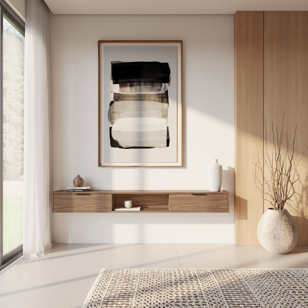 Mounted above the floor, it creates an airy, streamlined look that opens up any room. Ideal in living rooms, entryways, or home offices, it balances form and function with quiet elegance.