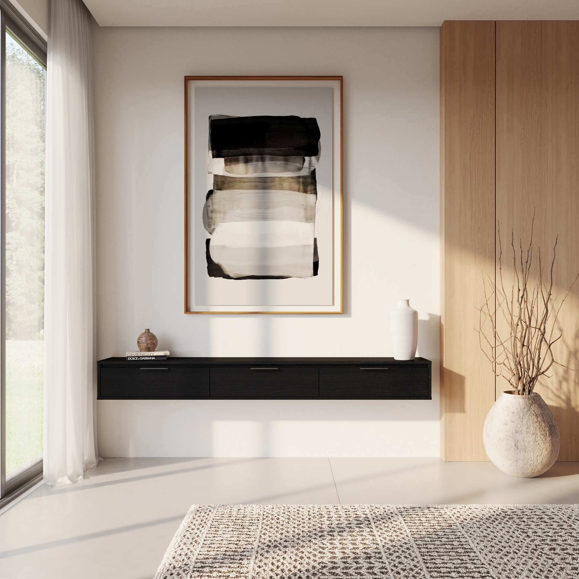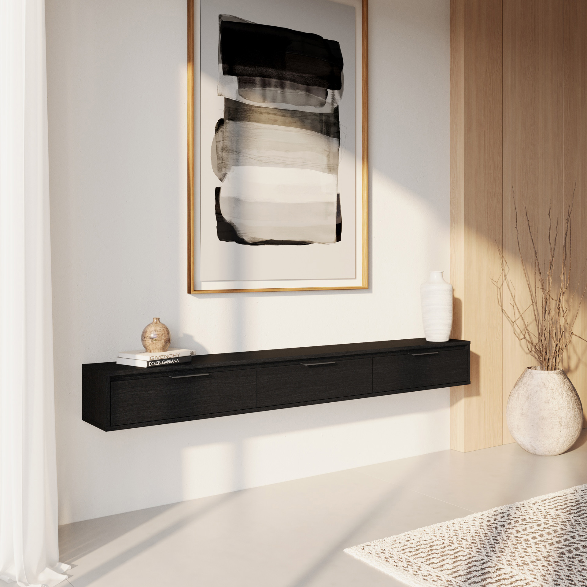 This modern floating console brings a minimalist, practical touch to any room.
