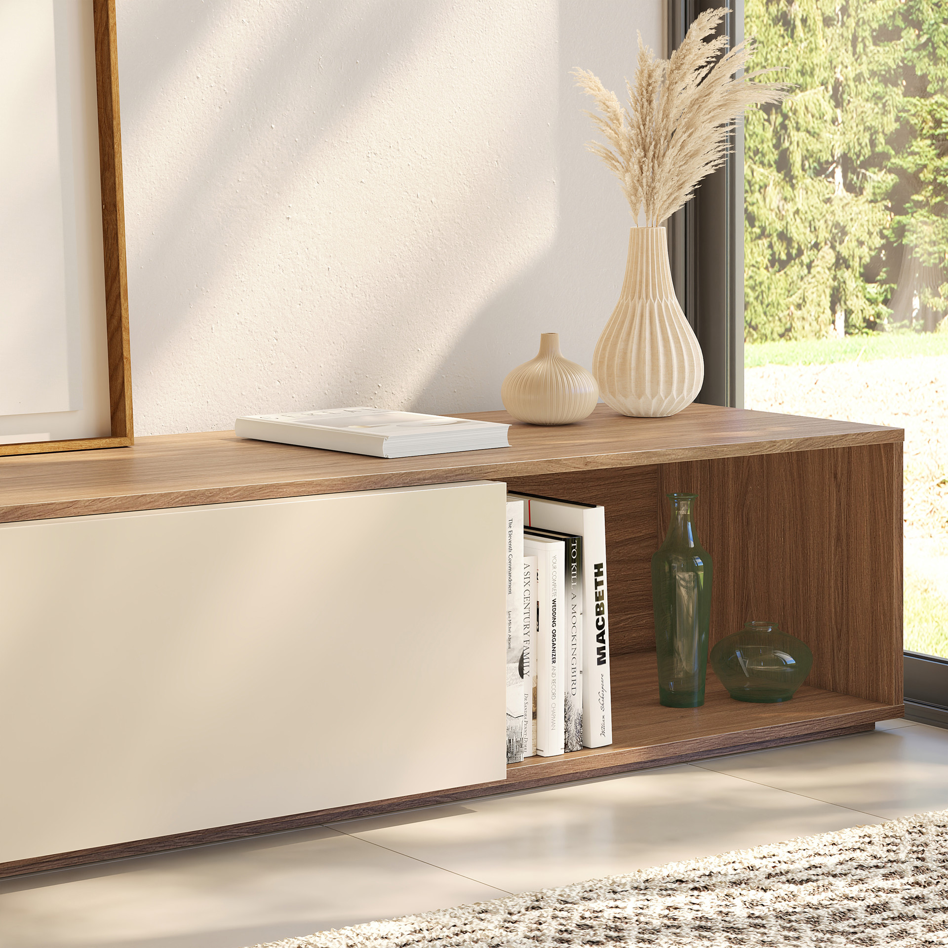 Its low, streamlined profile creates a calm, contemporary presence, while the textured wood-look finish adds depth and character.