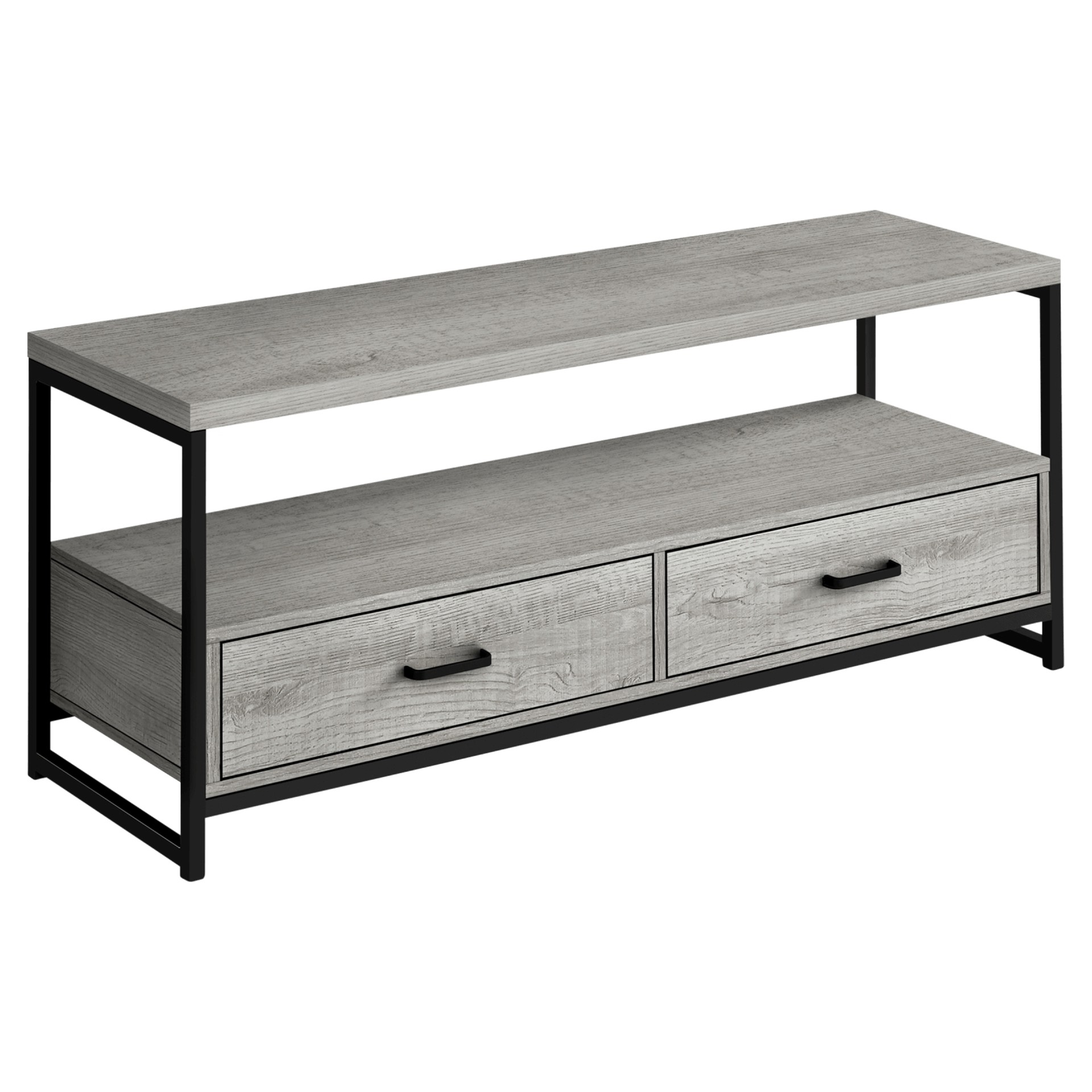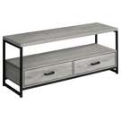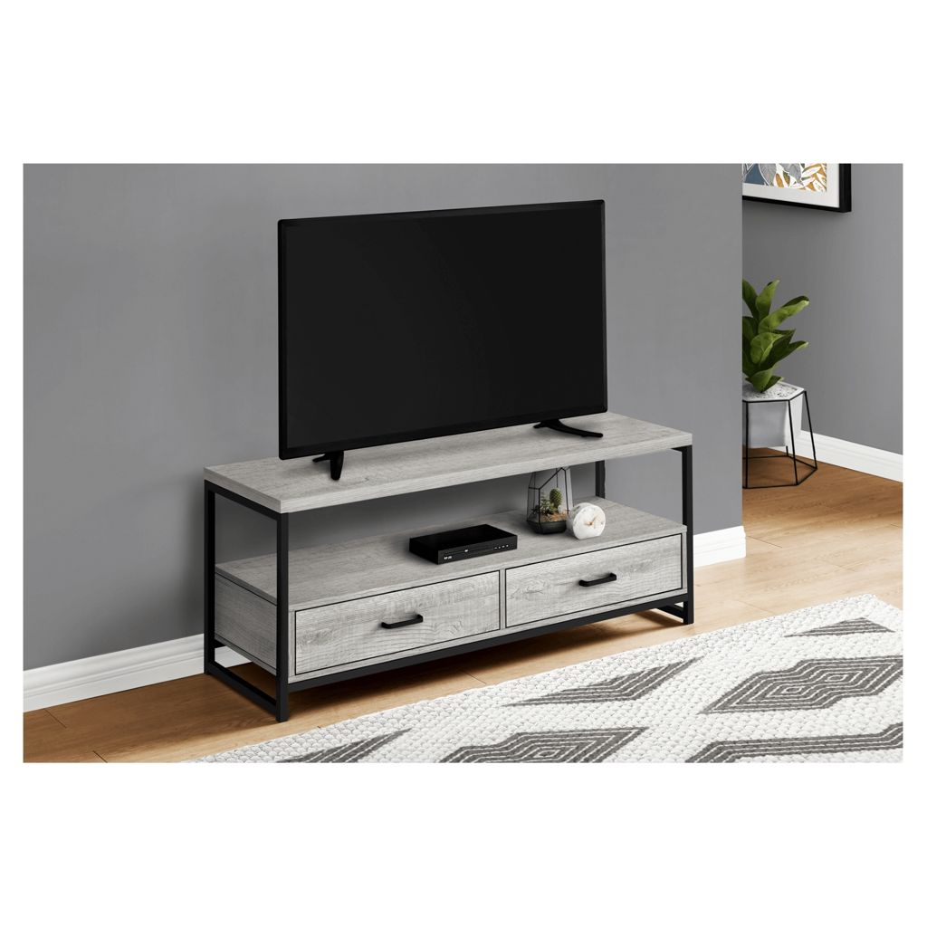 This 48-inch TV stand in a grey wood-look finish with a black metal frame accommodates most TVs when centered on the top shelf. Its 2 tiers open-concept design and 2 drawers with metal slides offer plenty of storage space for entertainment center equipment.