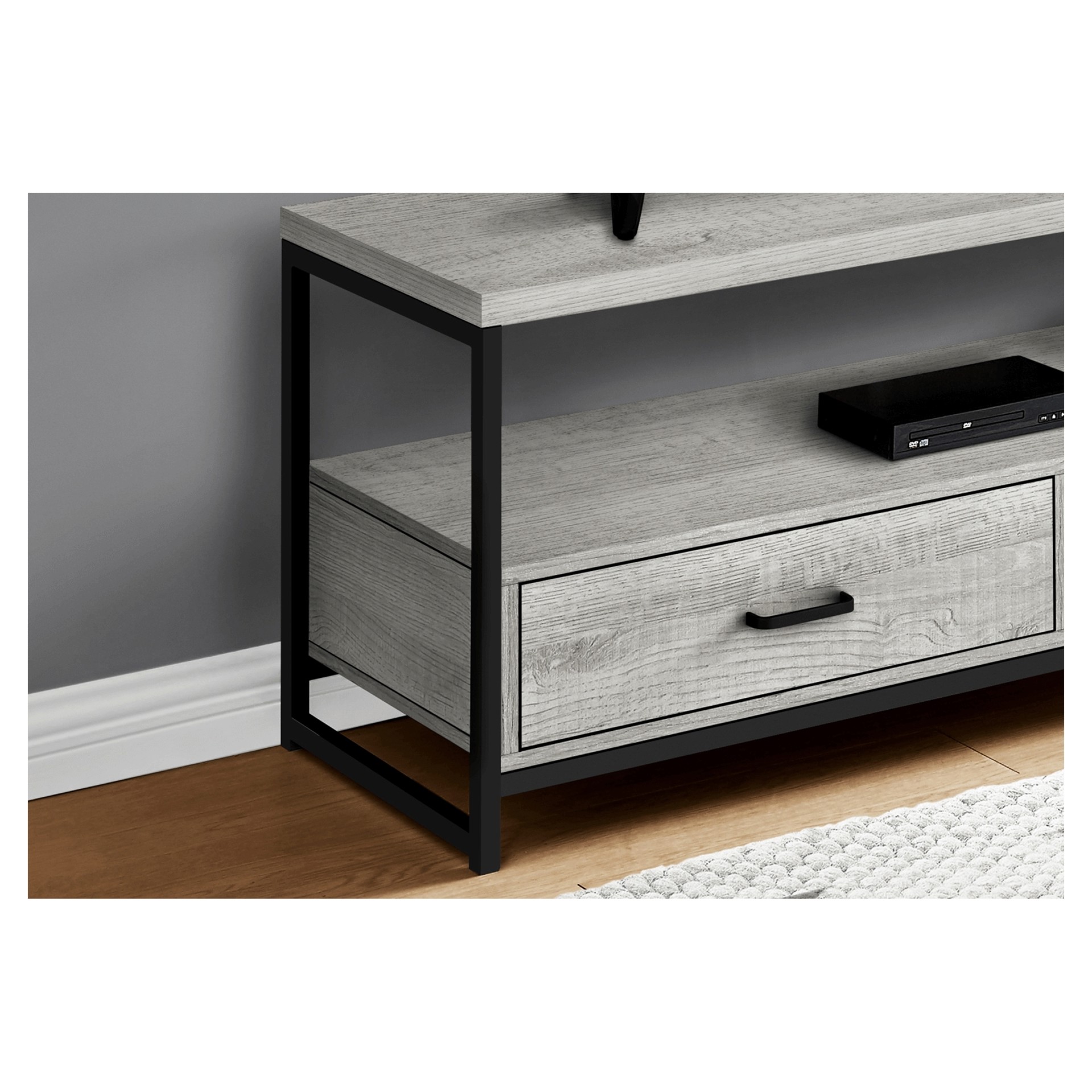 The shelves and drawers in a grey wood-look finish are supported by a sleek black metal frame that gives the TV stand a modern look. With its space-saving design, this media console is a great choice for a living room or bedroom in an apartment, condo, or small home.