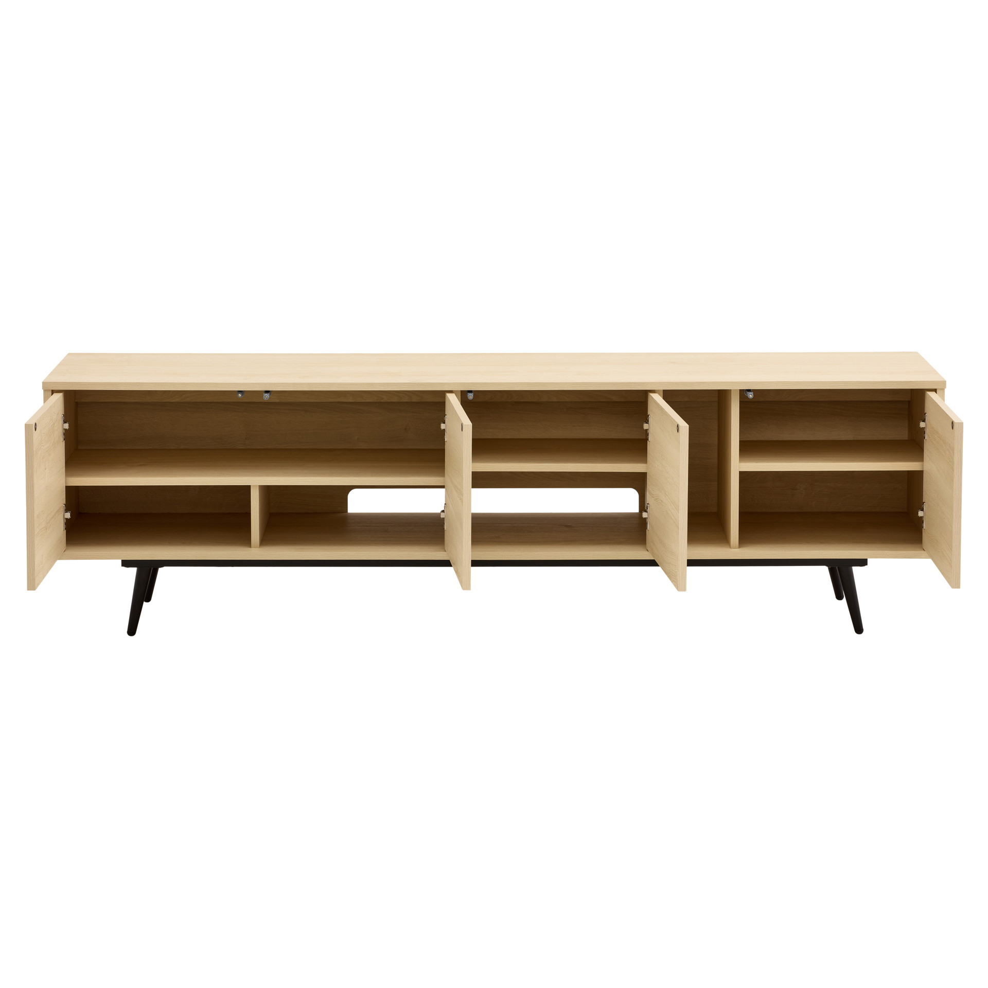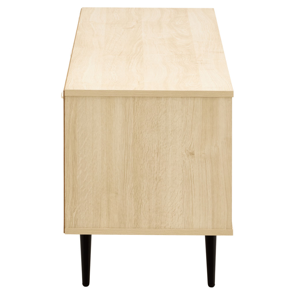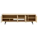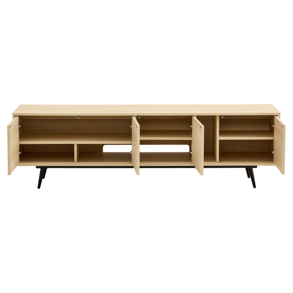 Designed to make your life easier, this piece says goodbye to tangled cables with a cable management hole accessible from two compartments. It also features adjustable shelves, ample closed space, and a vertical open compartment for everything that needs to be within easy reach. Supporting televisions up to 75" and with legs at only 2 ends, it's as sturdy as it is stylish.