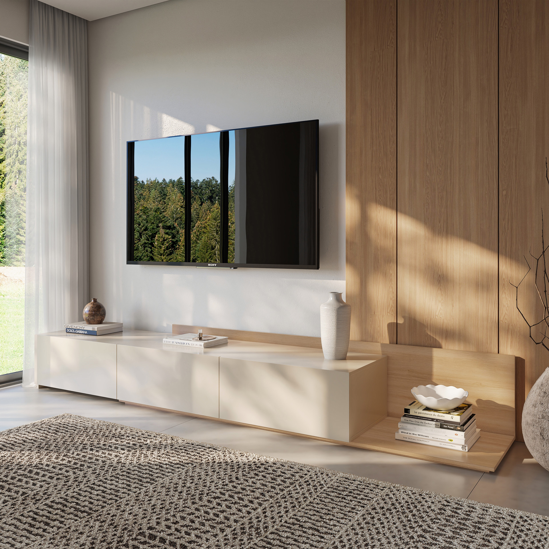 Its low, streamlined profile creates a calm, contemporary presence, while the textured wood-like finish adds depth and character.