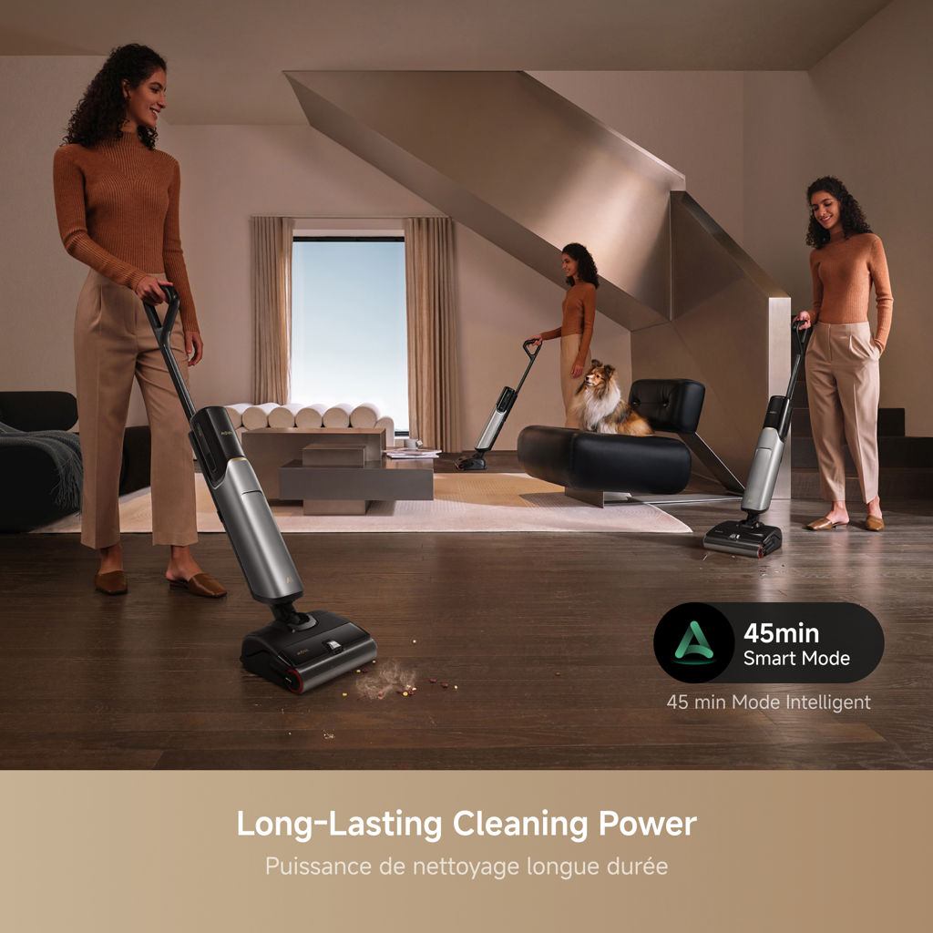 The roller brush is rinsed with 100°C hot water to eliminate tough residue, then dried with 90°C hot air. This dual-action cycle leaves the brush soft, odor-free, and hygienic for the next use. With fast 90°C drying and two drying modes (5-minute quick dry or 15–30 minute silent dry), your space is ready in no time.