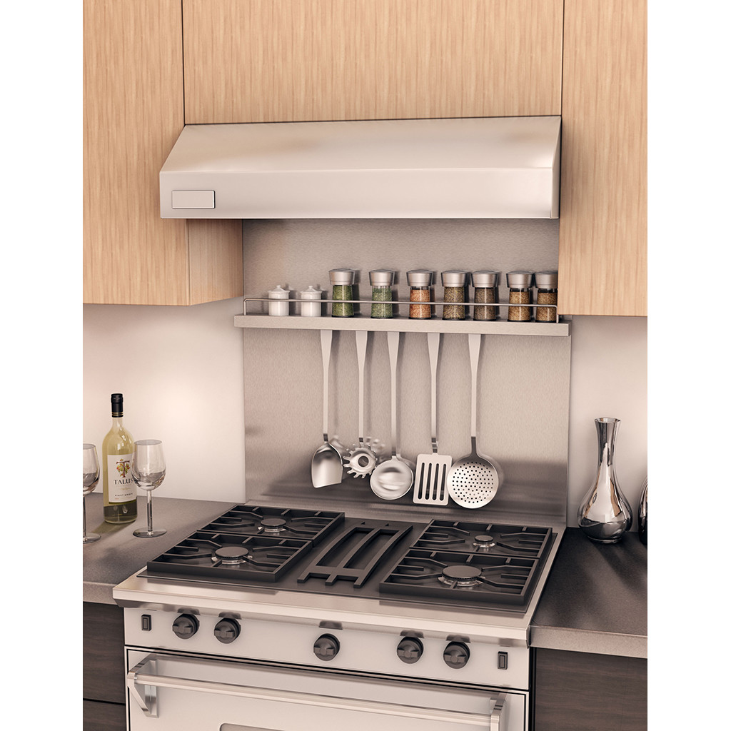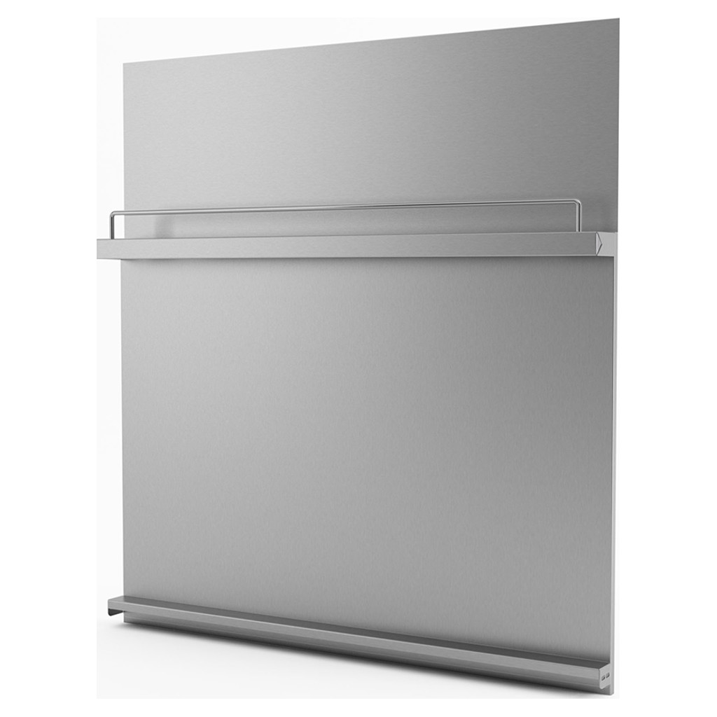 Stainless steel backsplash 304 #4. 30 inches. Adjustable height. Quick and easy installation on almost any surface. Ideal for new generation built-in stoves and regular stoves with hood. Includes moulding to close the back of the built-in stoves.