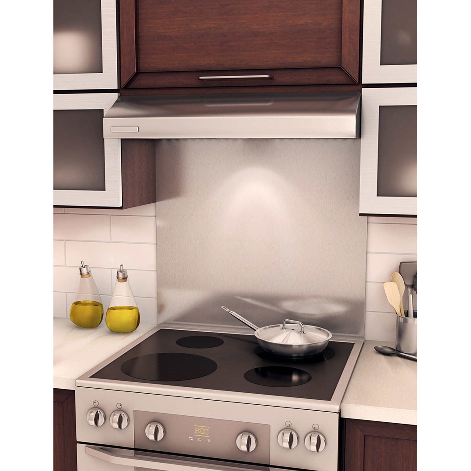 Stainless steel backsplash 304 #4. 30 inches. Adjustable height. Quick and easy installation on almost any surface. Ideal for new generation built-in stoves and regular stoves with hood. Includes moulding to close the back of built-in stoves.