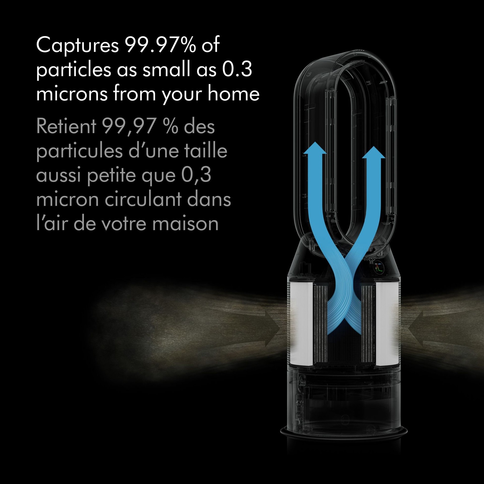 • The sealed HEPA filter is made from borosilicate microfibres, pleated hundreds of times, to capture 99.97% of ultrafine particles.* While the activated carbon filter removes gases and odours